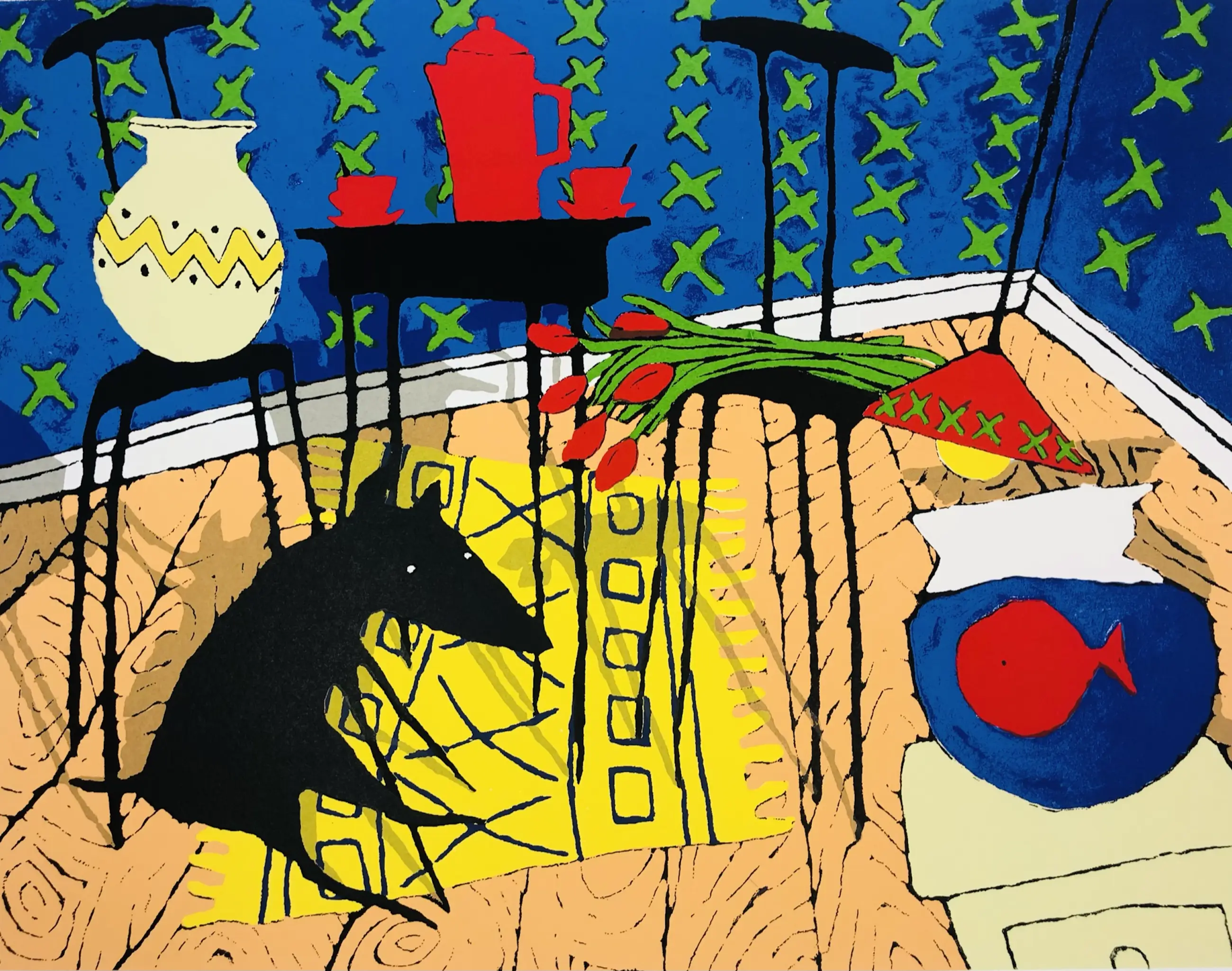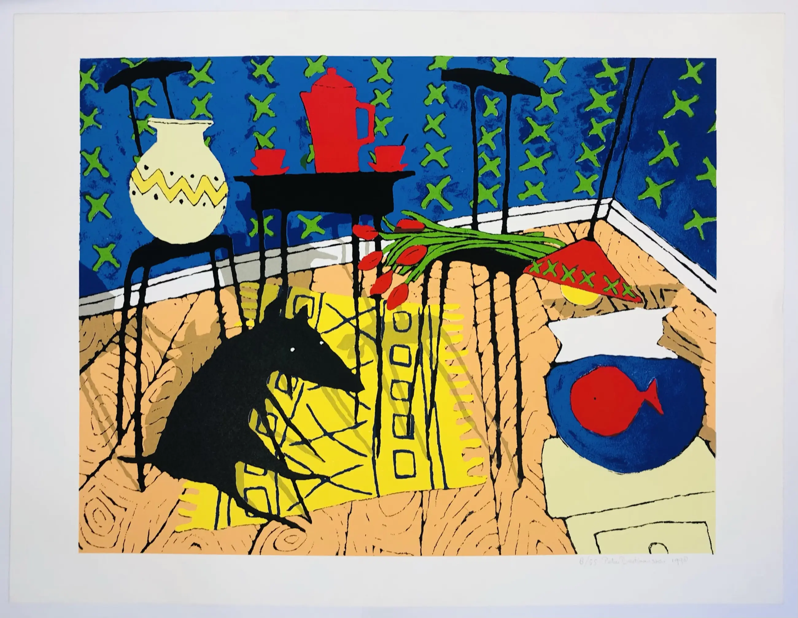 Fraaie zeefdruk van de Rotterdamse kunstenaar Bastiaanssen. Met zijn handelsmerk de hond ( Art is a dog) weet hij altijd weer humor in zijn werk te betrekken. U kunt het werk vooraf komen beoordelen in onze schatkamer in Gorcum. We kunnen ook uw inlijstingen verzorgen