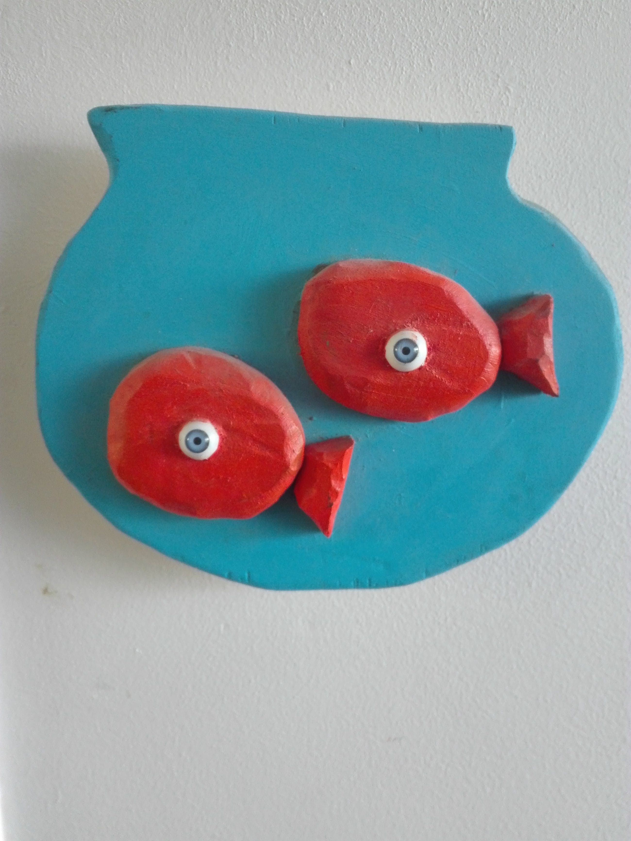 Een diervriendelijke vissenkom, gemaakt van hout en beschilderd met acrylverf van de hand van Peter Bastiaanssen.