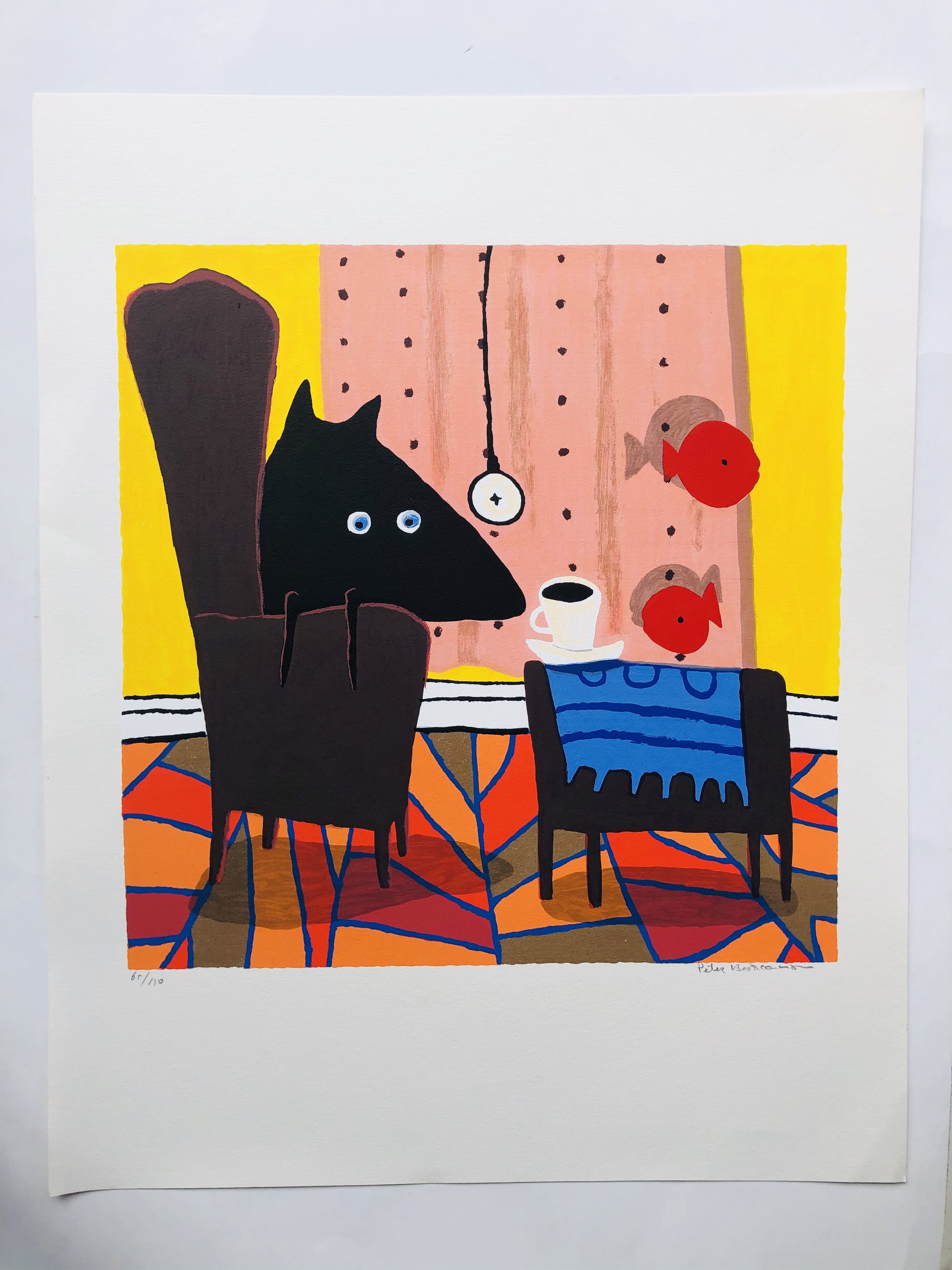 Fraaie zeefdruk van de Rotterdamse kunstenaar Bastiaanssen. Met zijn handelsmerk de hond ( Art is a dog) weet hij altijd weer humor in zijn werk te betrekken.