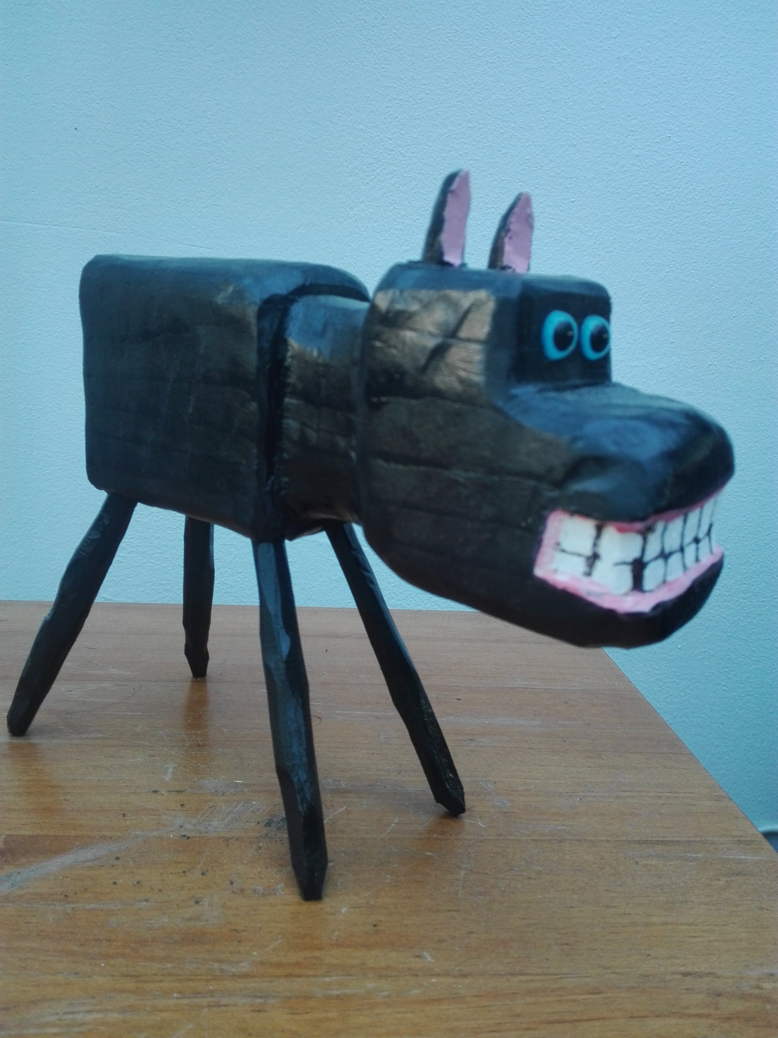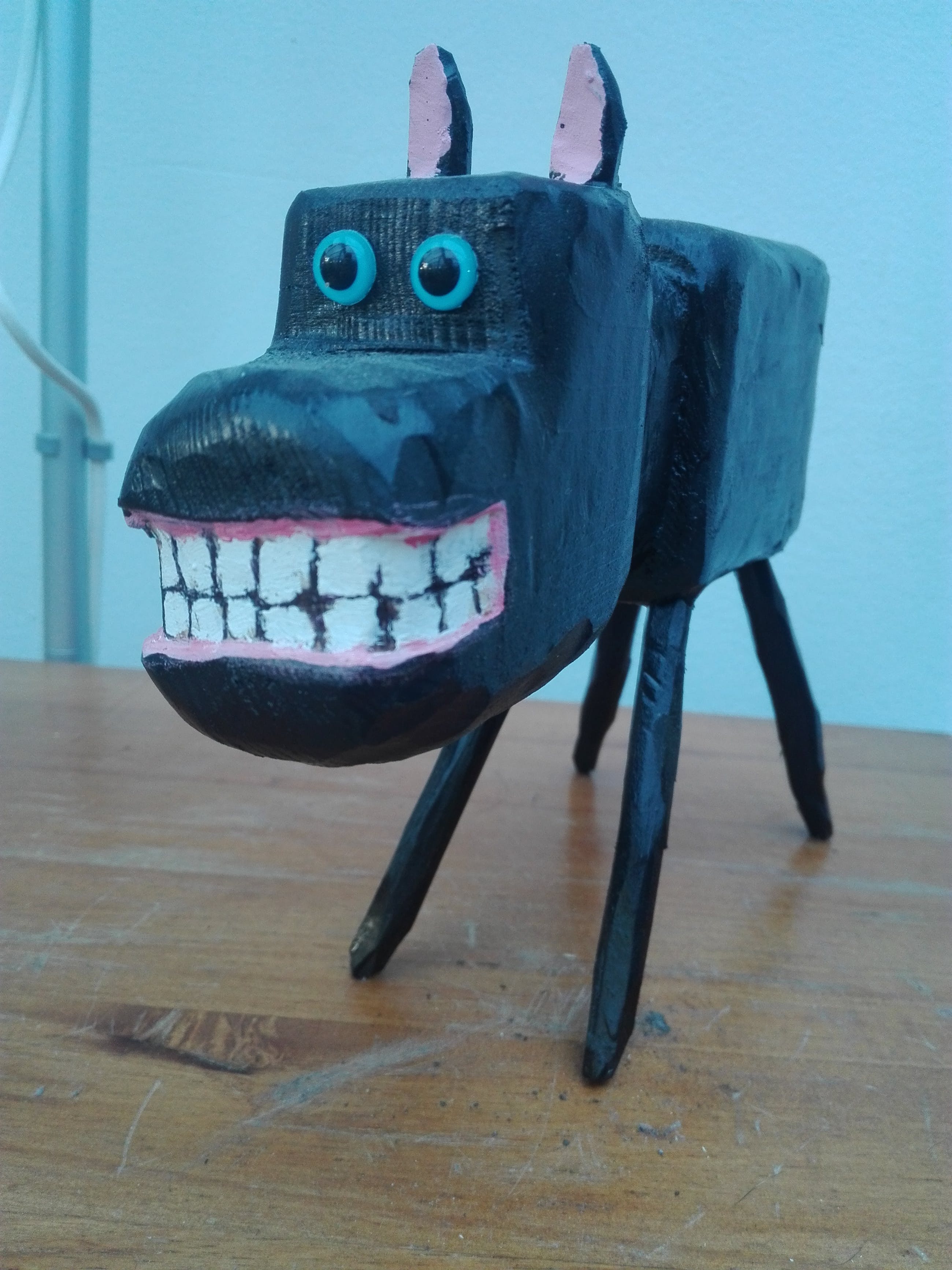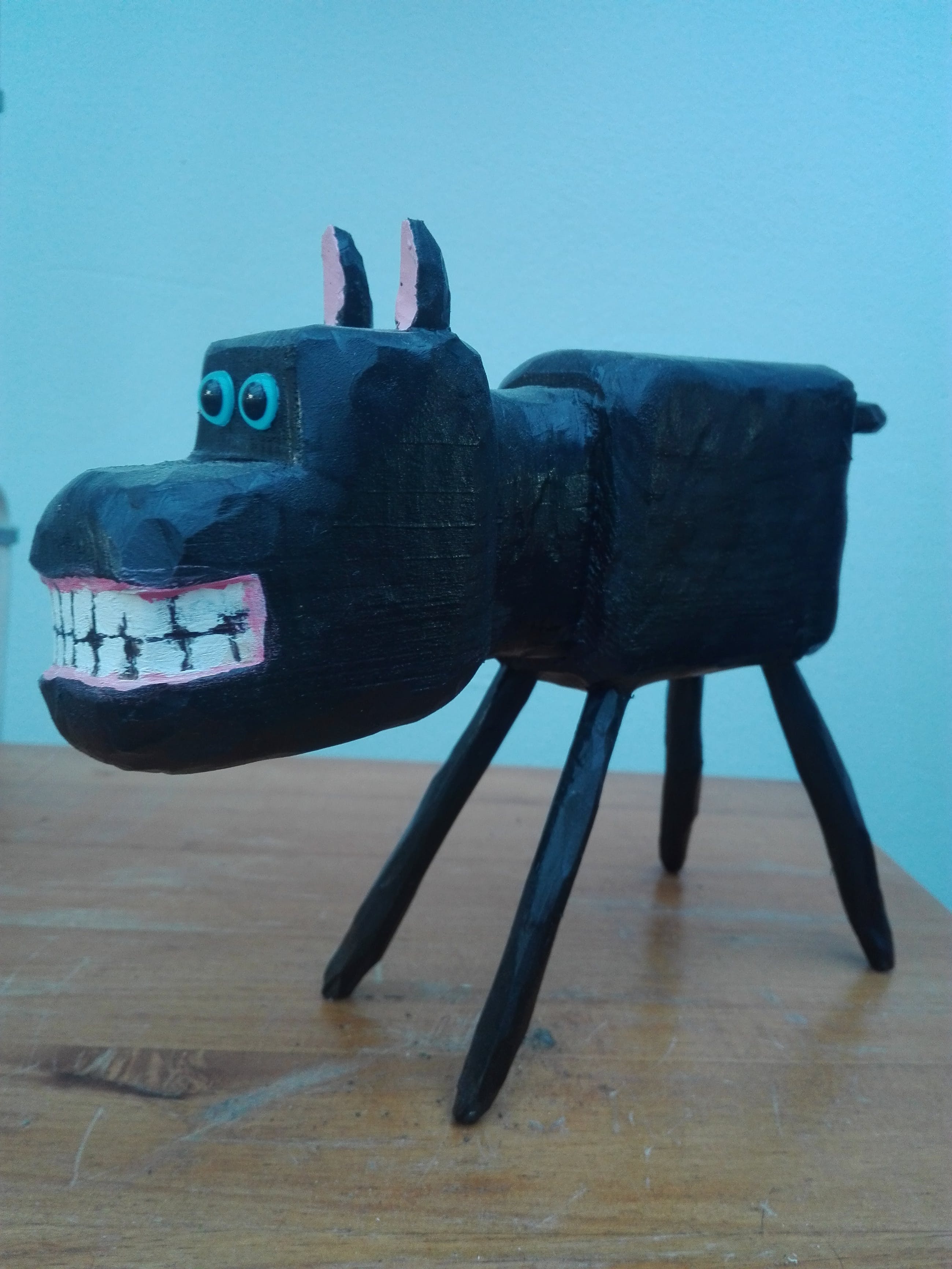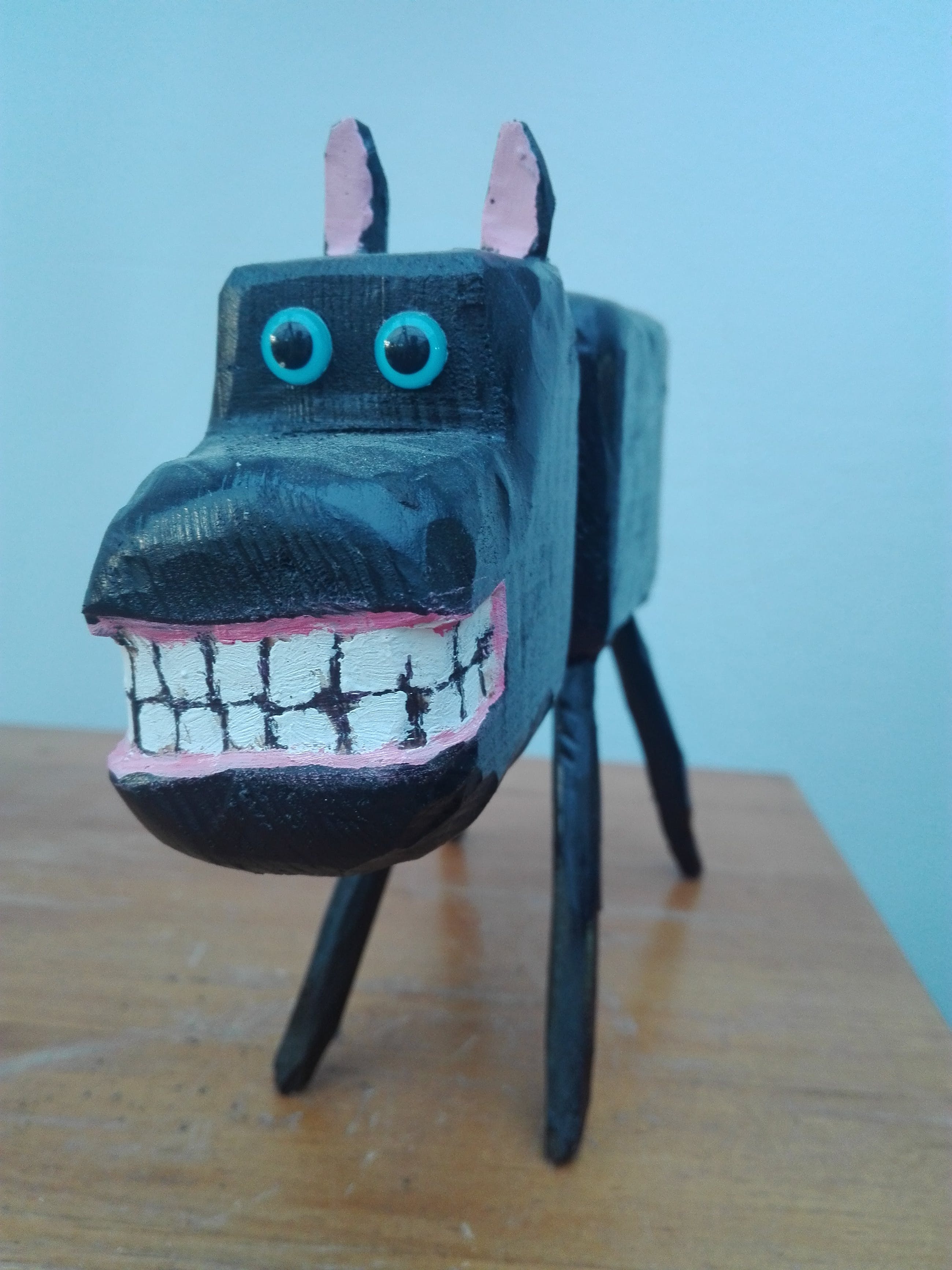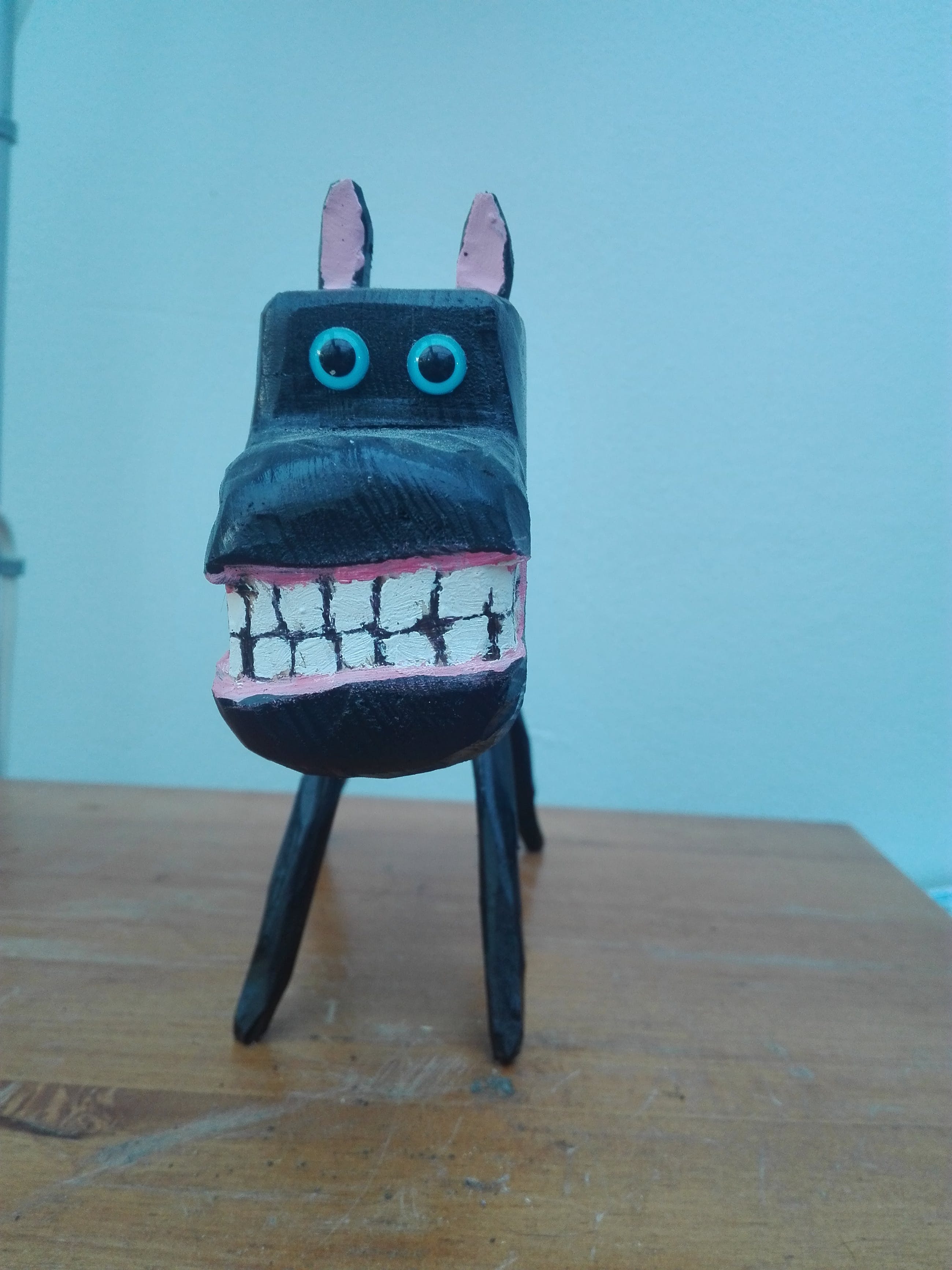 Een handgehakt houten hondje gemaakt door Peter Bastiaanssen. De houten hondjes zijn driedimensionale uitvoeringen van de geschilderde zwarte hond die altijd op de schilderijen van Peter Bastiaanssen te zien zijn sinds 1987.