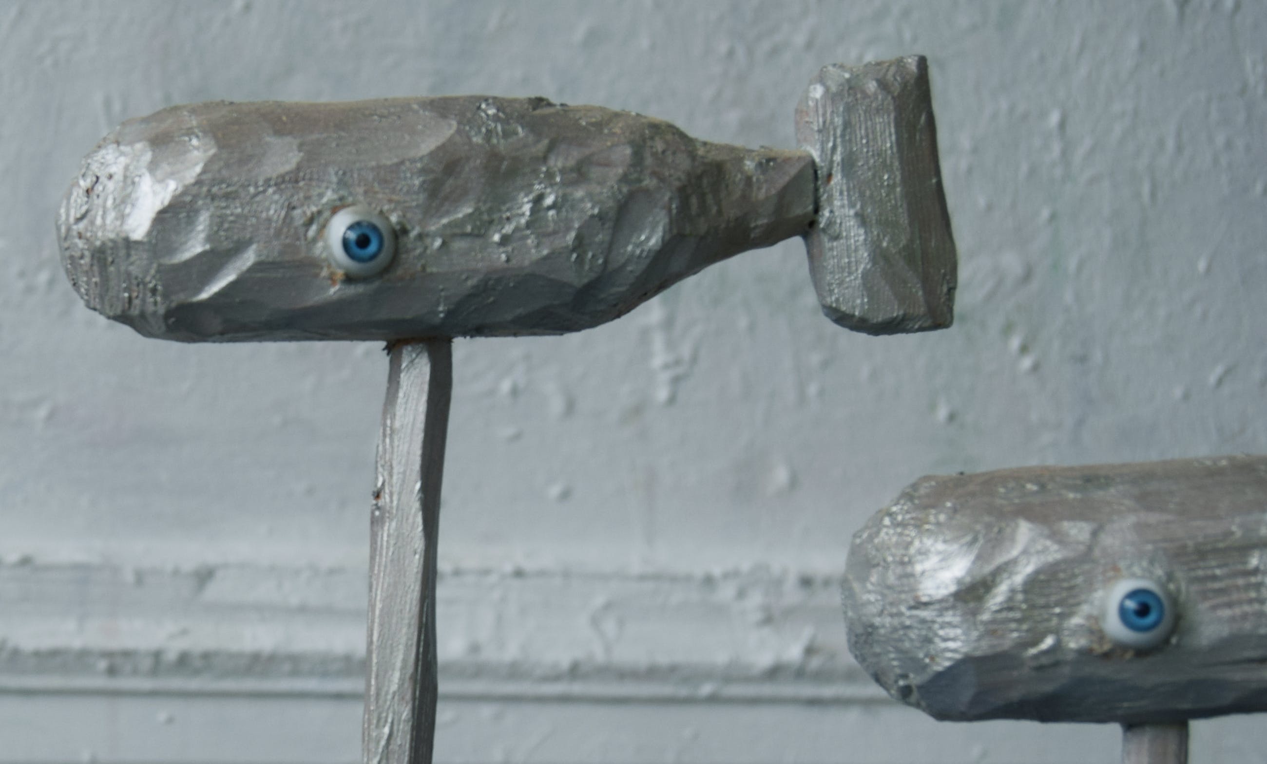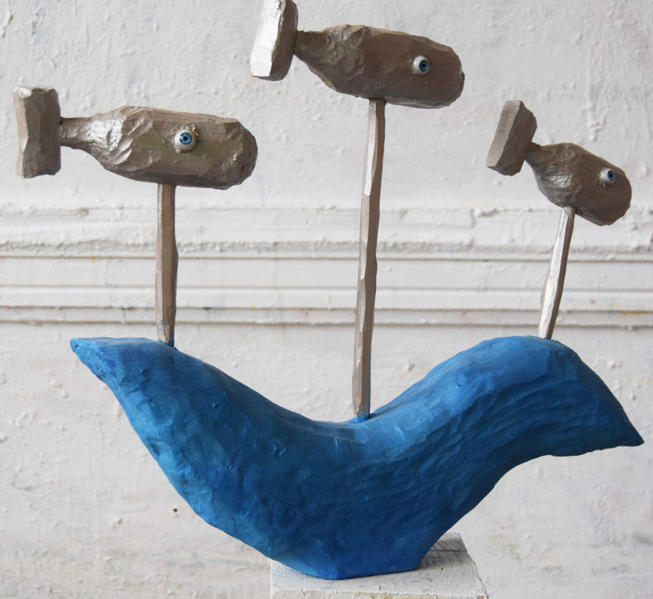Een houten beeld voorstellende vissen op een golf. De vissen hebben poppenogen en zijn gehakt uit hout en beschilderd met acrylverf.