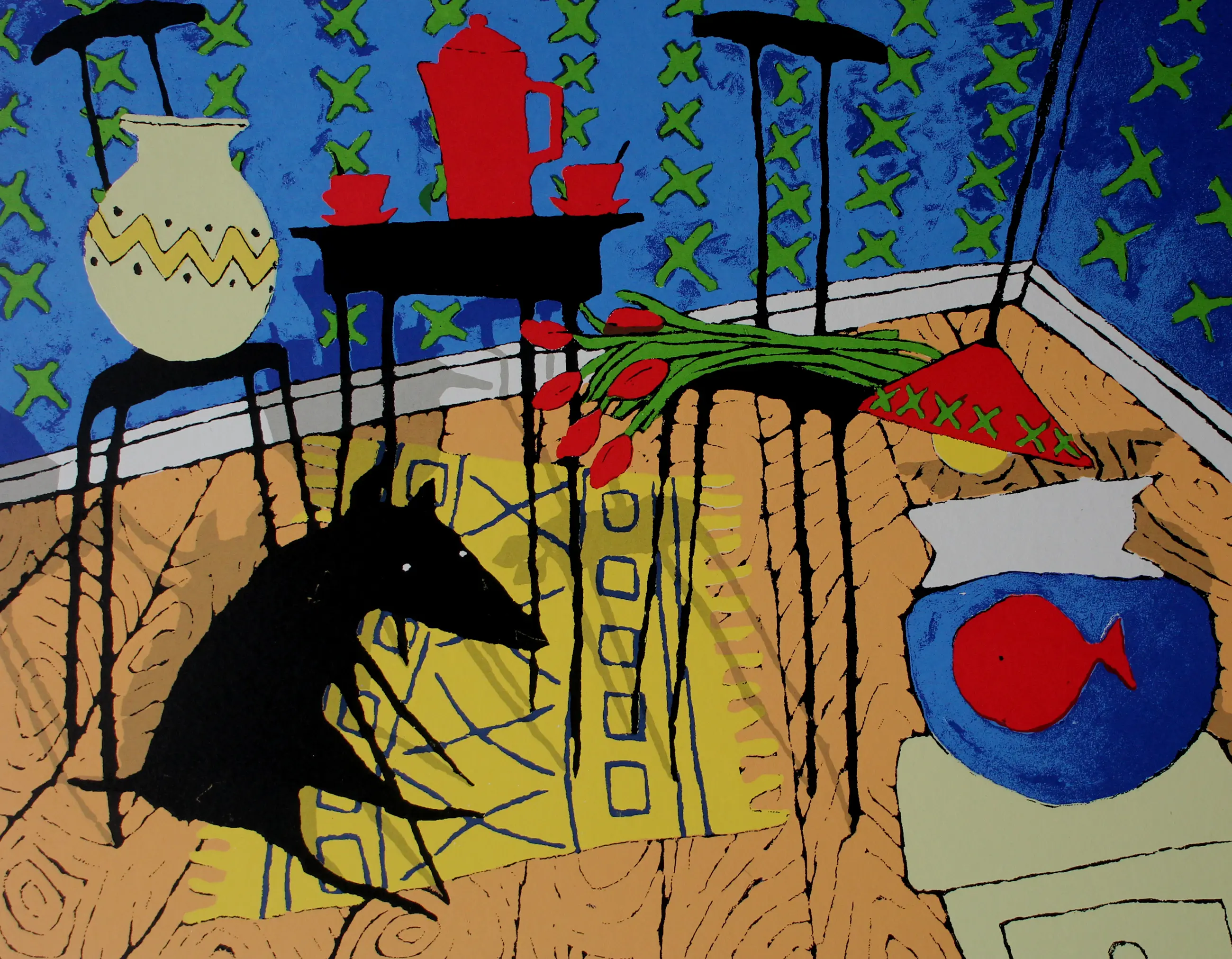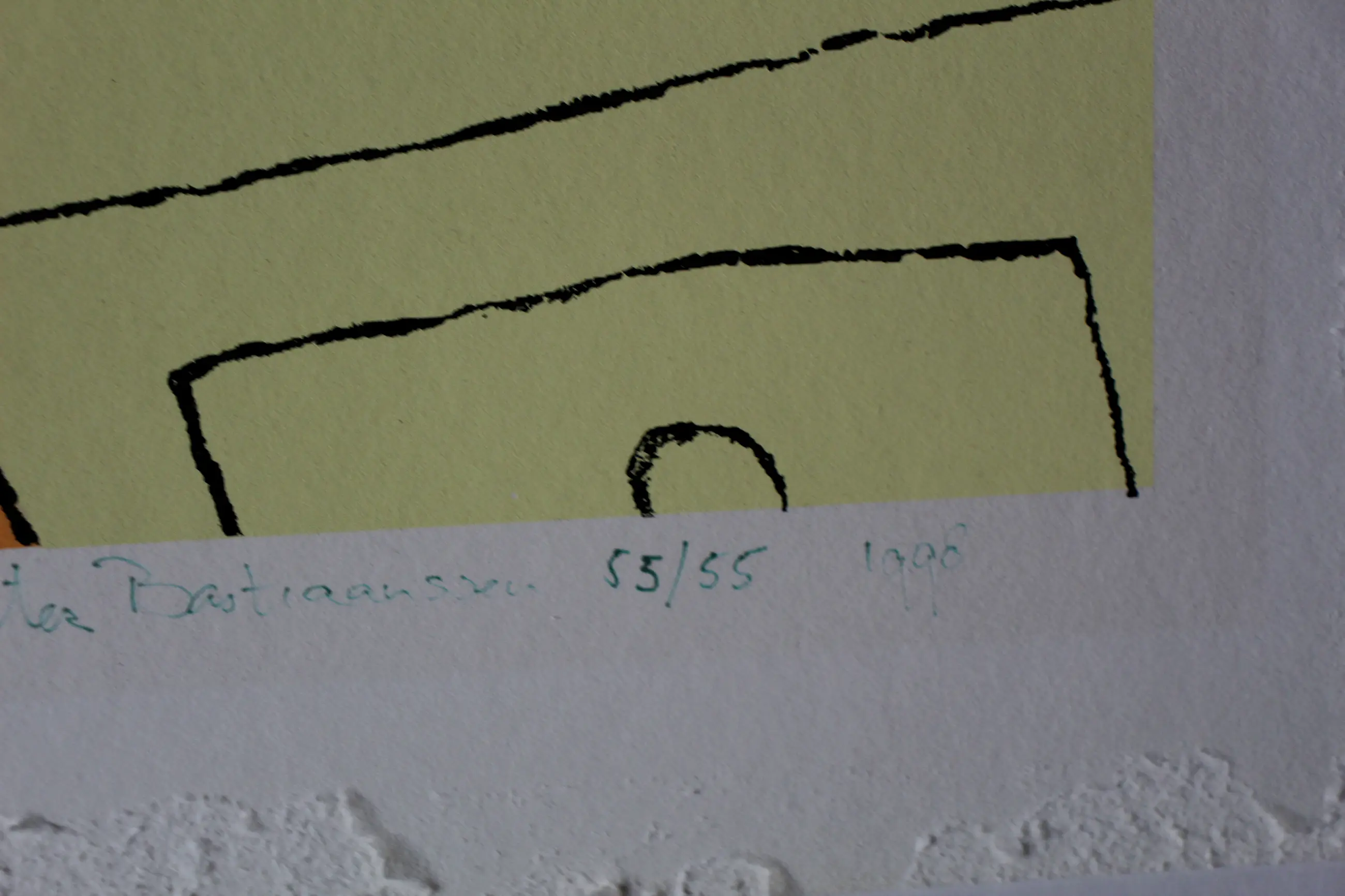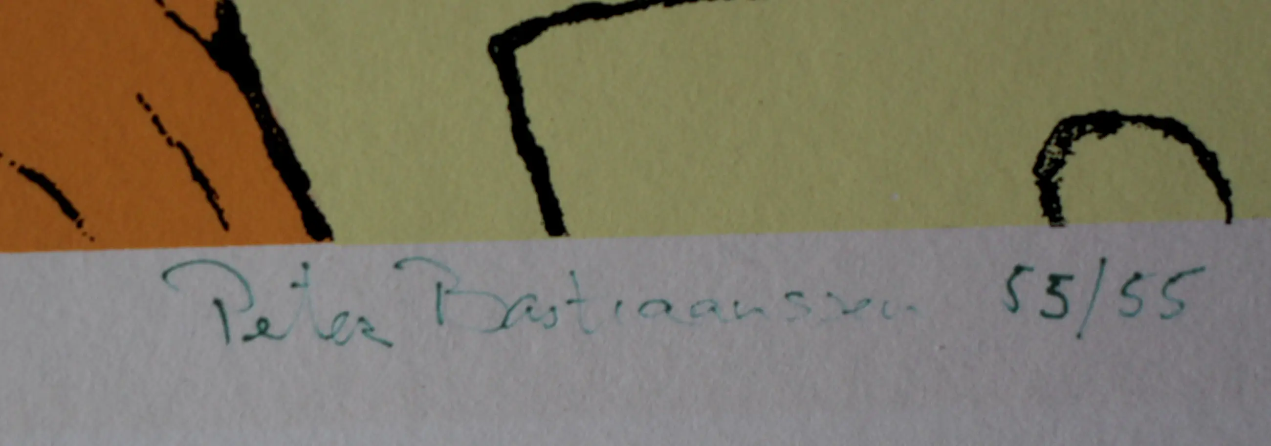 Zeefdruk van Peter Bastiaanssen uit 1990. Titel: "Als de baas van huis is". Oplage: 55/55. Afmetingen op karton: H75 x b90cm. Afmetingen voorstelling: H54 x b70cm. Het werk is rechts onderaan, gesigneerd door de kunstenaar. De authenticiteit van het, aangeboden, werk wordt volledig gegarandeerd. Een certificaat van echtheid kan, op aanvraag, worden gemaild.