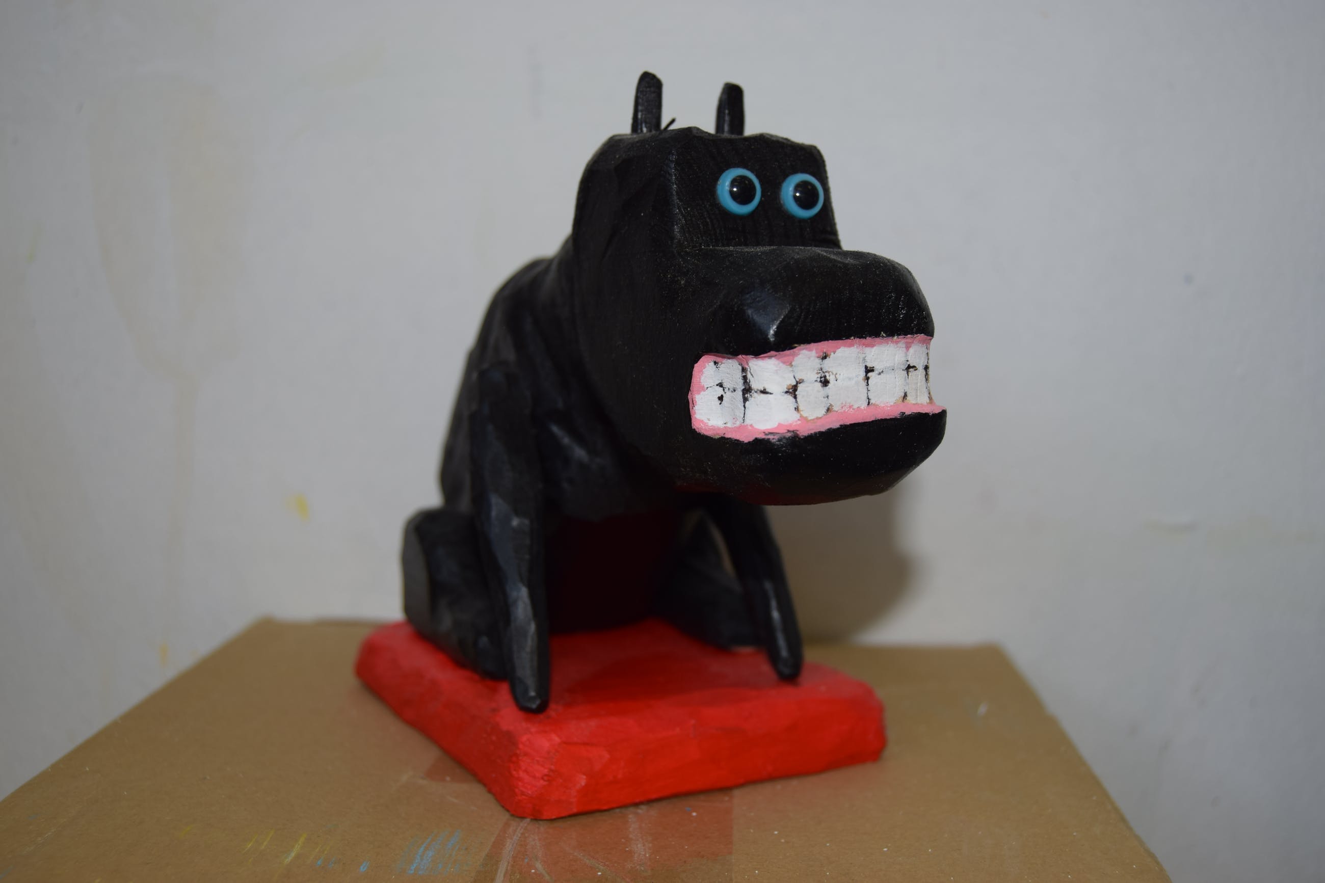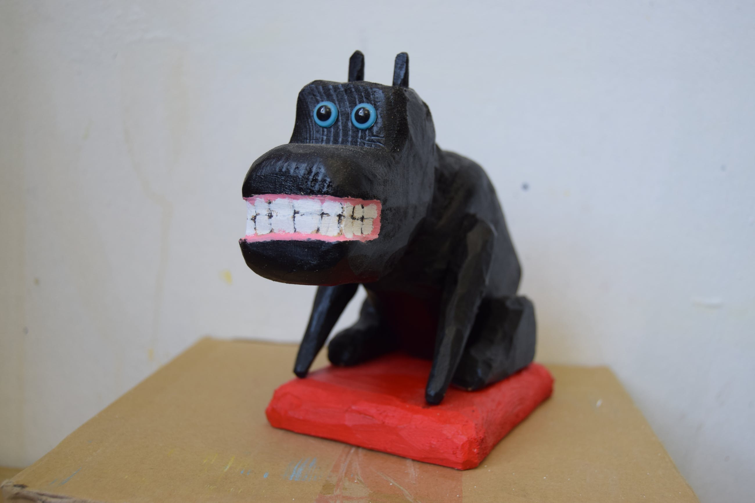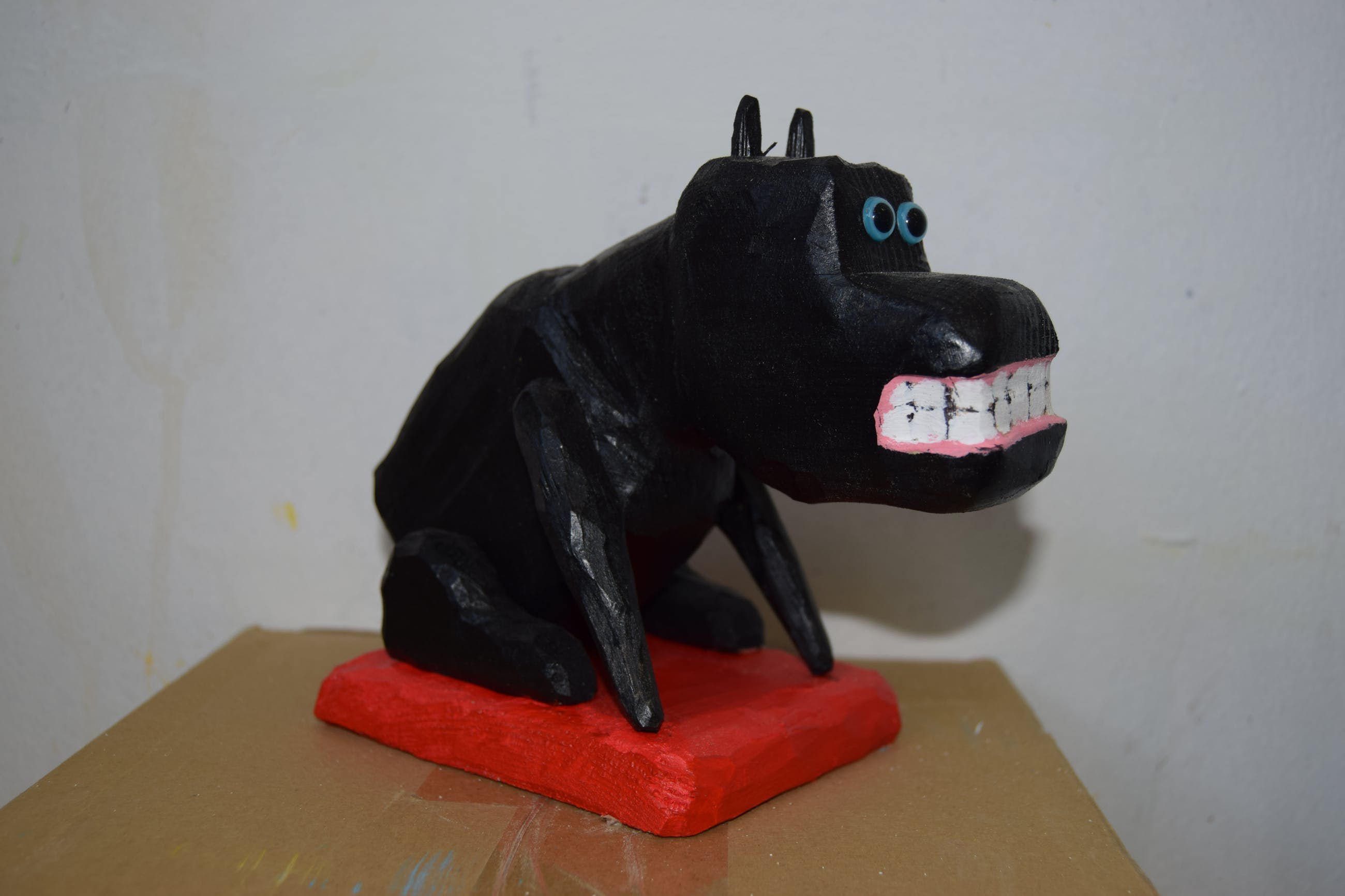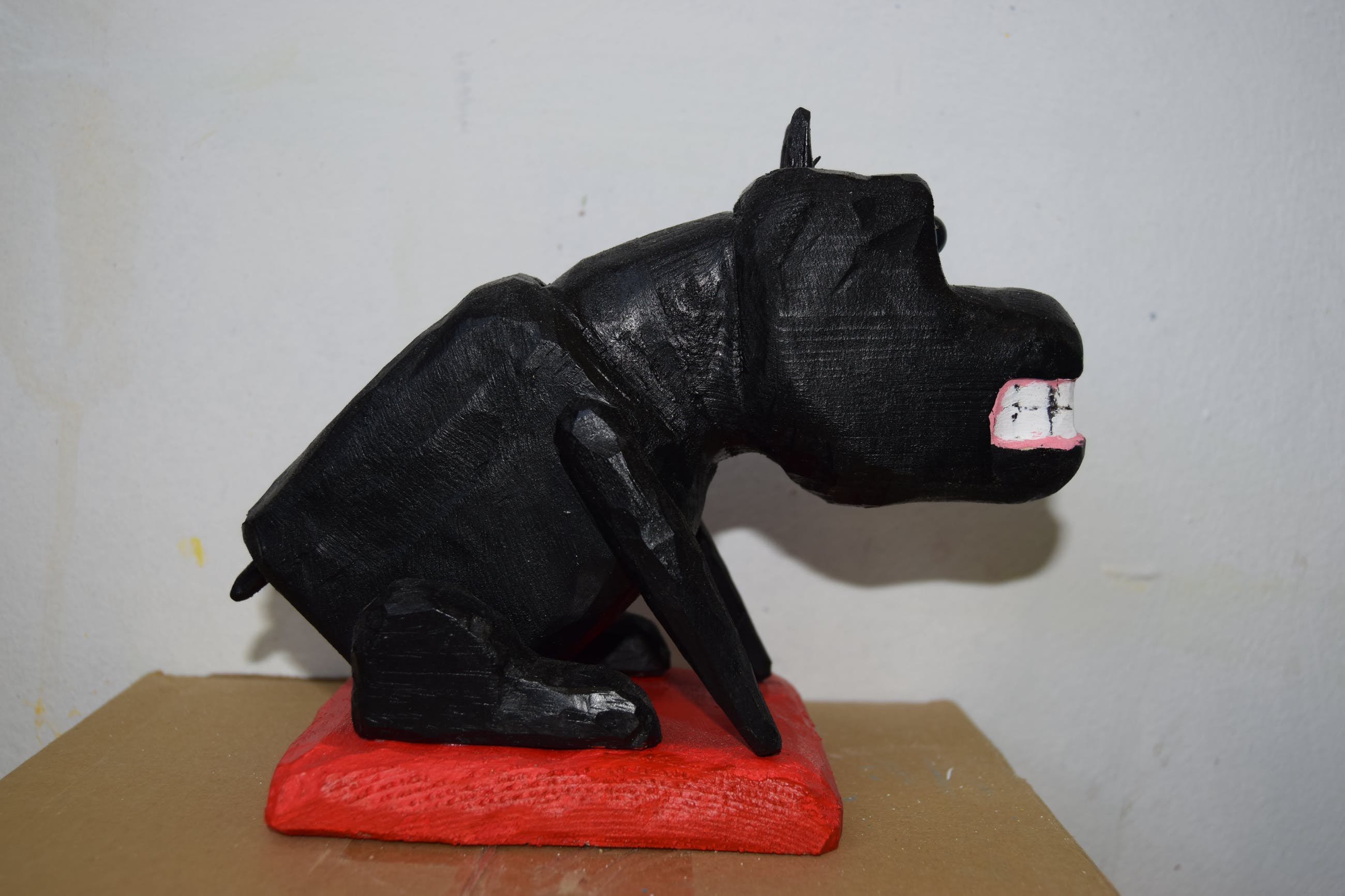 Een uniek houten beeld van de bekende zwarte hond van Peter Bastiaanssen.