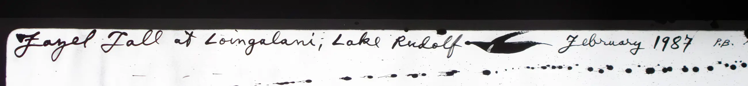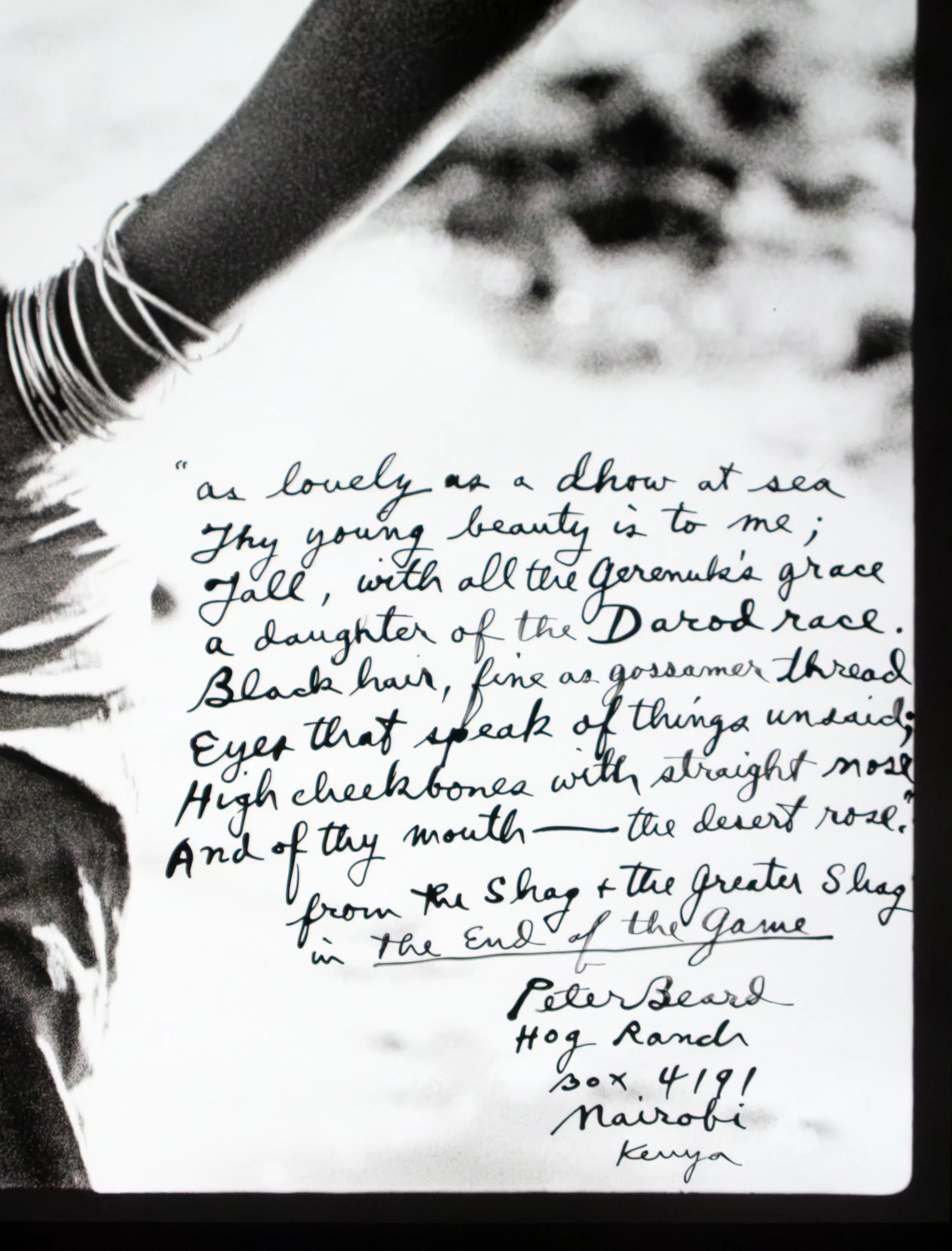 Gedrukte handtekening en handgeschreven aantekeningen door Peter Beard (gedrukt).