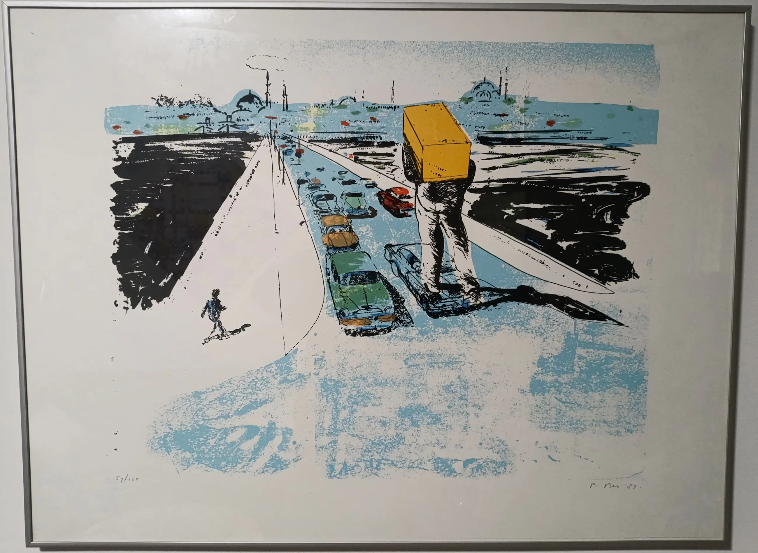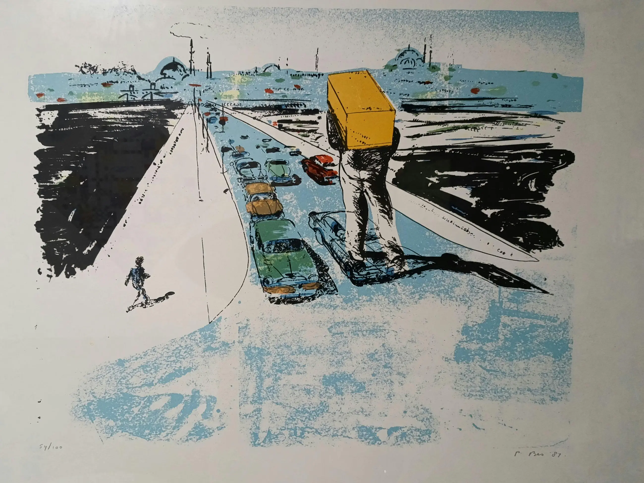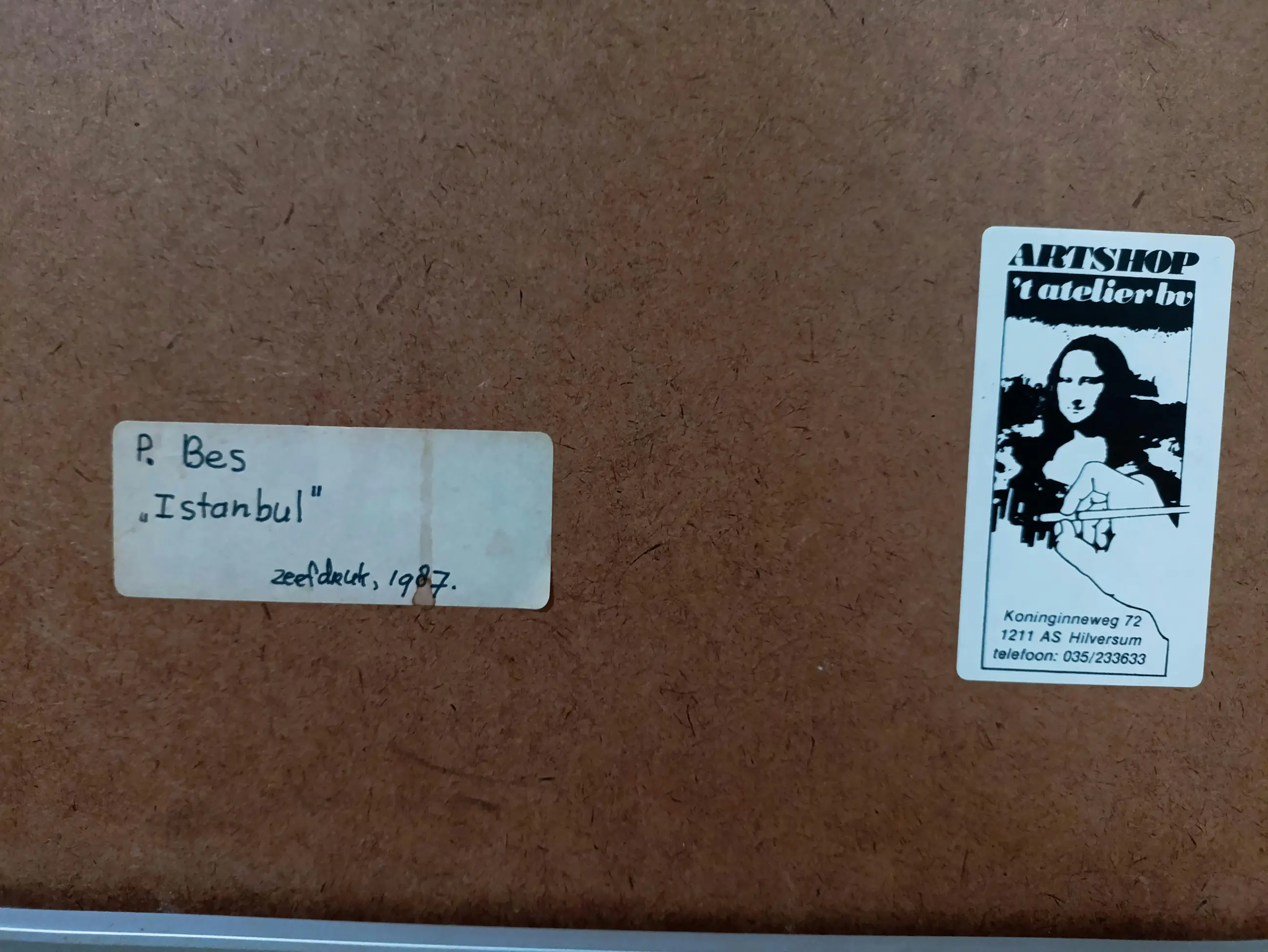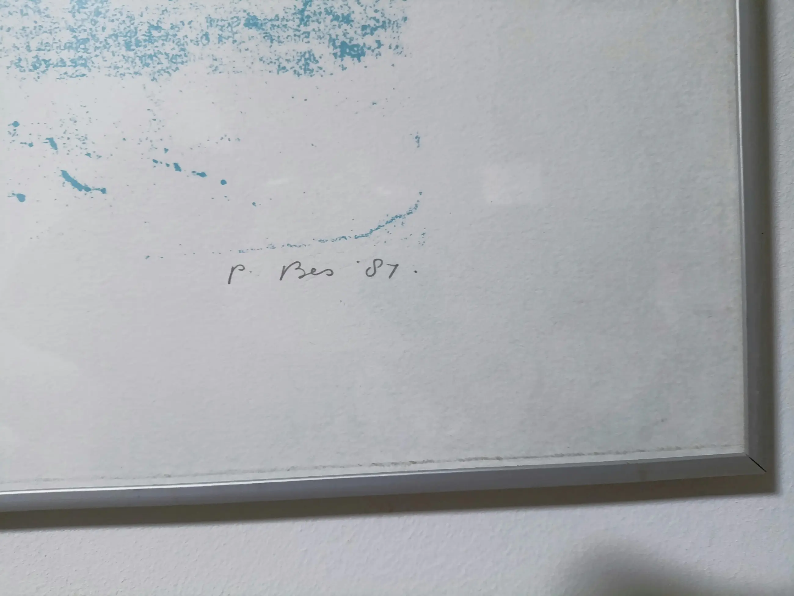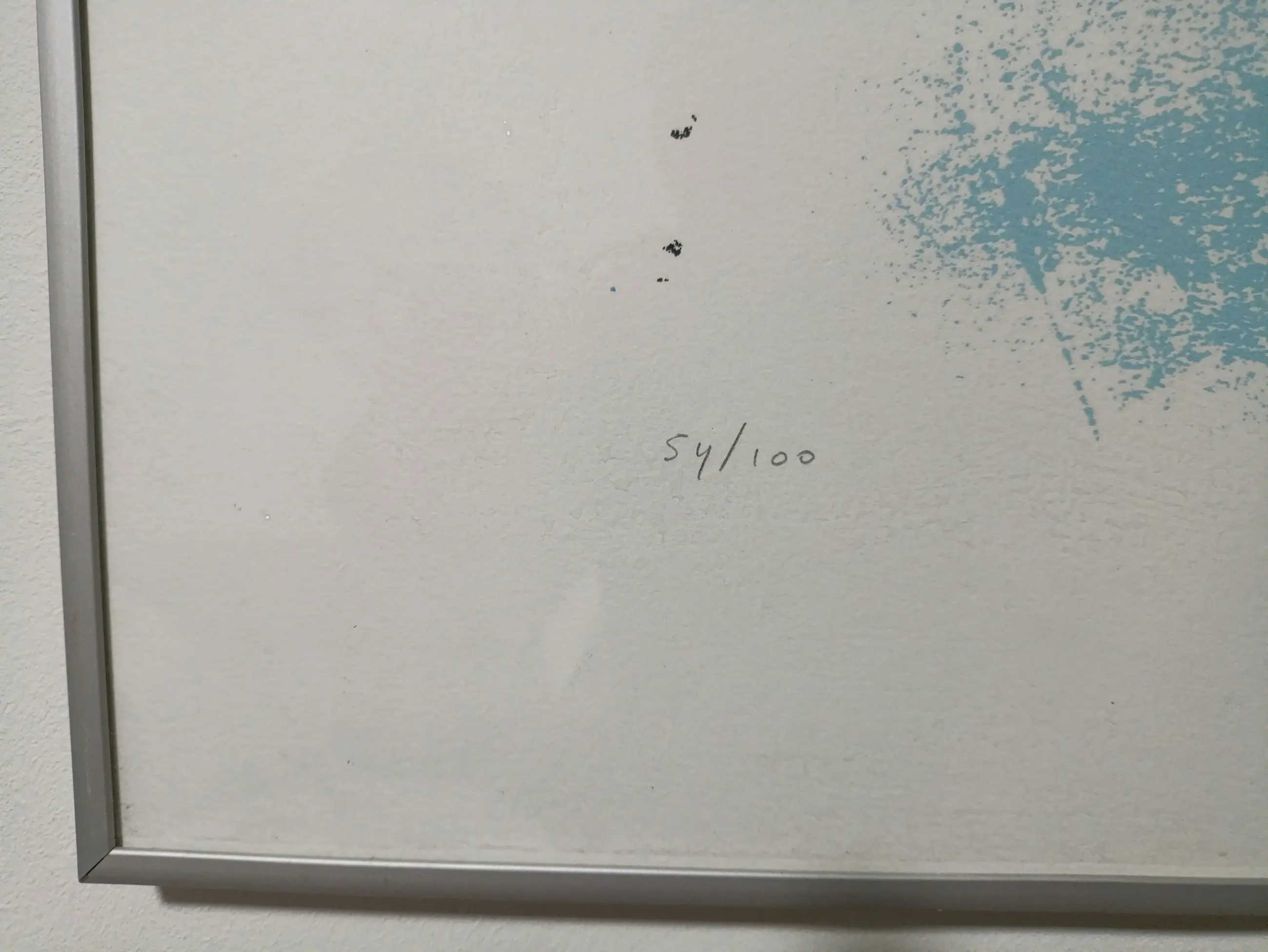 Zeefdruk is in goede staat. Zit achter glas in een aluminium lijst. Heeft de laatste 25 jaar op zolder gestaan.