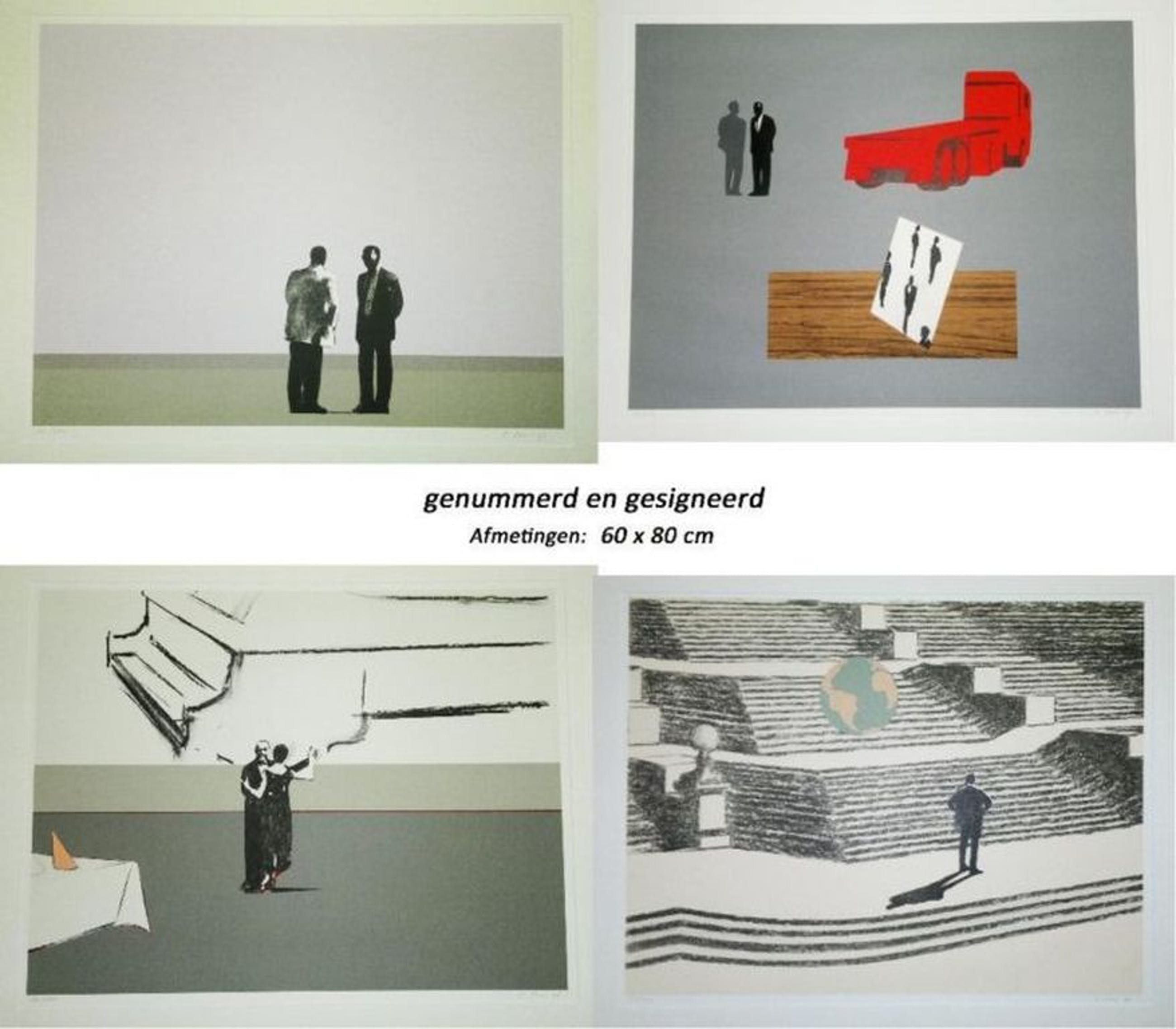 Peter Bes maakte vier collages in 1996, waarvan in een oplage van 250 stuks zeefdrukken zijn gemaakt. De zeefdrukken meten 60 x 80 cm (incl. passepartout), zijn genummerd en gesigneerd. Let op: dit aanbod betreft een complete set van deze vier collages (perfecte staat)