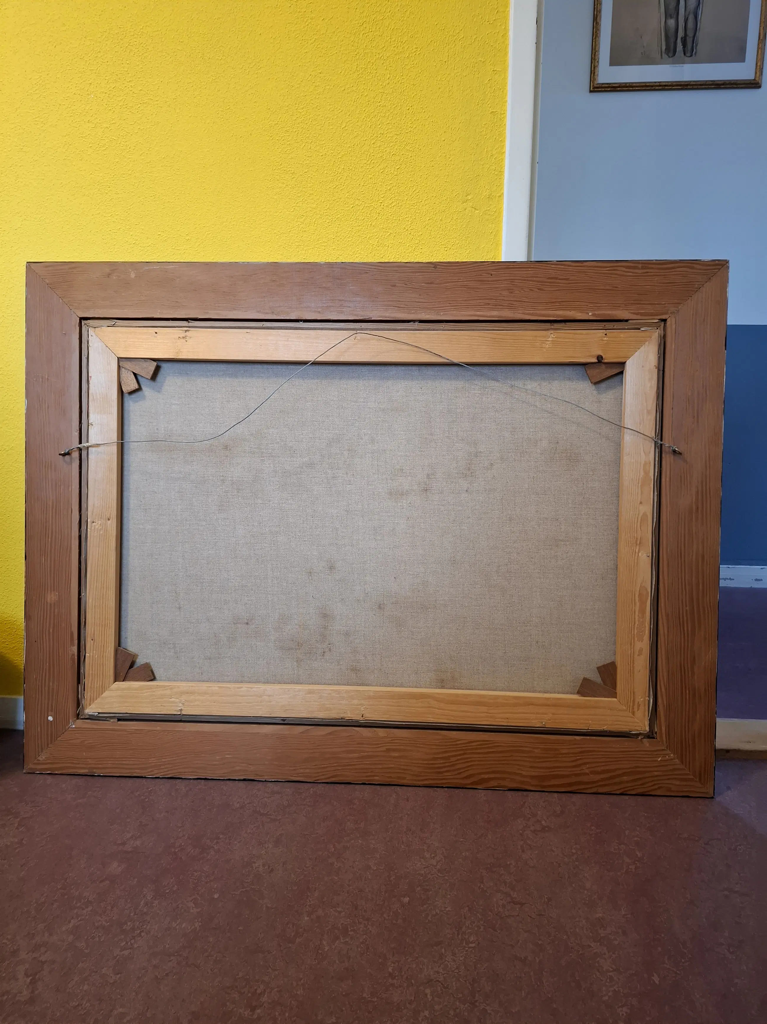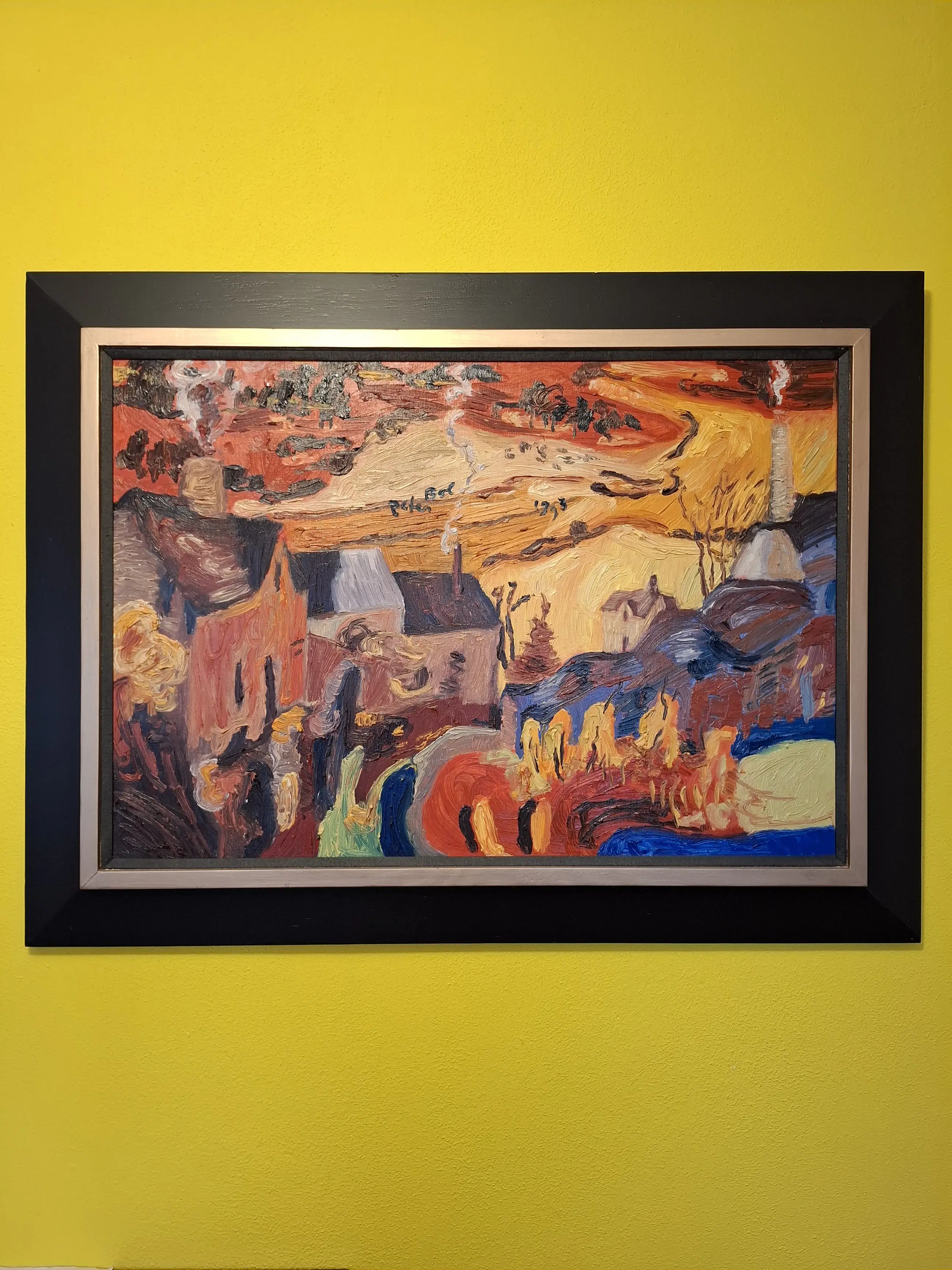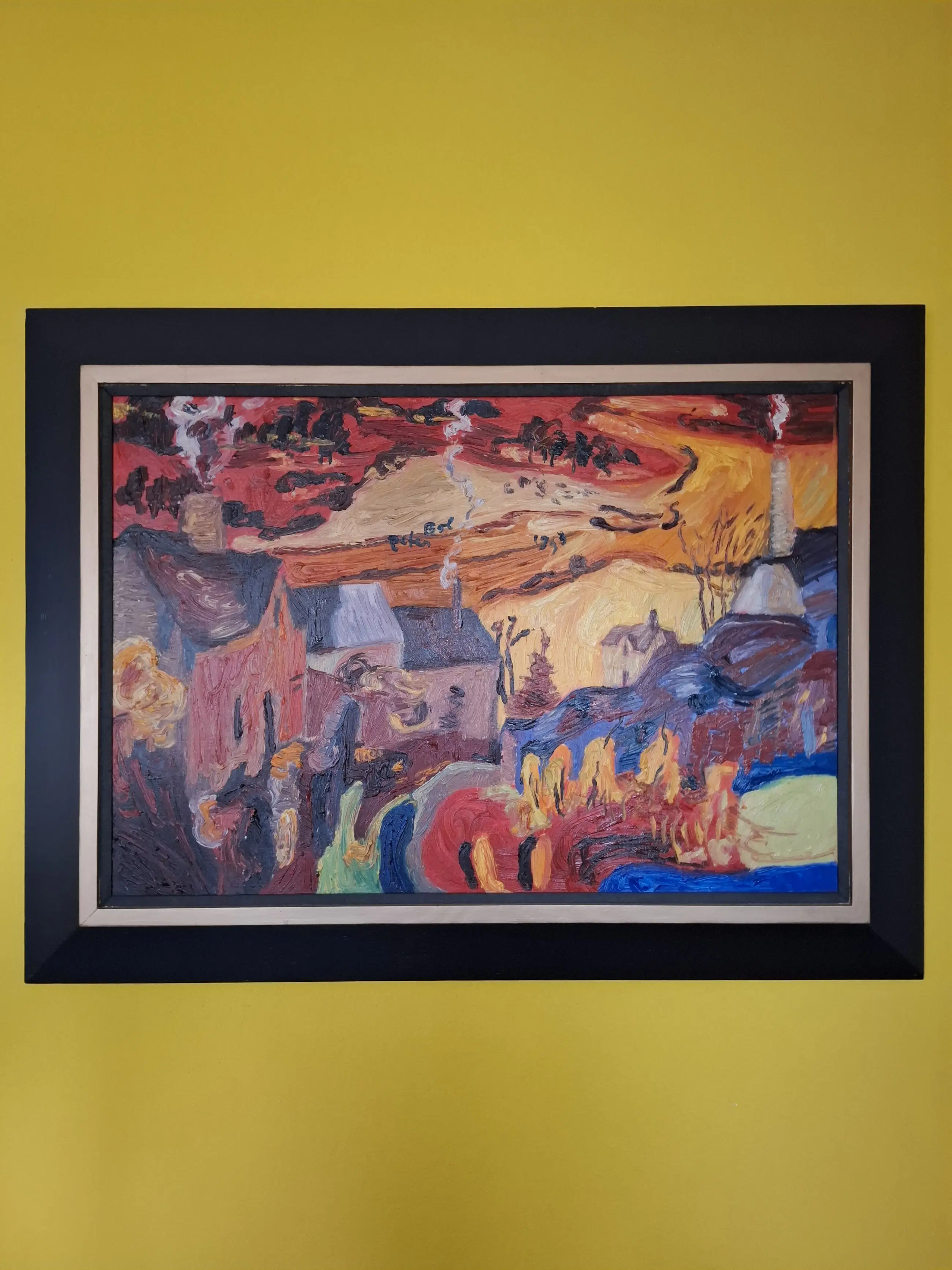 Expressief kleurrijk kunstwerk gevat in mooie houten lijst. Geschilderd in het Franse dorpje Rouveret.