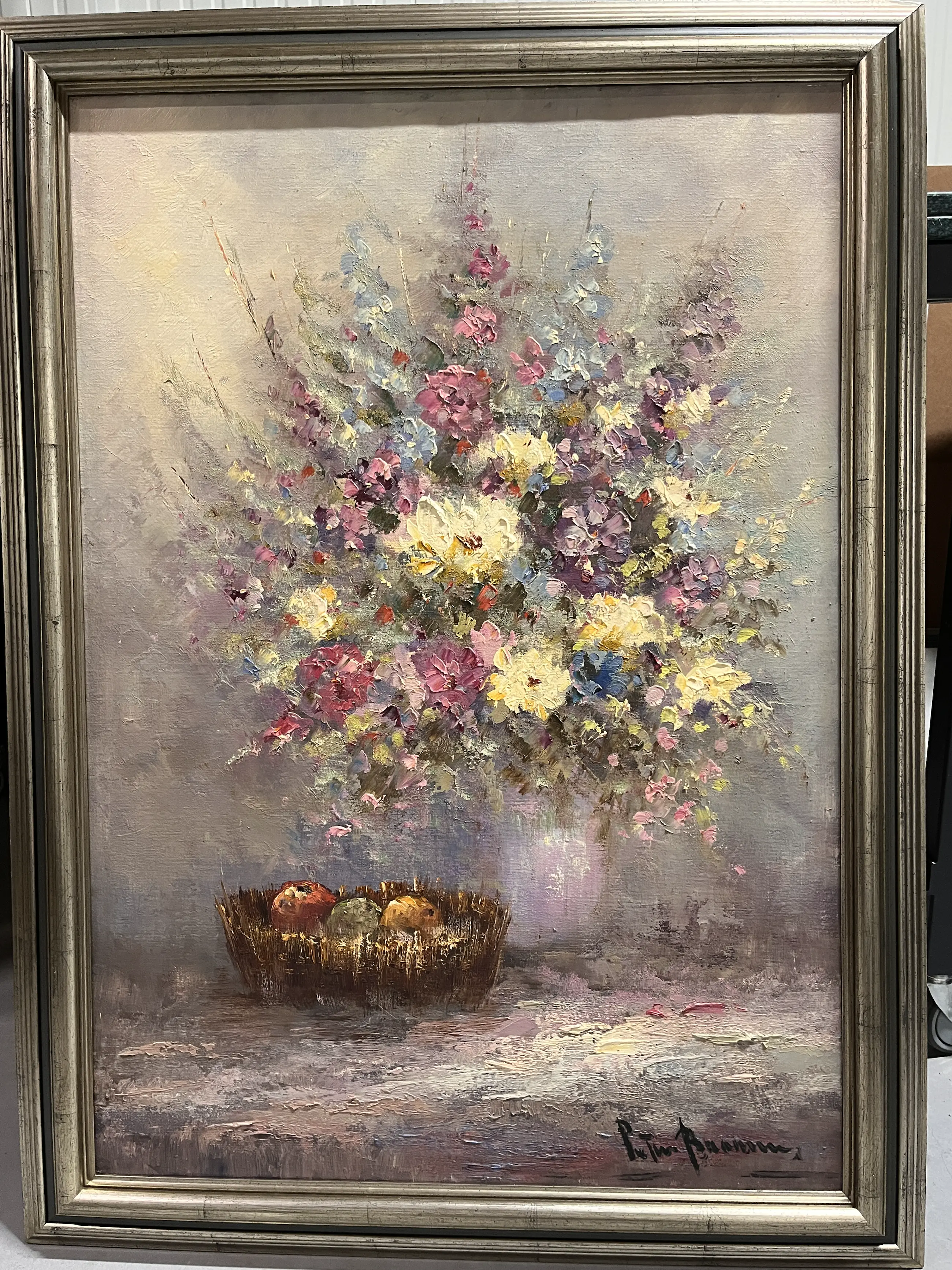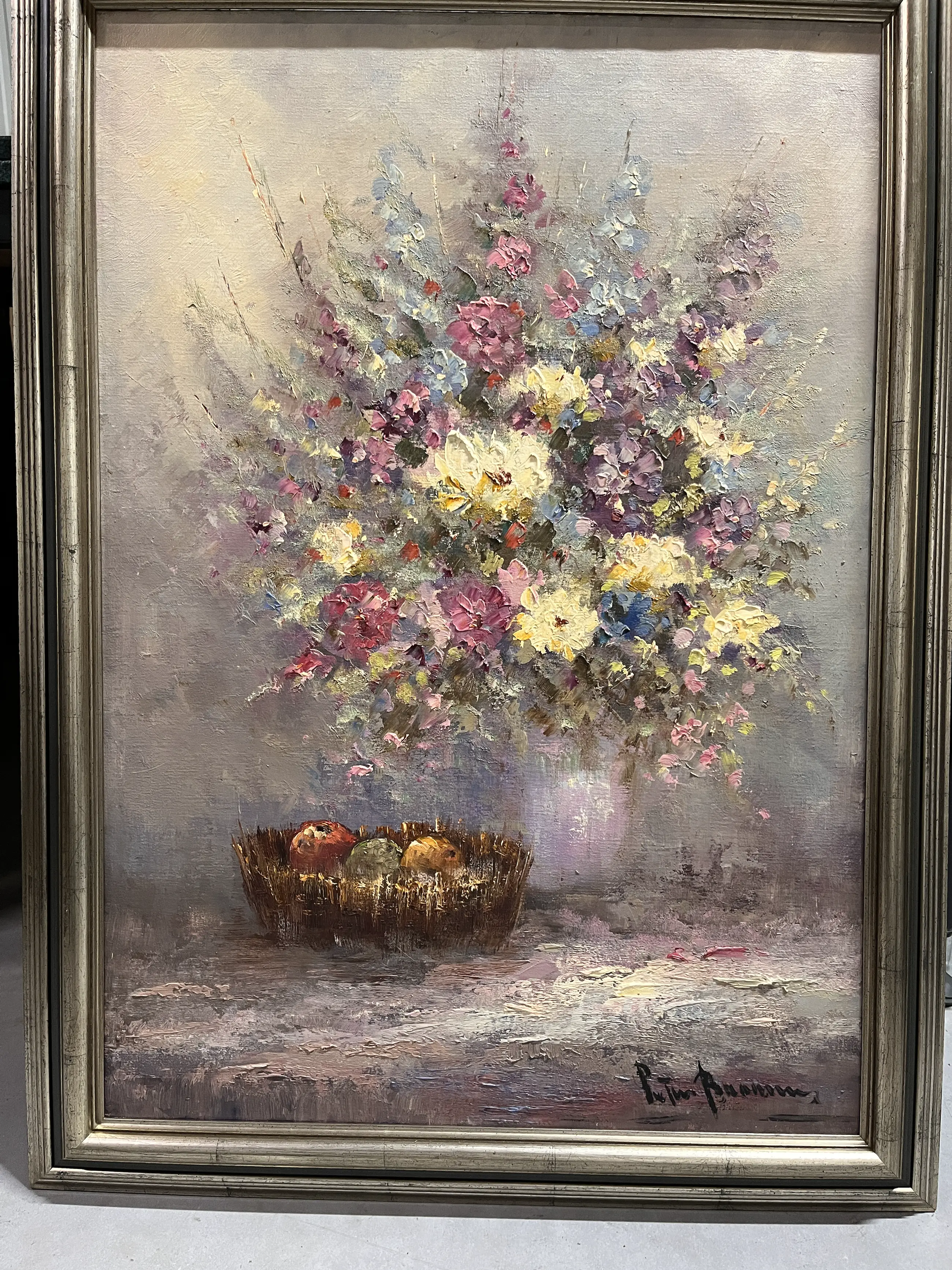 Dit schilderij is ingelijst in een zilverkleurige lijst