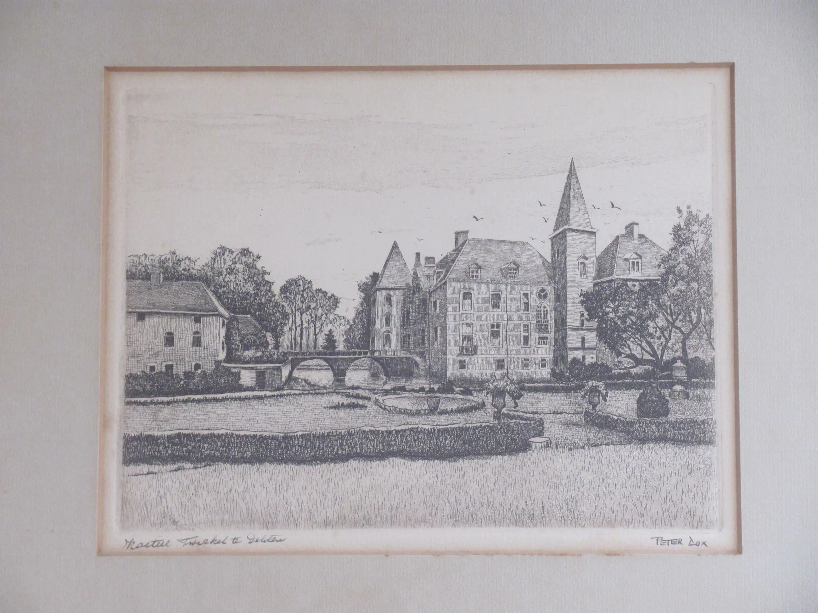 Ets van Peter Cox van Kasteel Twickel te Delden (Overijssel). Linksonder gesigneerd, rechtsonder getiteld. Deze originele ets werd in oktober 1980, in opdracht van Rottink B.V. Reis en Passageburo, getekend door Peter Cox en door hem in éénmalige oplage van 200 exemplaren vervaardigd. Beschrijving van Peter Cox en van Kasteel Twickel op de achterzijde van de lijst.