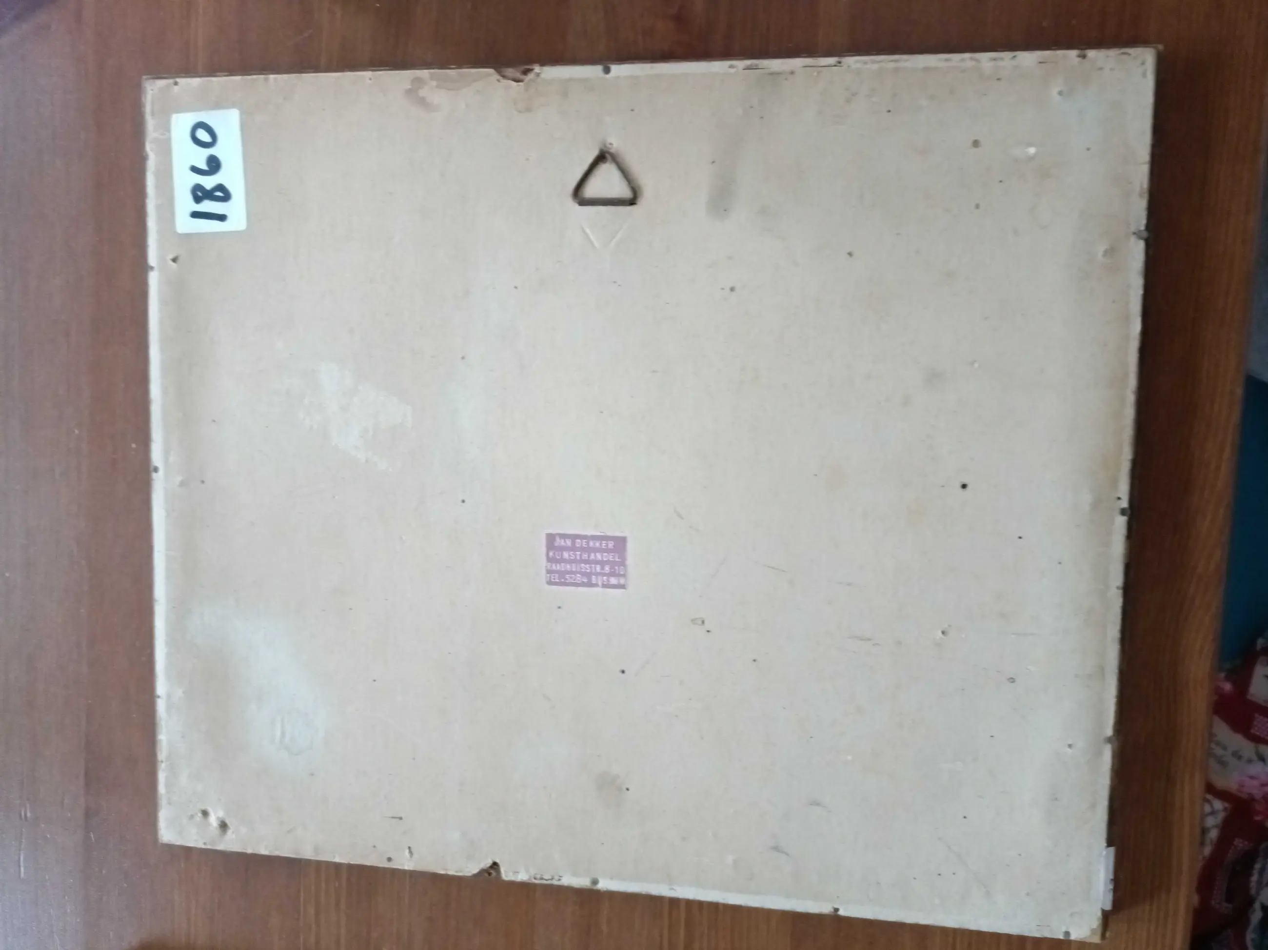 lijst is wat beschadigd, maar nog wel intact. glas is onbeschadigd. Werk zelf door de tand des tijds wat verkleurd (niet meer helder wit)