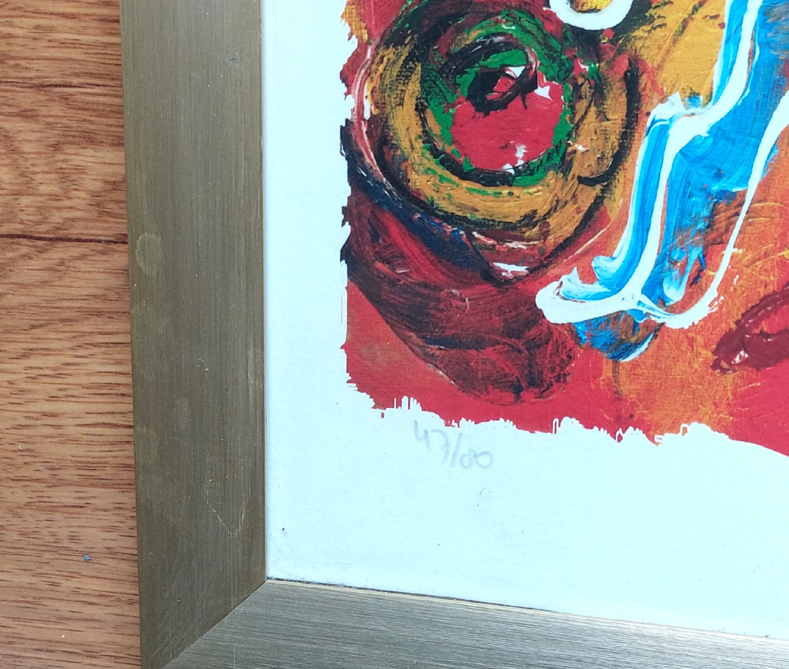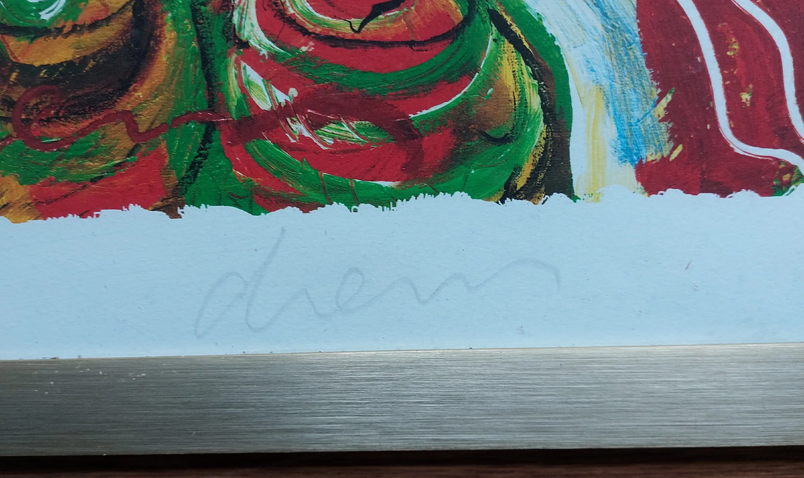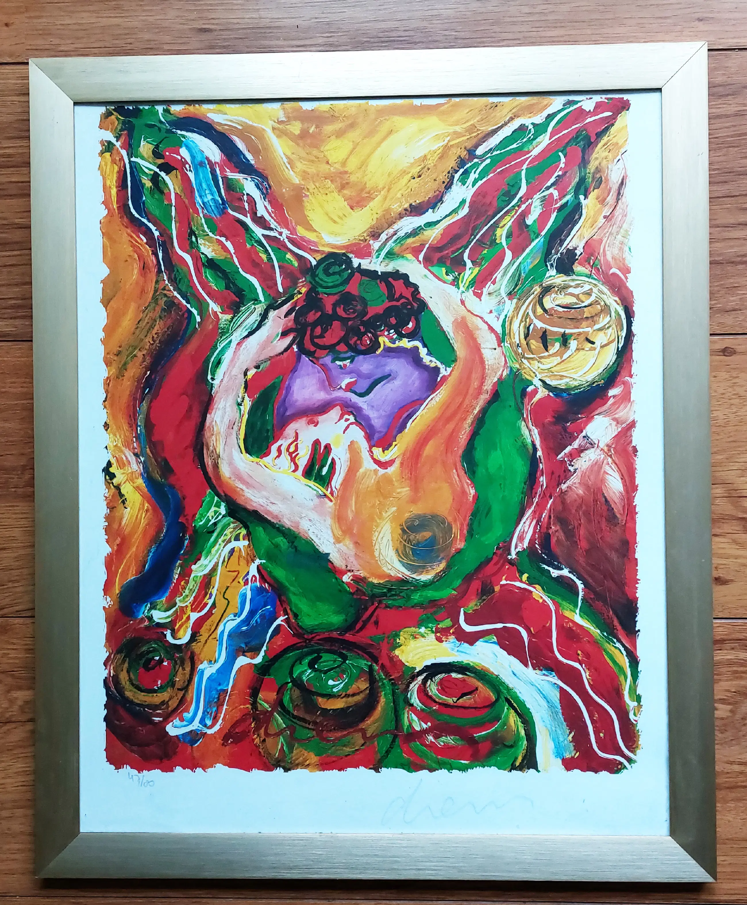 Mooie kleurijke zeefdruk nr 47/80. Zeer mooi ingelijst.