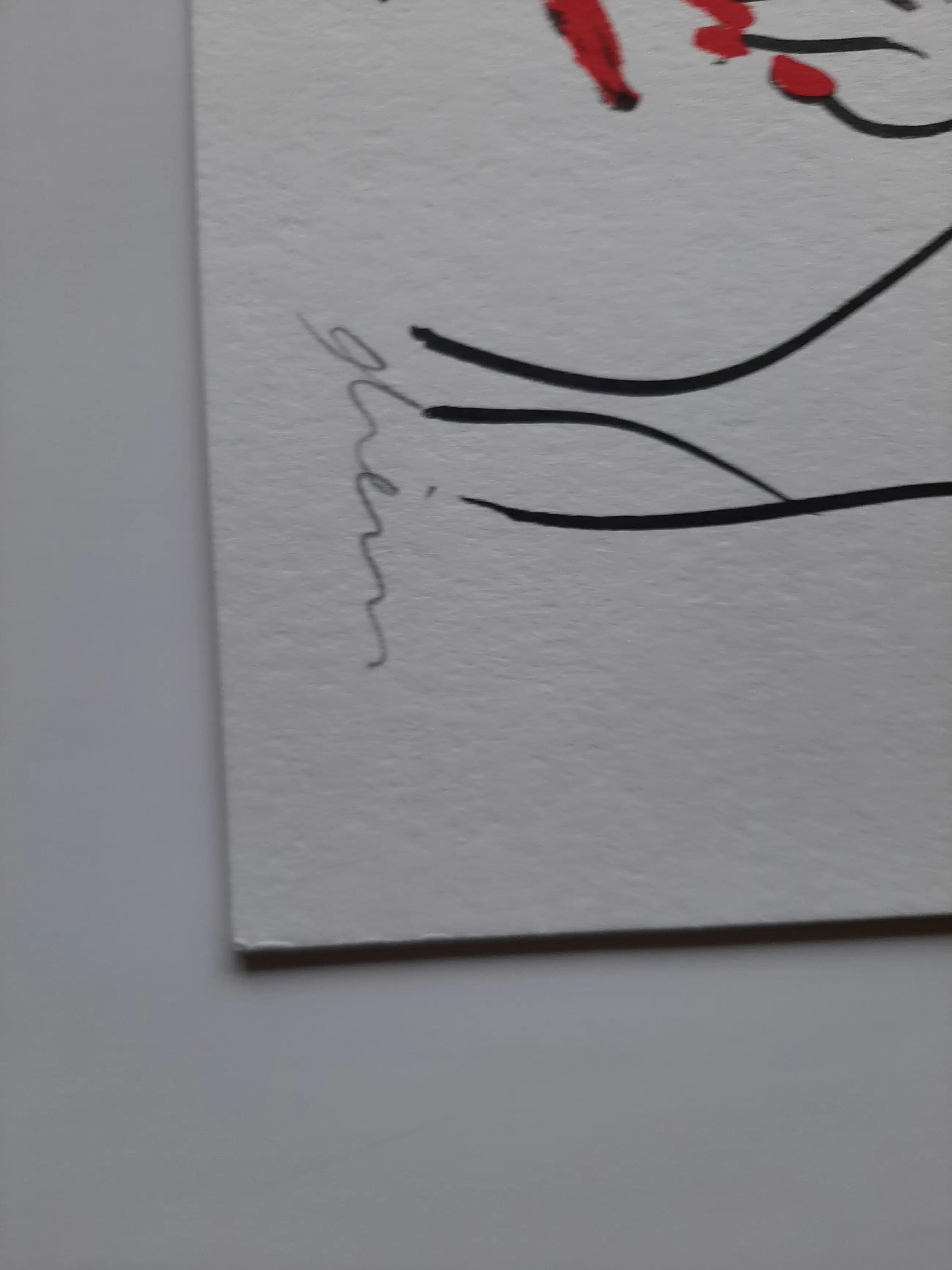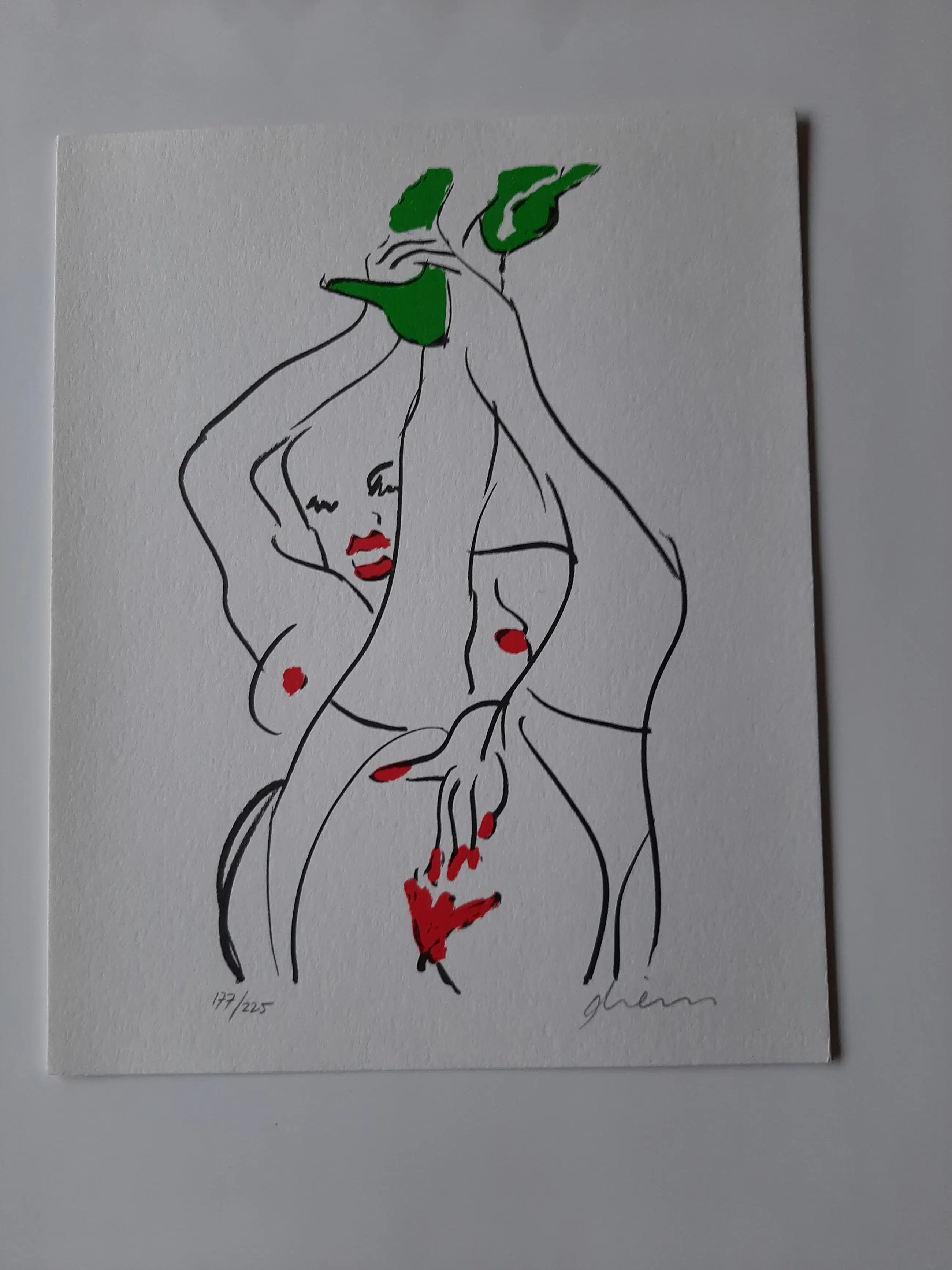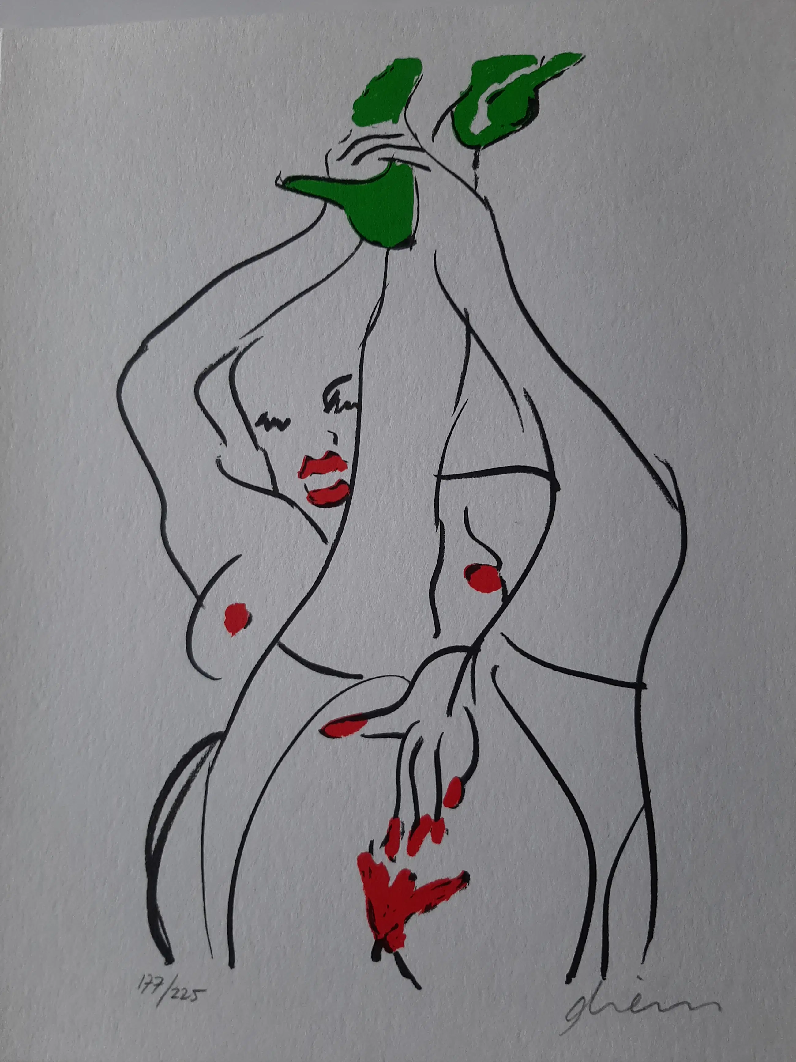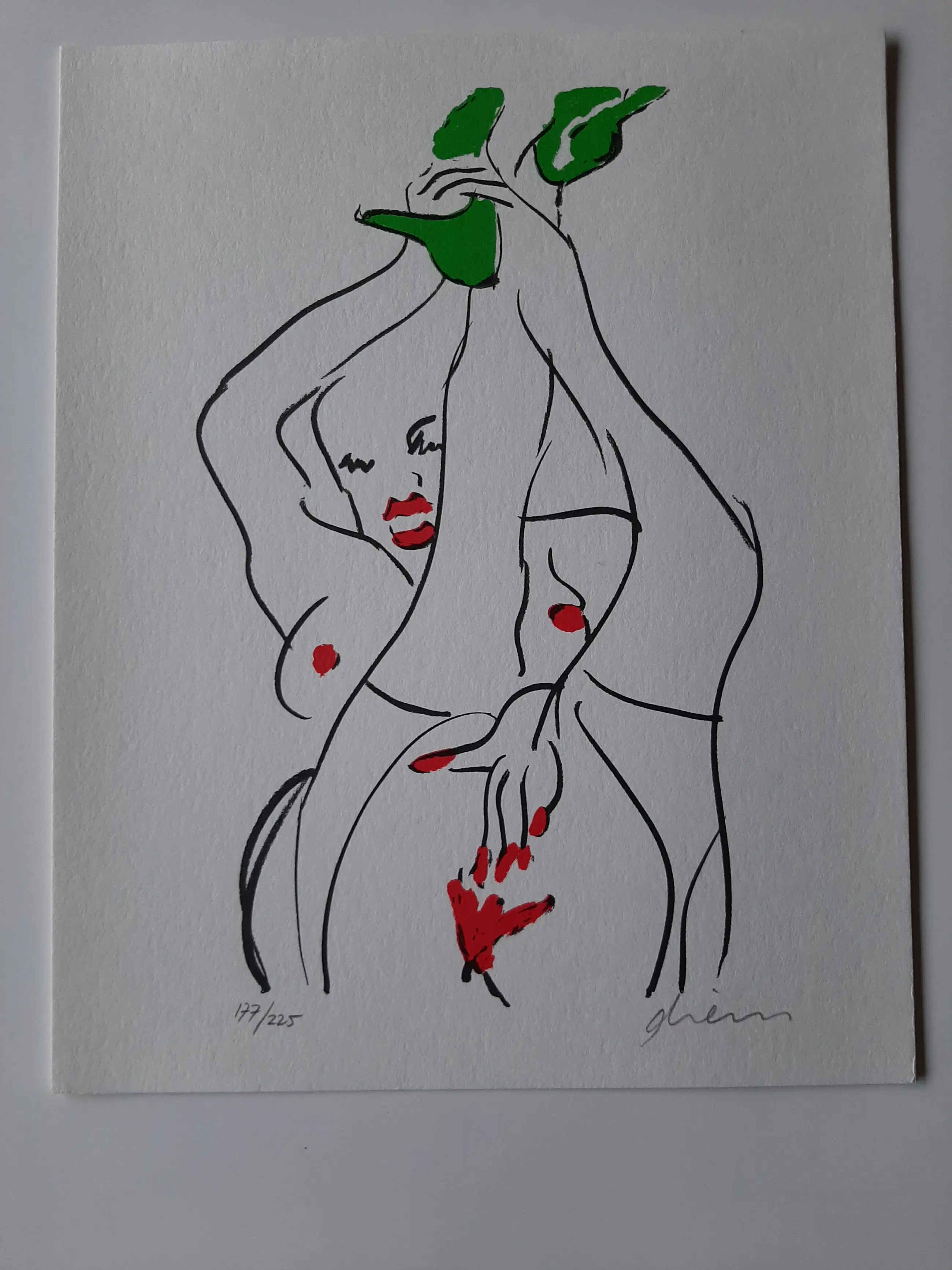 Zeefdruk van Peter Diem. Afgedrukt is een naakte vrouw.