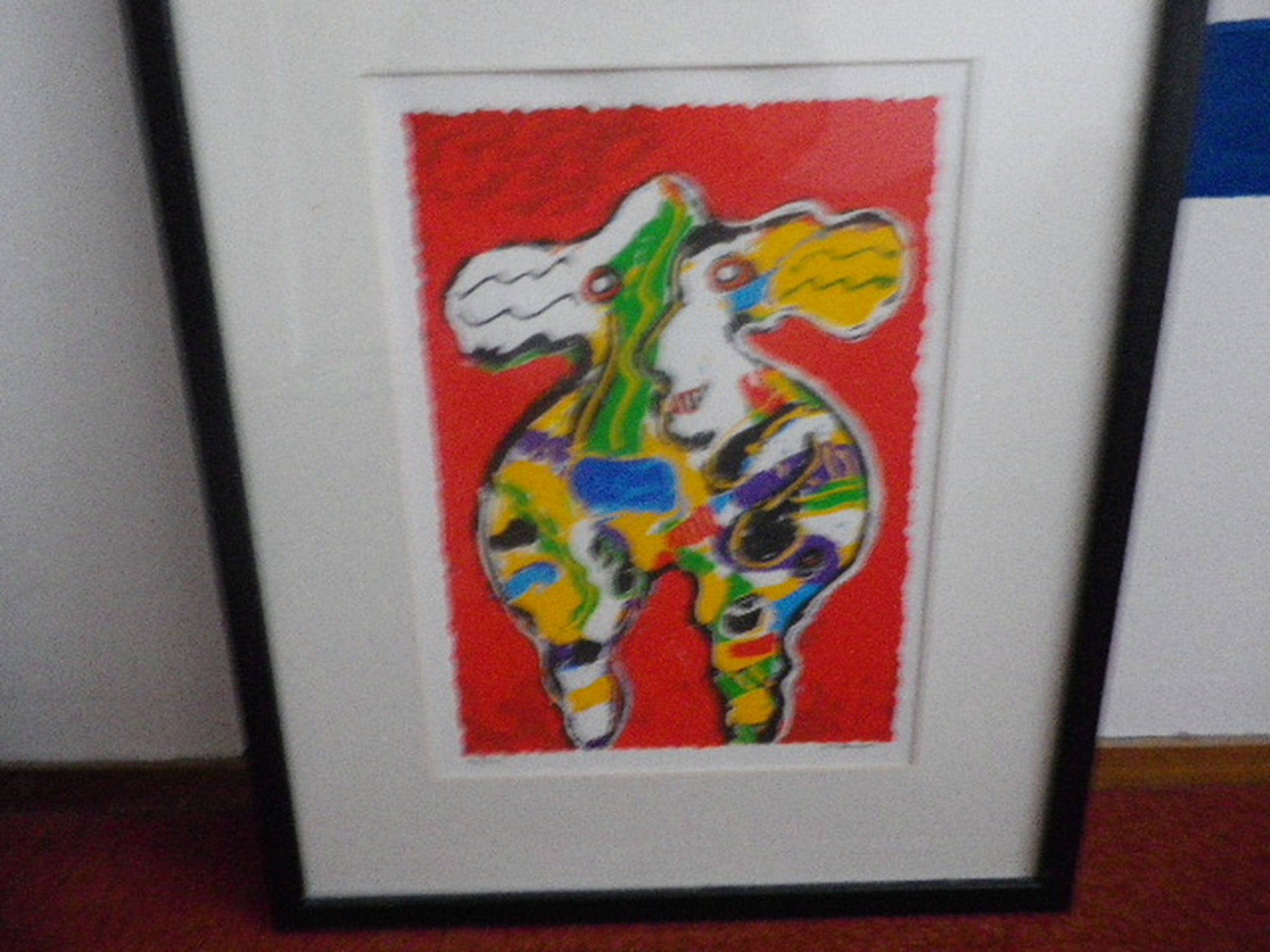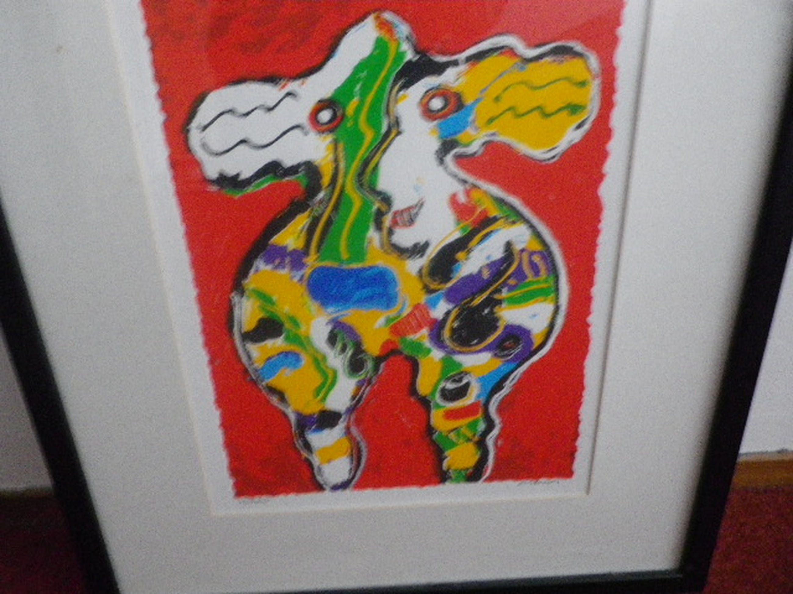 gekleurde koe blauw en rood van peter diem , ingelijst 58x 48 cm ,genummerd en gesigneerd.