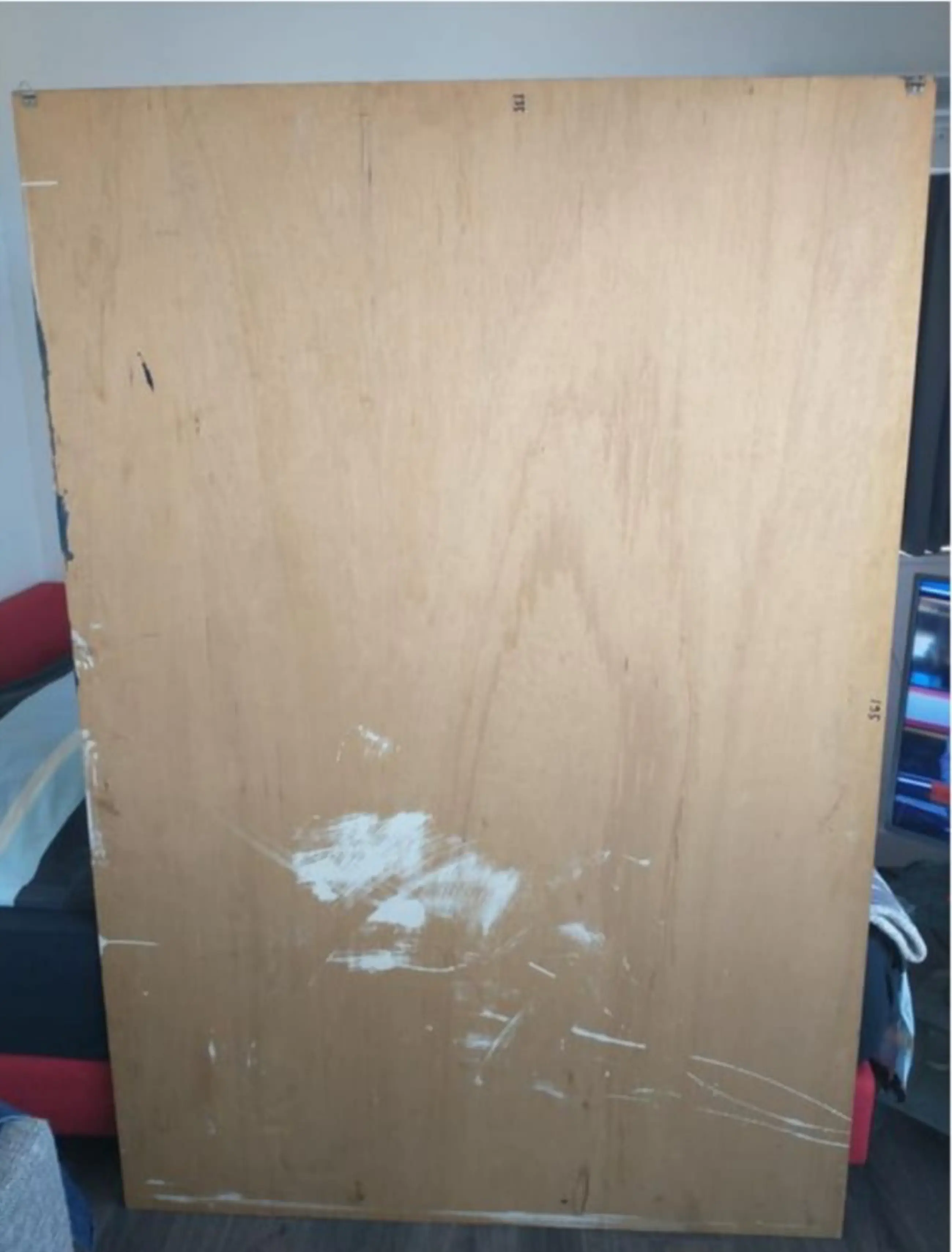 Er zitten wat gaatjes in het werk, tijdens het schilderen heeft Peter het paneel vast geschroefd. Zie hiervoor de foto's.
