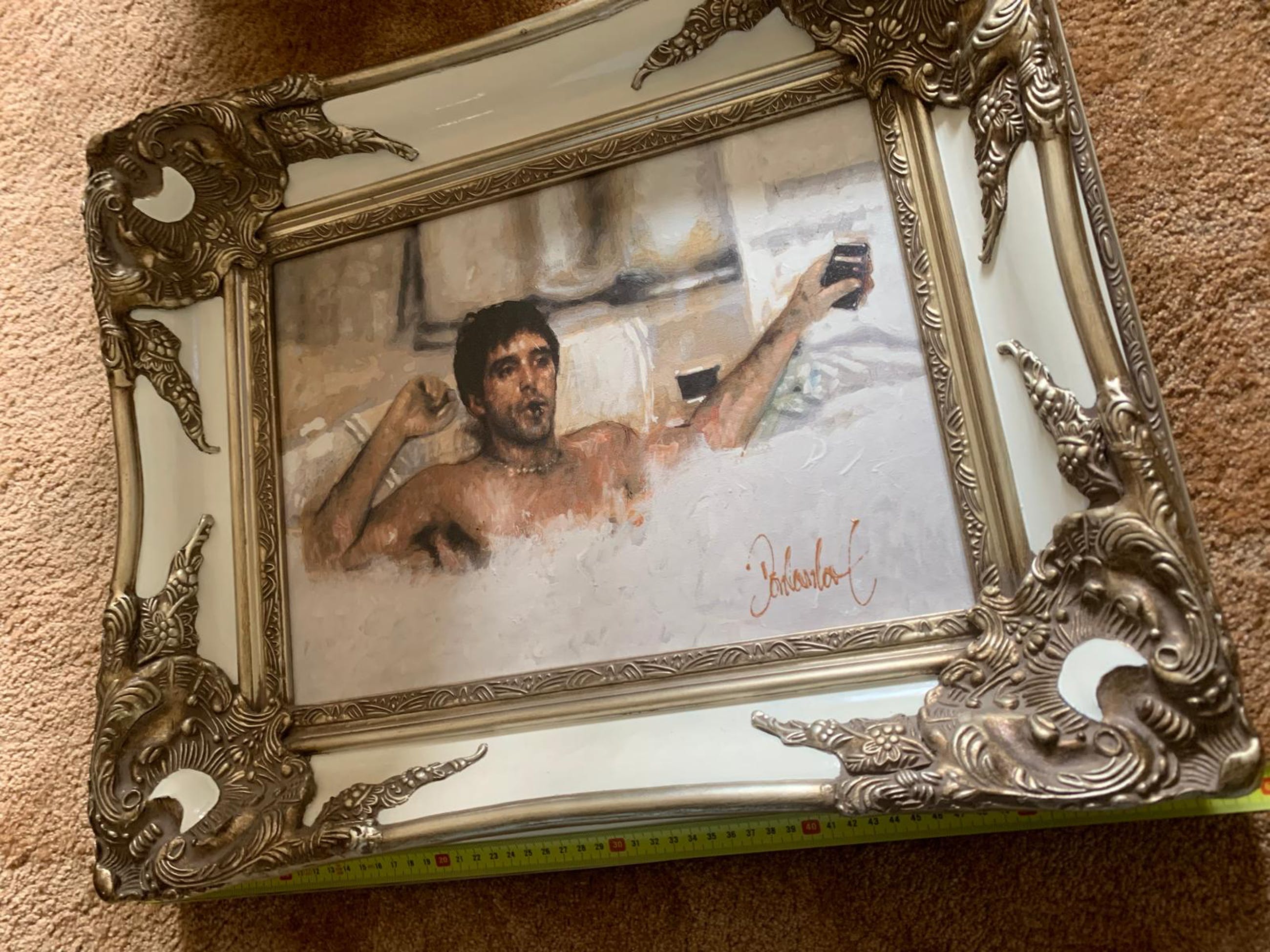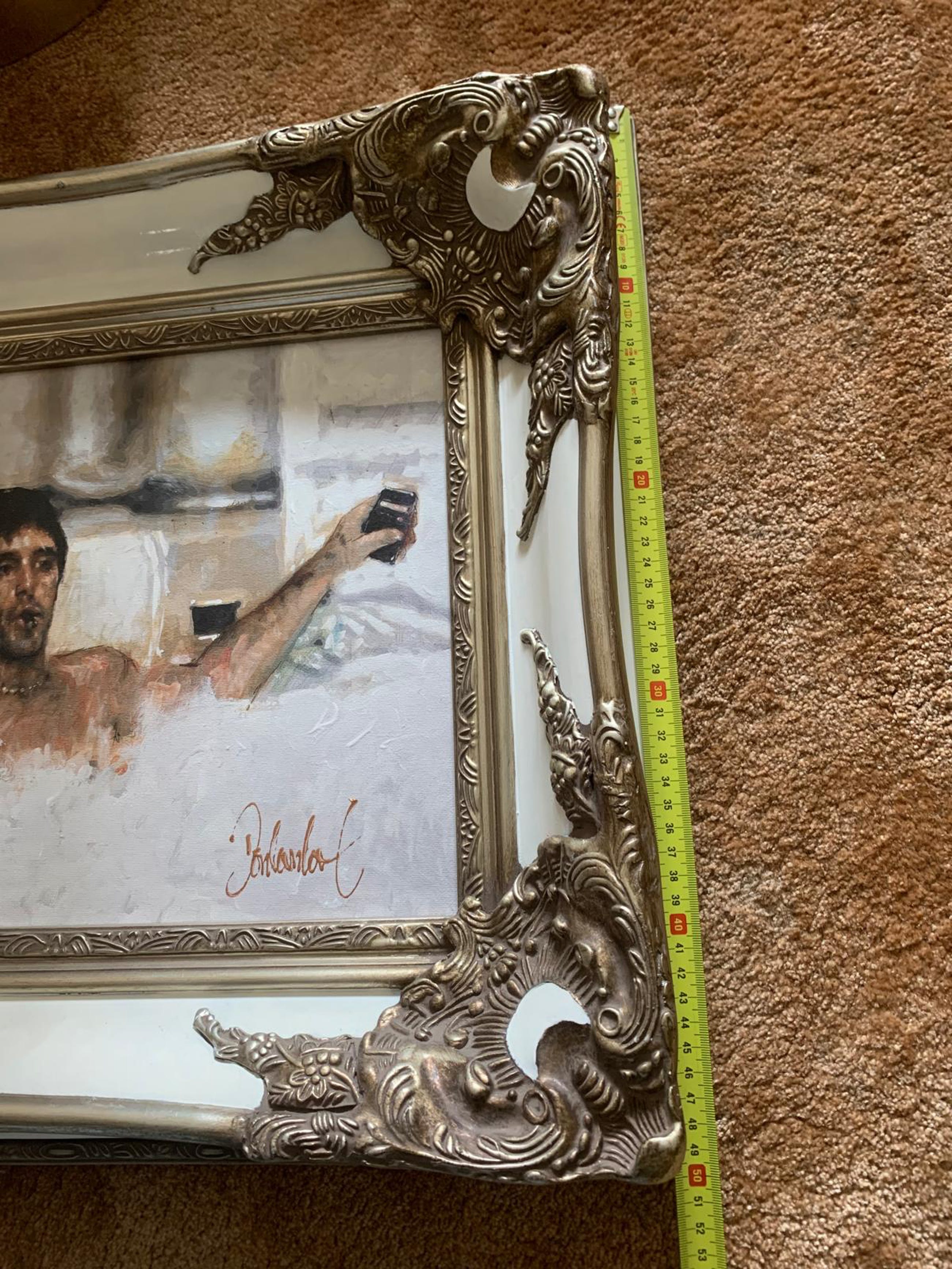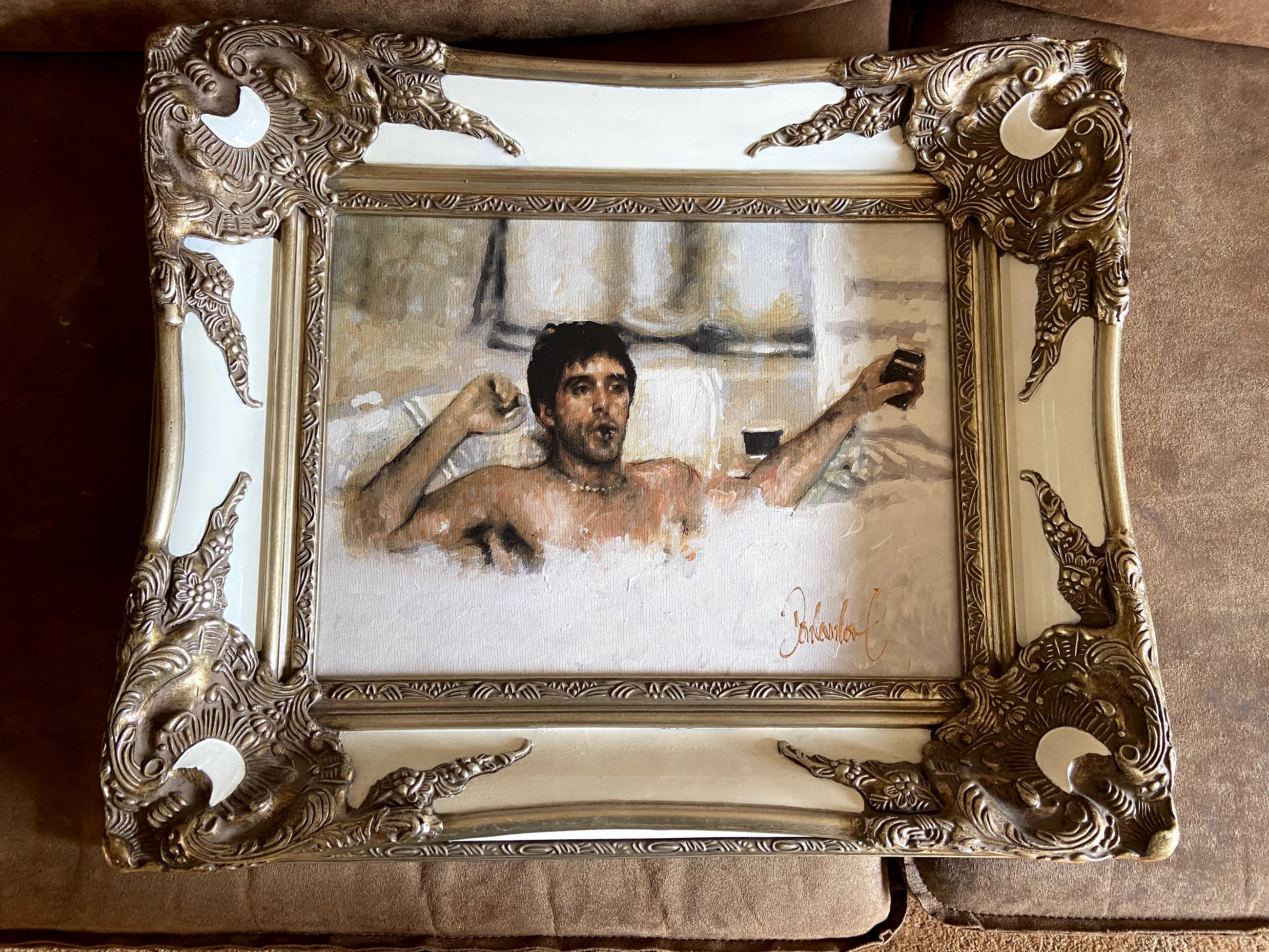 Al Pacino in bad als in de bekende film Scarface, in handbeschilderde schitterende barok lijst.