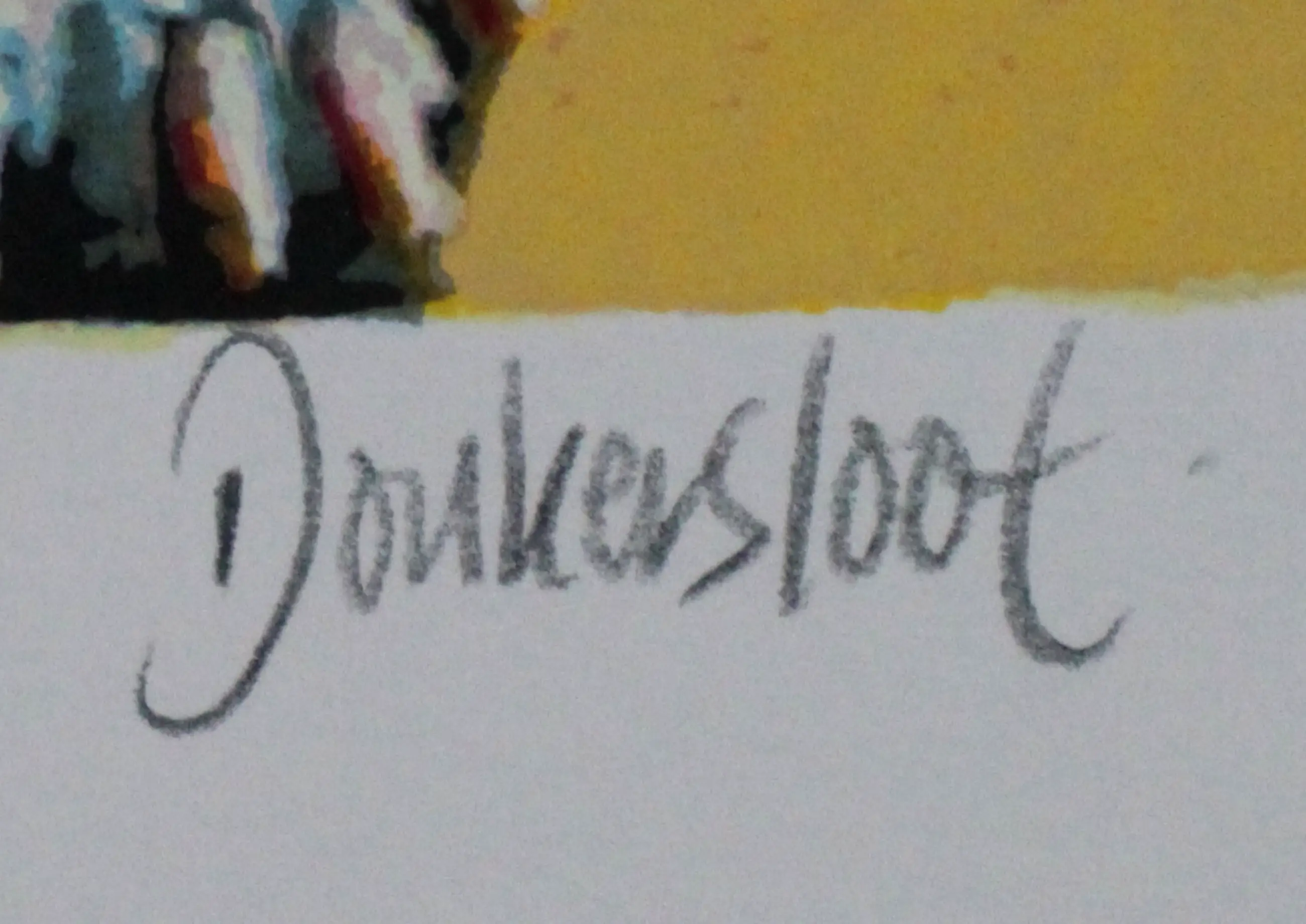 Leuke zeefdruk van Peter Donkersloot. Nummer: 13/175. Afmetingen blad: H60 x b50cm. Afmetingen voorstelling: H50 x b40cm. Het werk is rechts onderin, gesigneerd met potlood door de kunstenaar. De authenticiteit van het aangeboden werk wordt volledig gegarandeerd. Een certificaat van echtheid kan, op aanvraag, worden gemaild.
