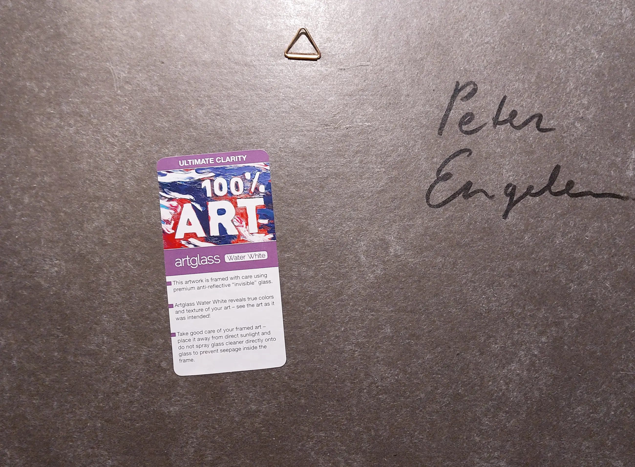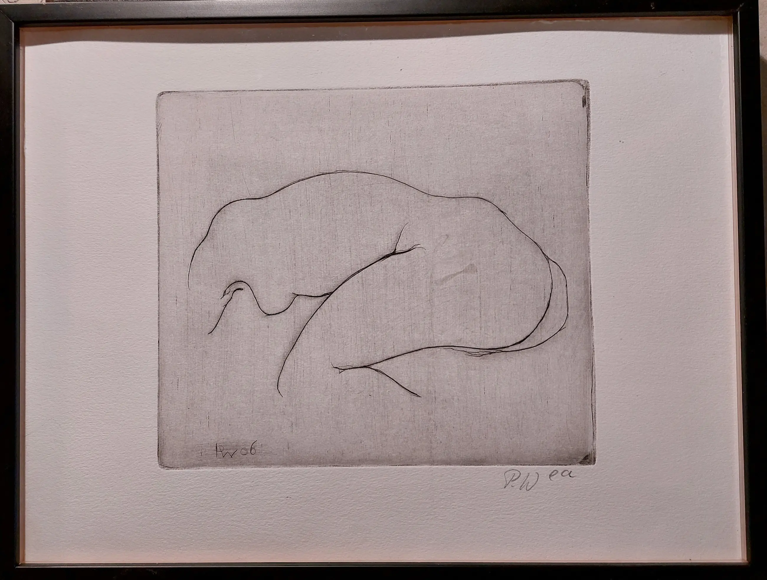 Peter Engelen, beeldhouwer van vooral dierfiguren en vrouwen, maakt ook tekeningen en grafiek. Mooi ingelijst en voorzien van zogenoemd UV werend en niet spiegelend ART-glas. Monogram onder de ets rechts en EA. Gedateerd ' 06 links onder de ets.