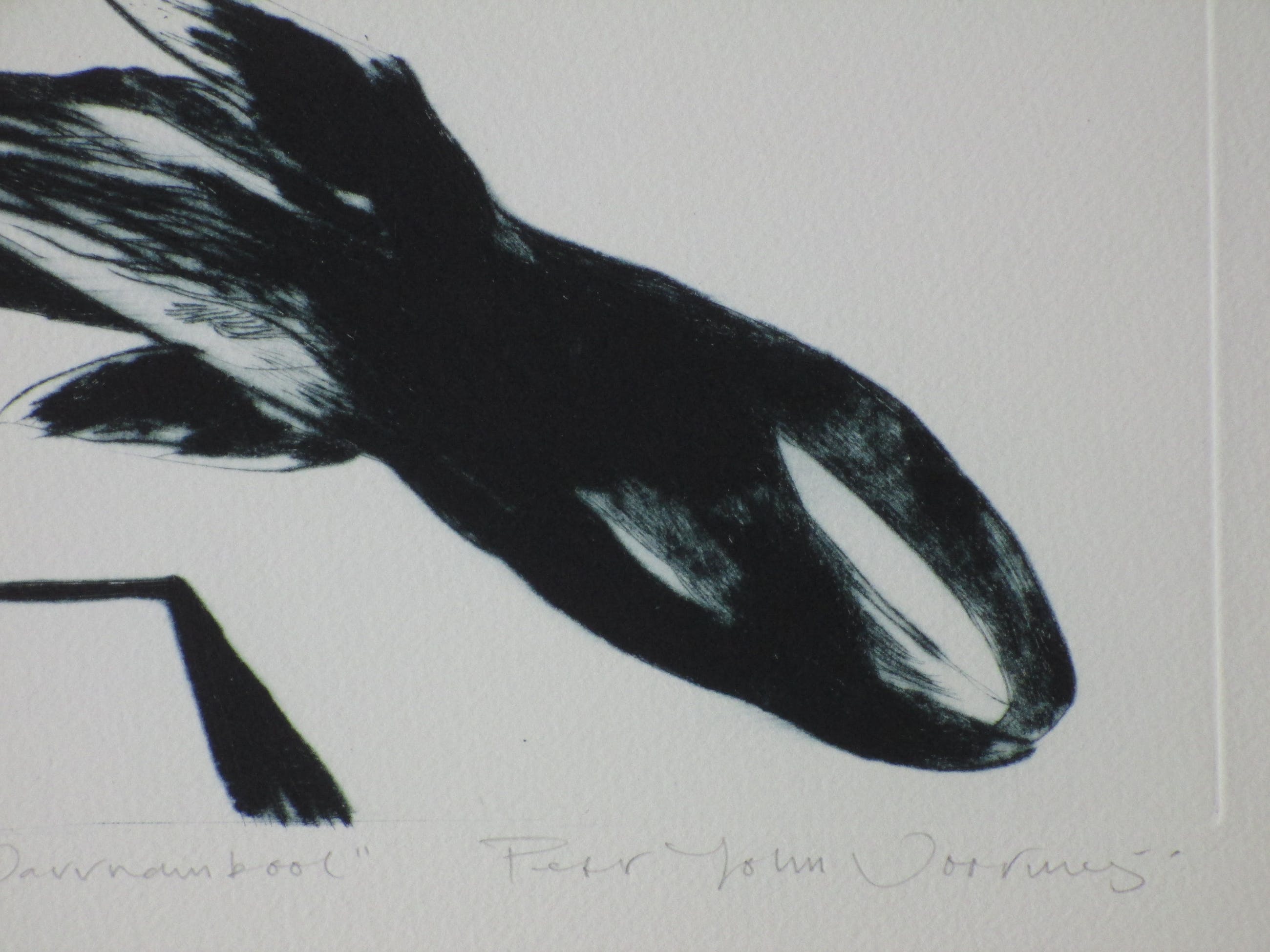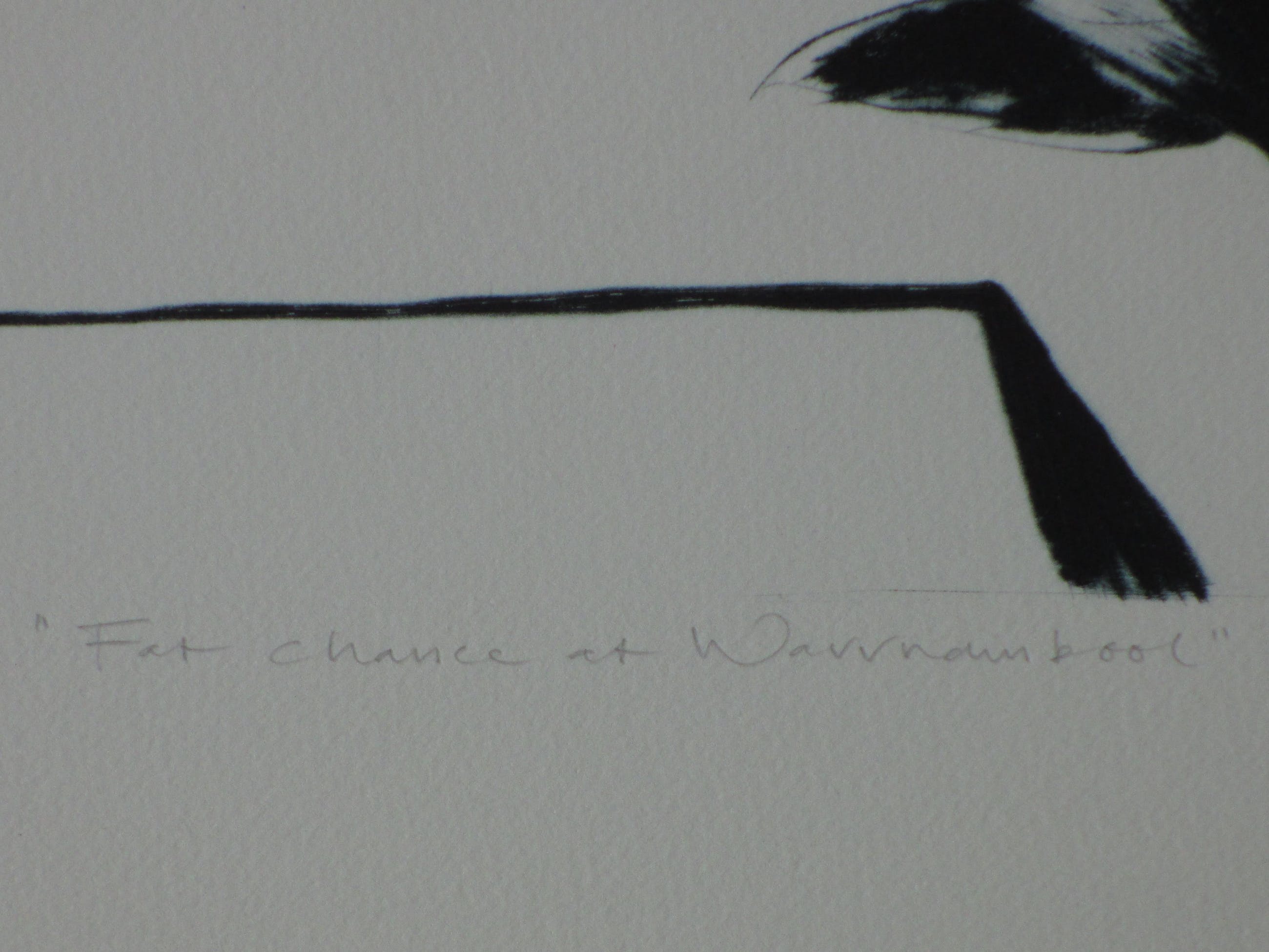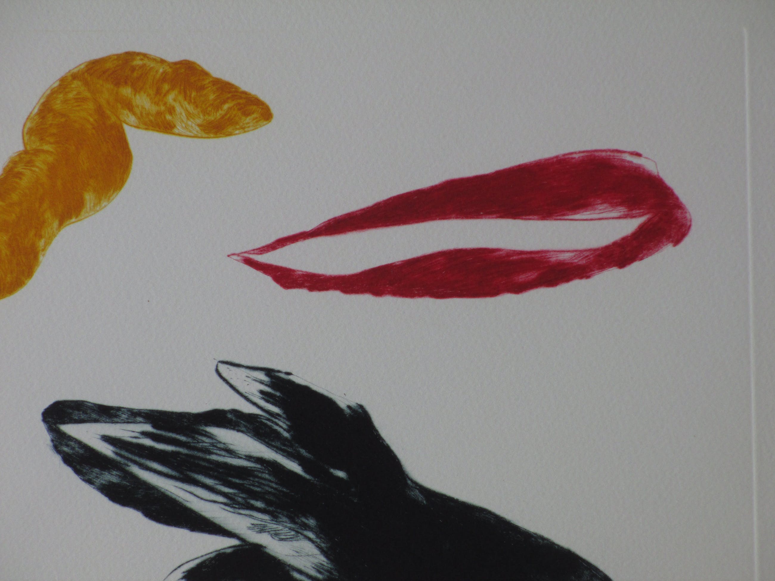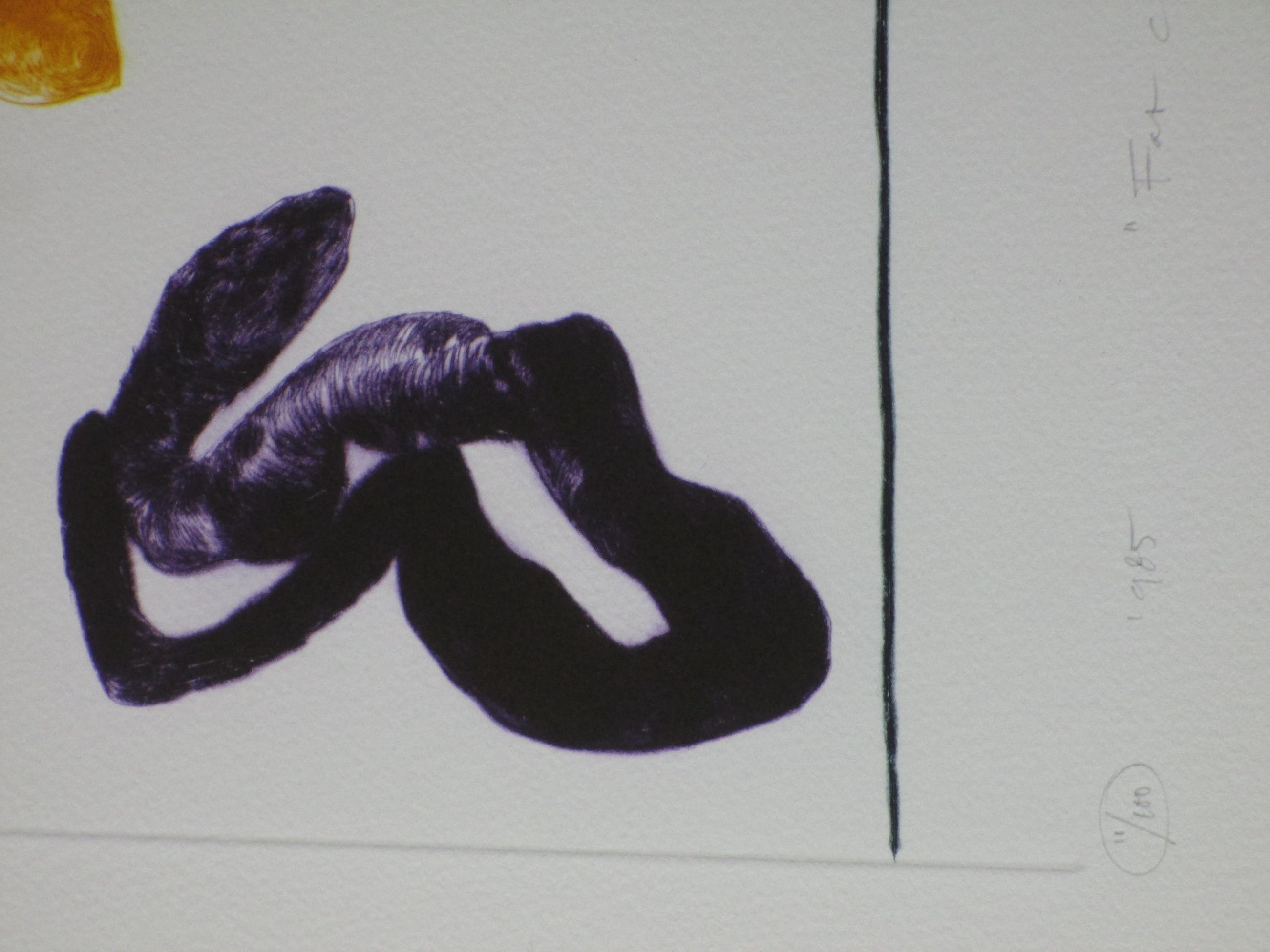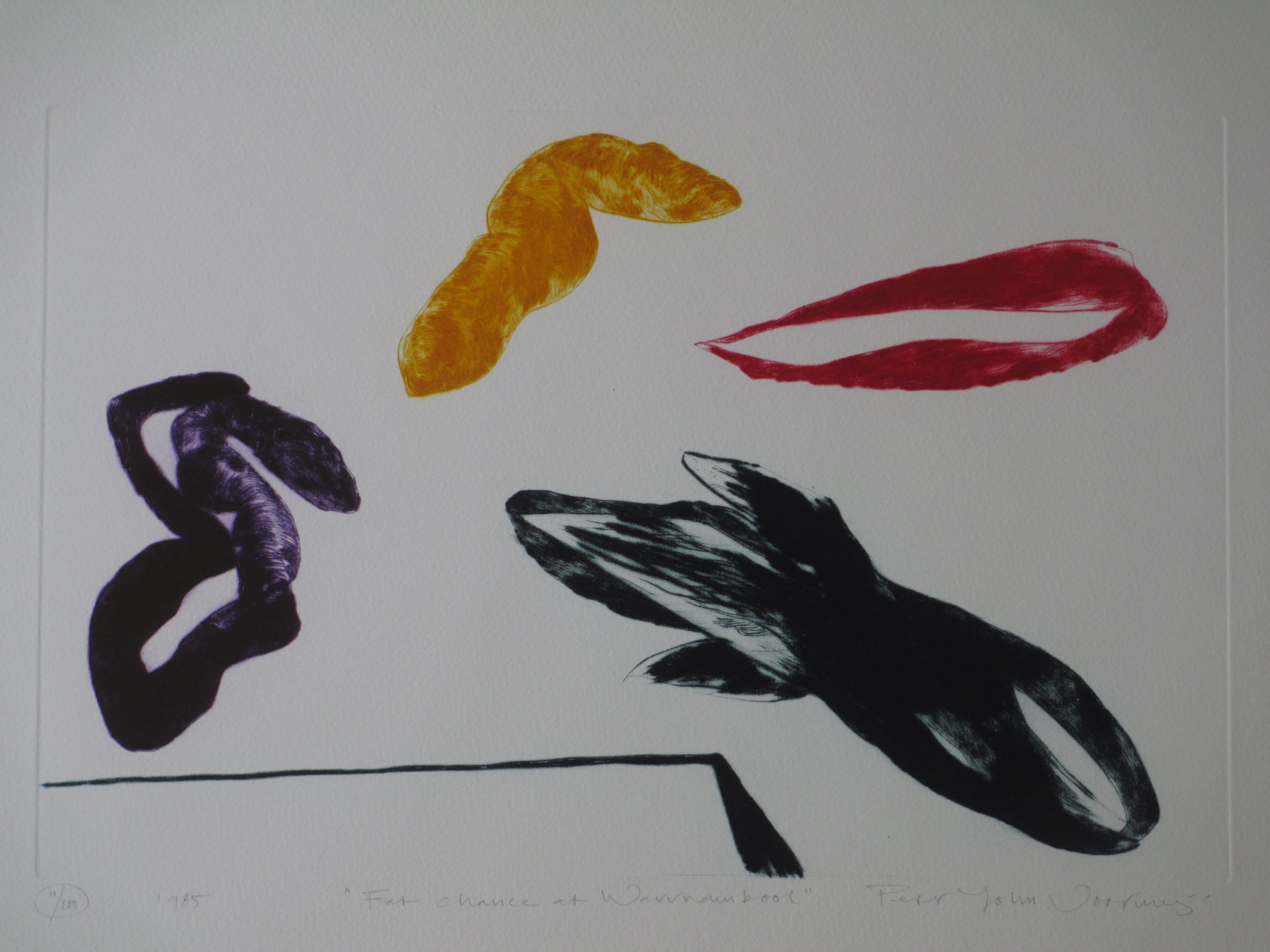 Kleurets door Peter John VoormeijVoorstelling van een abstracte compositieLosbladig, beeldmaat 25x37, bladmaat 56x76Gesigneerd in potlood r.o. Getiteld in potlood m.o. 'Fat chance at Warnambool'Genummerd en gedateerd in potlood l.o. '11/100 en 1985'Buitenranden van het blad zijn wat verkleurd, geen invloed op de voorstellingAuthenticiteit volledig gegarandeerd