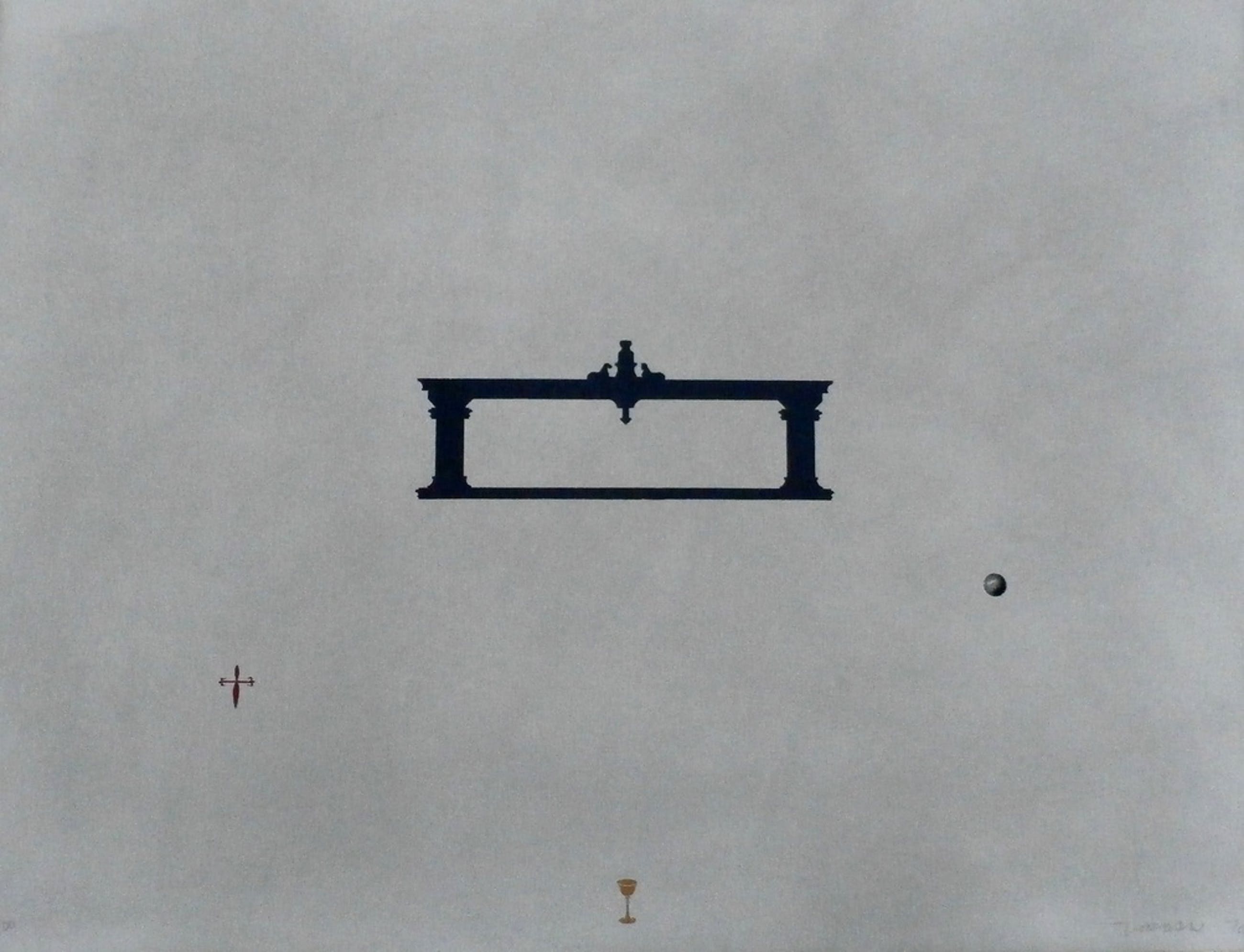 Zeefdruk van Peter Jordaan uit 1993. Titel: Zonder titel. Deze zeefdruk komt uit de Gelderse Grafiekmap 1993. Nummer: 84/100.Afmetingen blad: h50 x b65,5 cm. Het werk is rechtsonder, met potlood, gesigneerd door de kunstenaar.