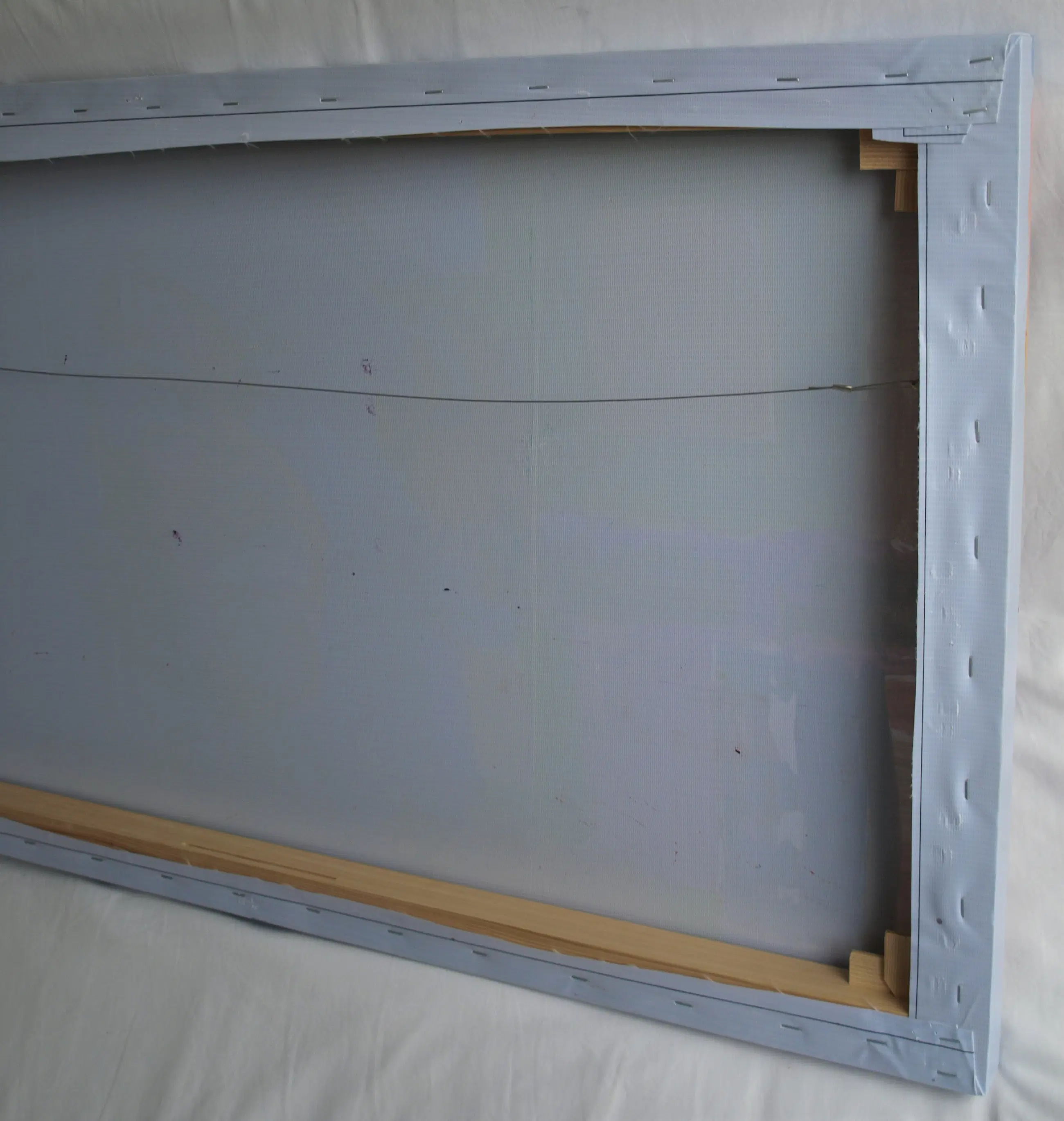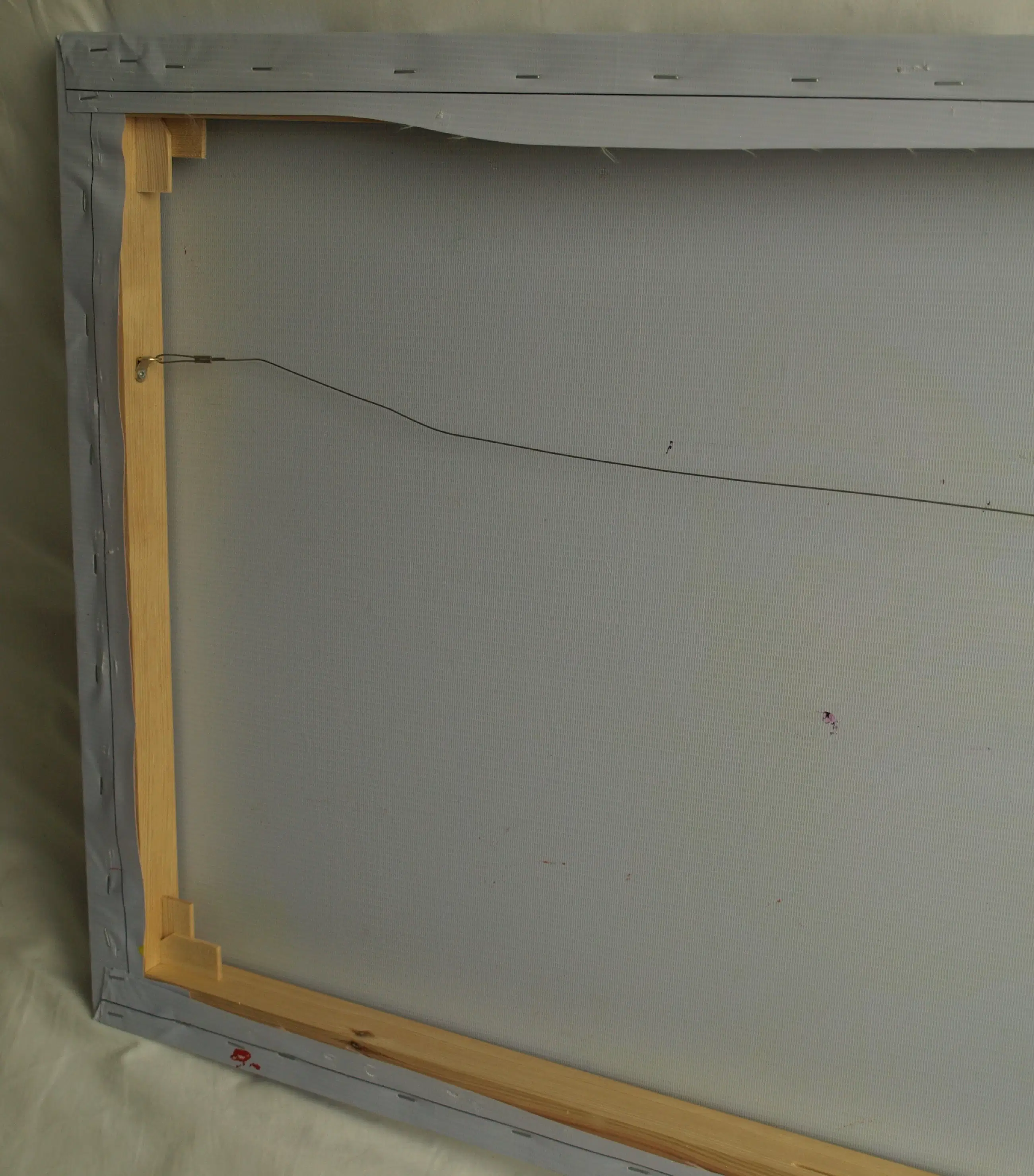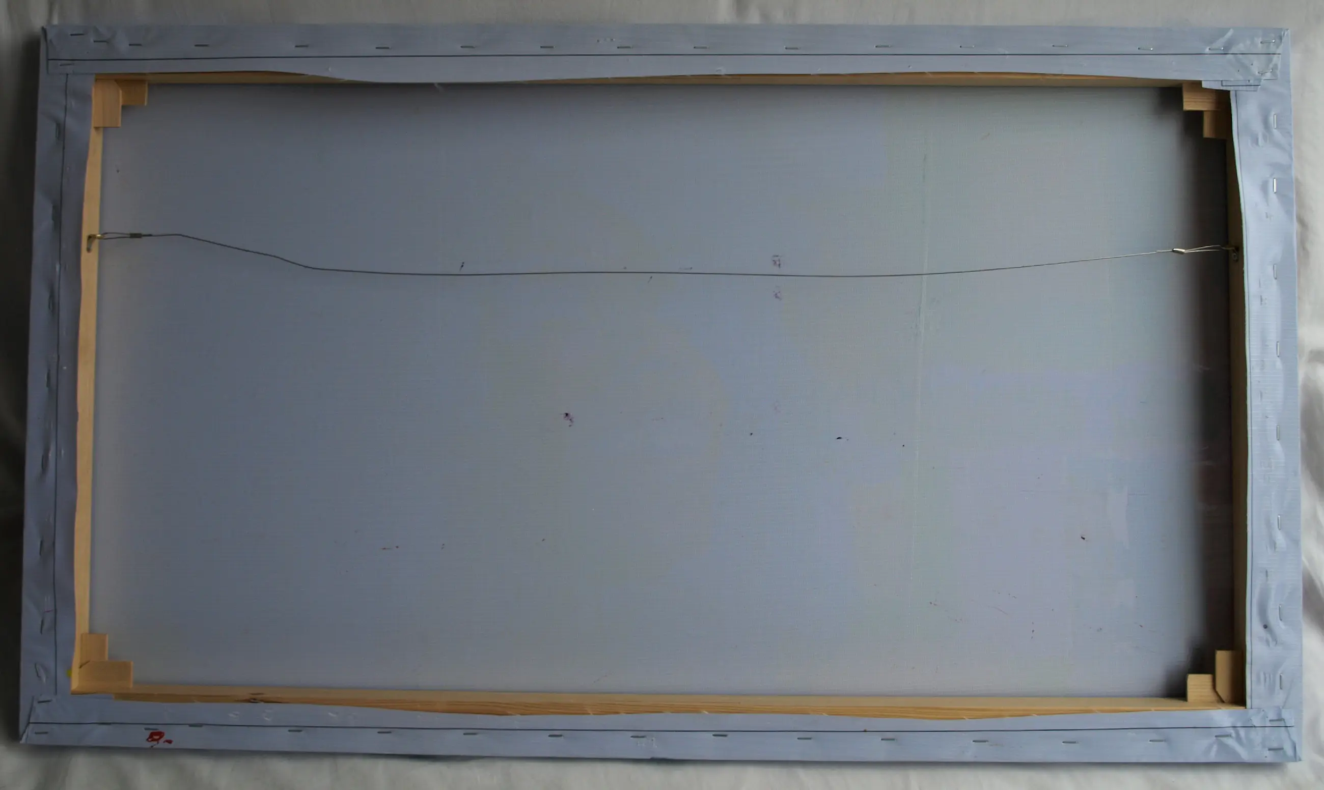 -Acrylverf op bisonyl-doek, opgespannen op een dik houten frame. Het frame heeft een ophangsysteem en het werk kan zo aan de muur.