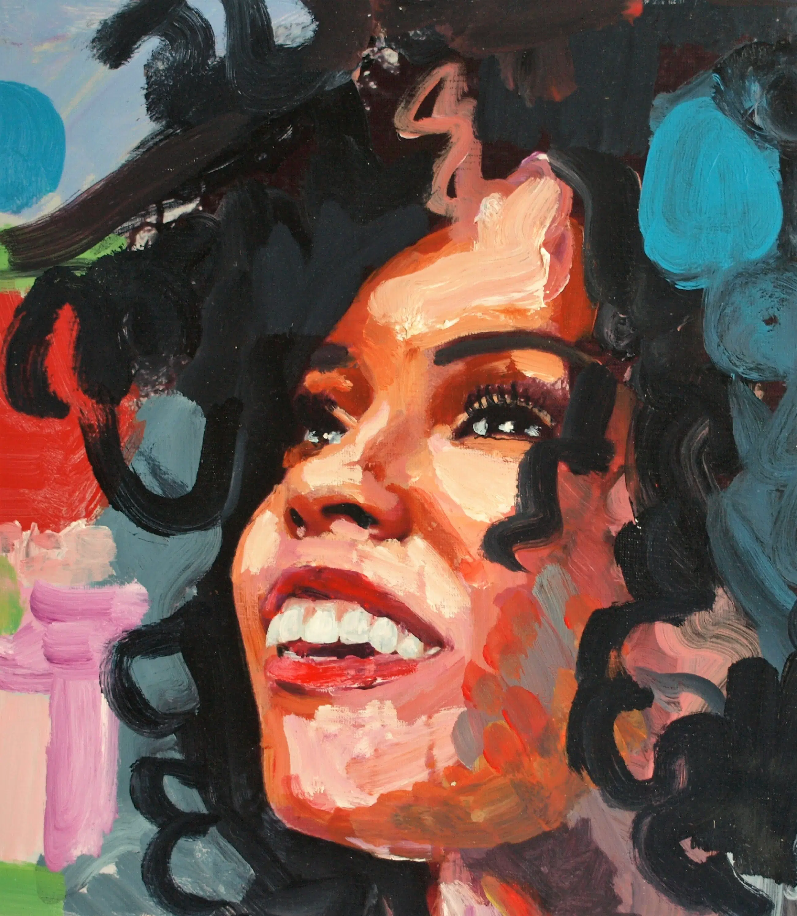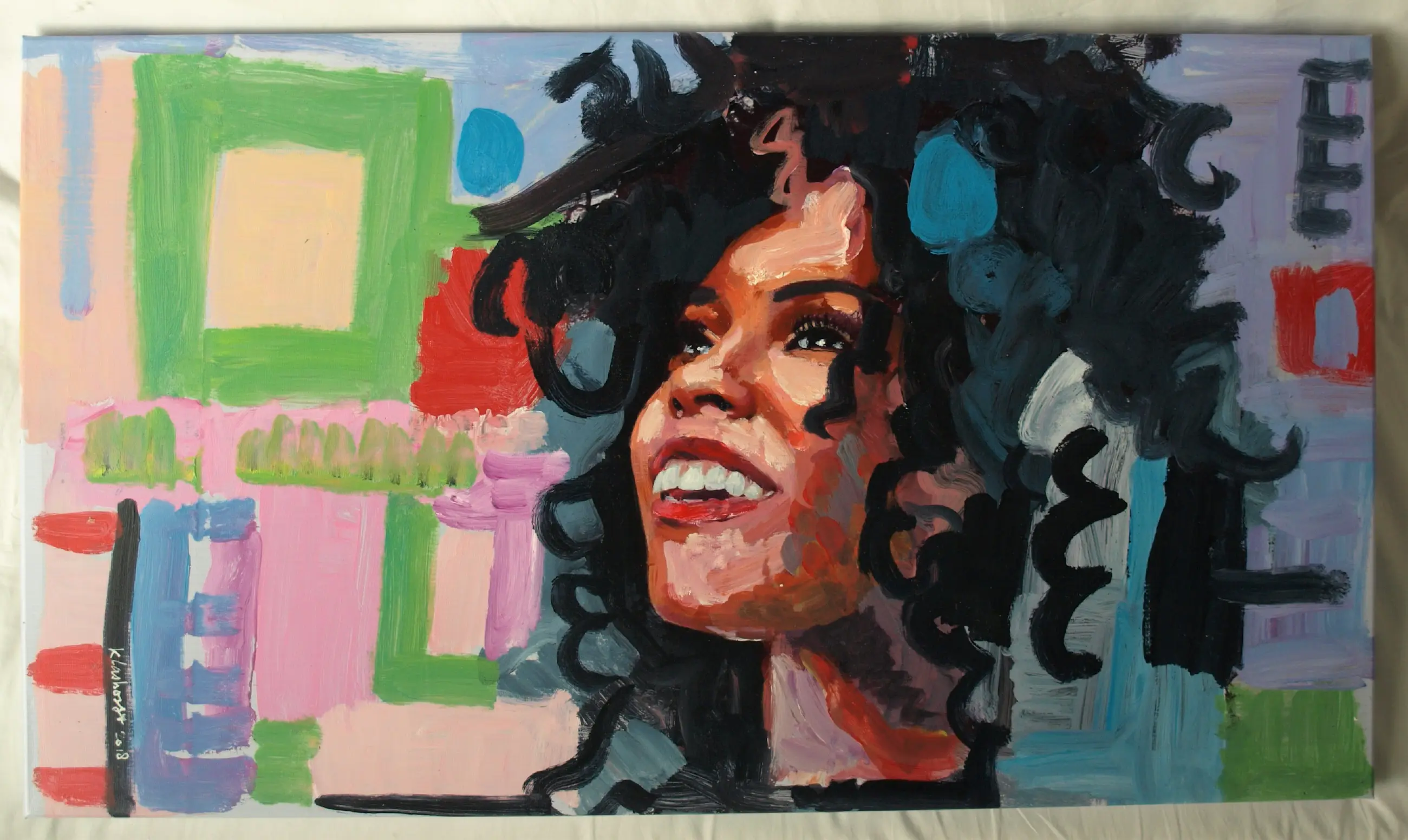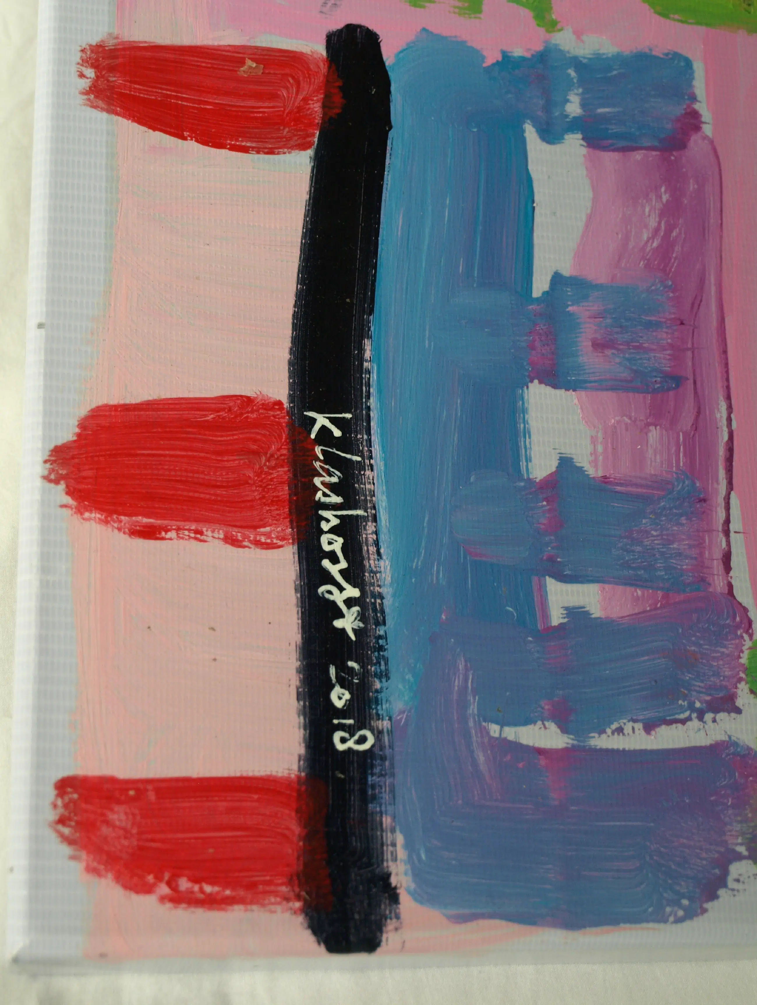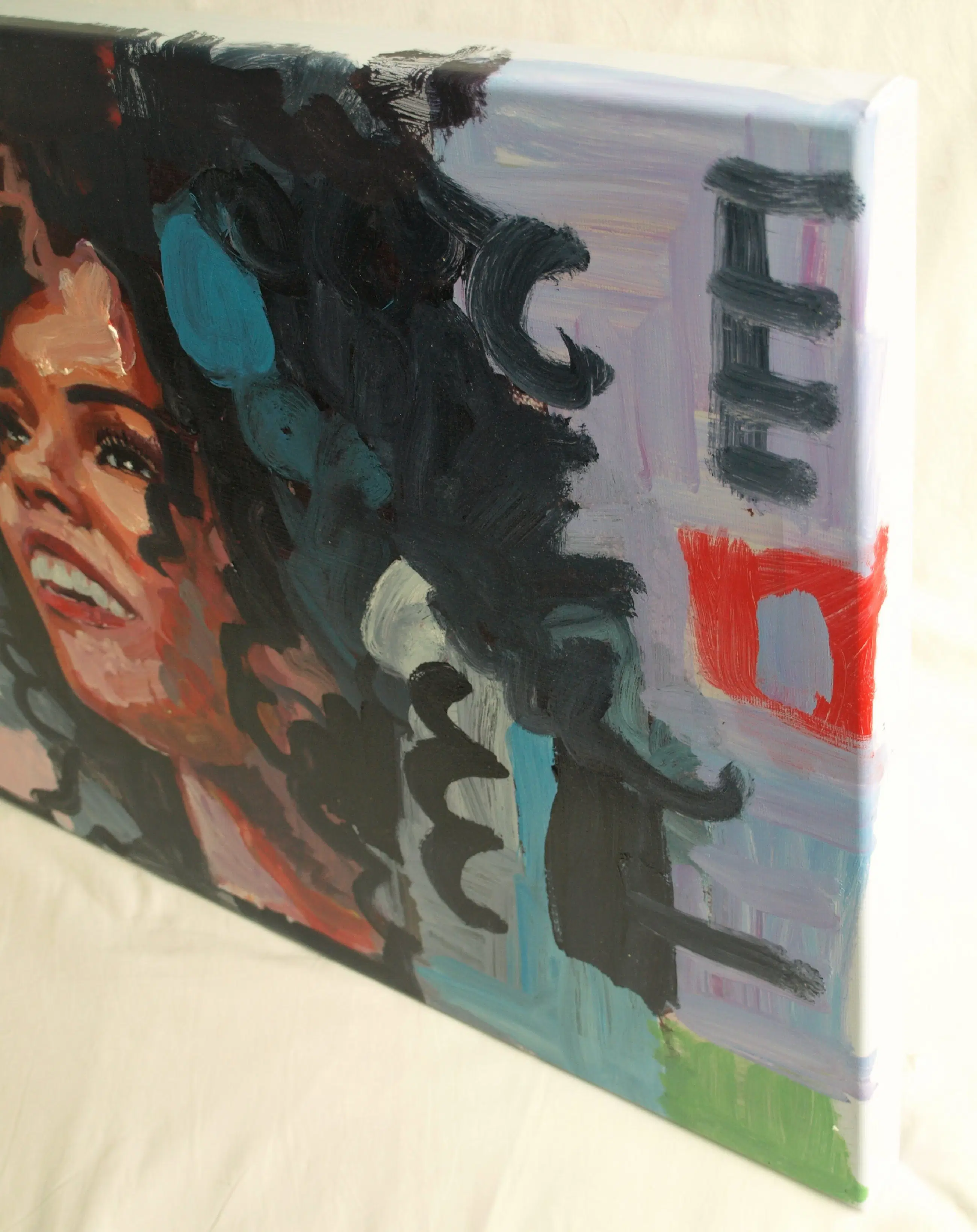 -Acrylverf op bisonyl-doek, opgespannen op een dik houten frame. Het frame heeft een ophangsysteem en het werk kan zo aan de muur.