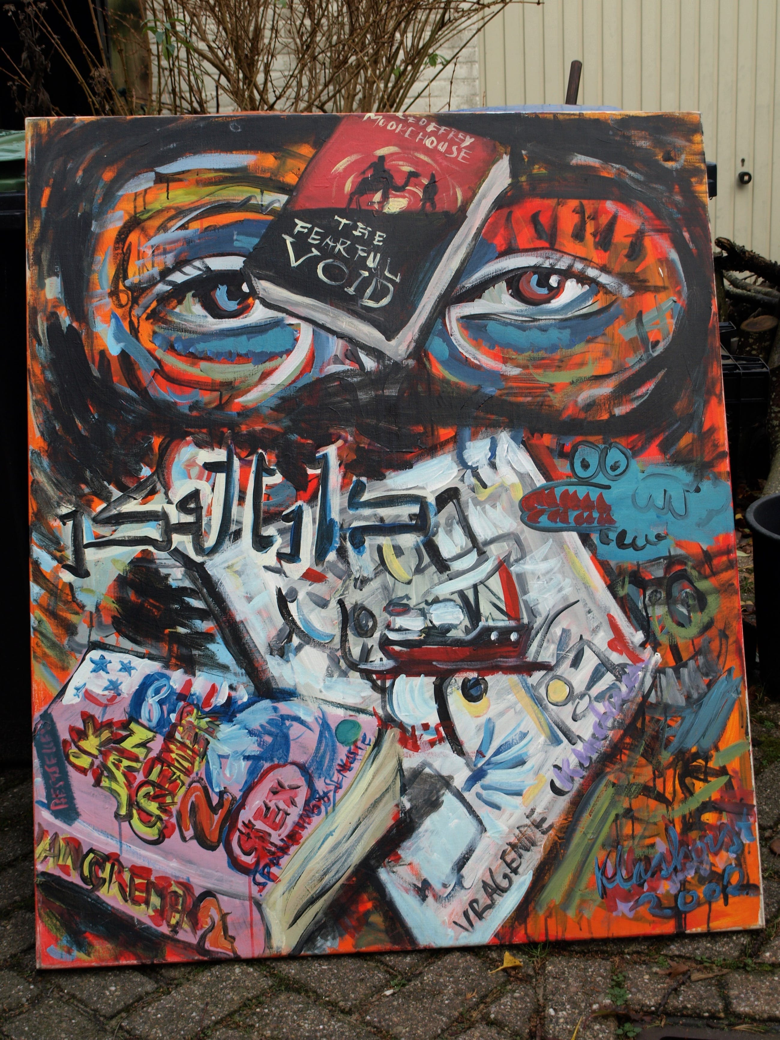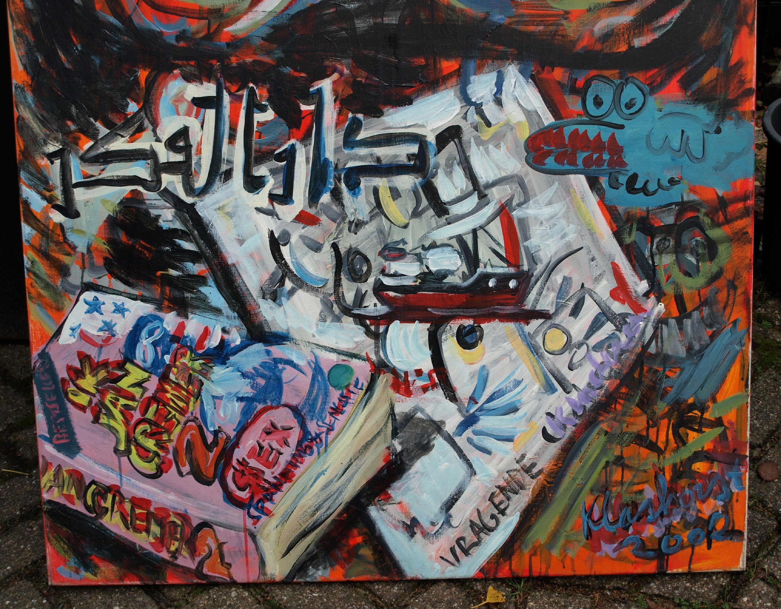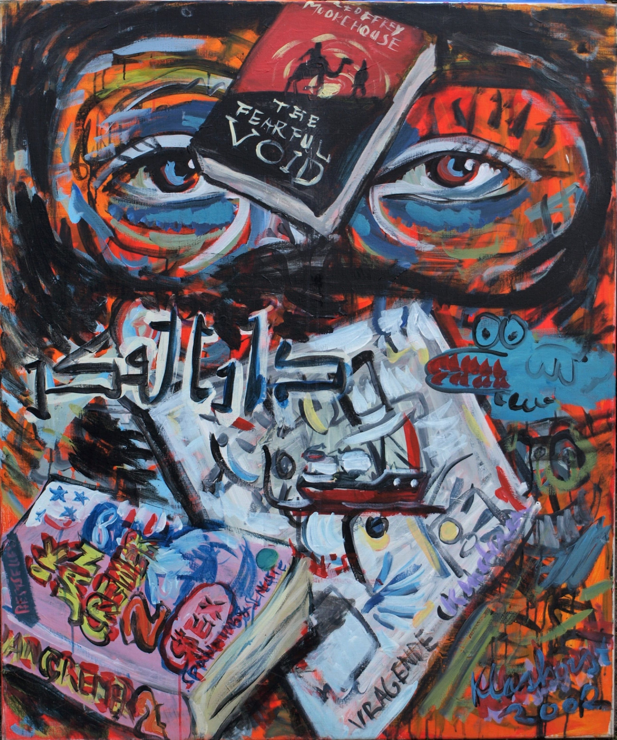 Een groot topwerk uit 2002 van de Nederlandse kunstenaar Peter Klashorst (1957), met een voorstelling waarbij de kunstenaar geïnspireerd lijkt door 2 boeken: