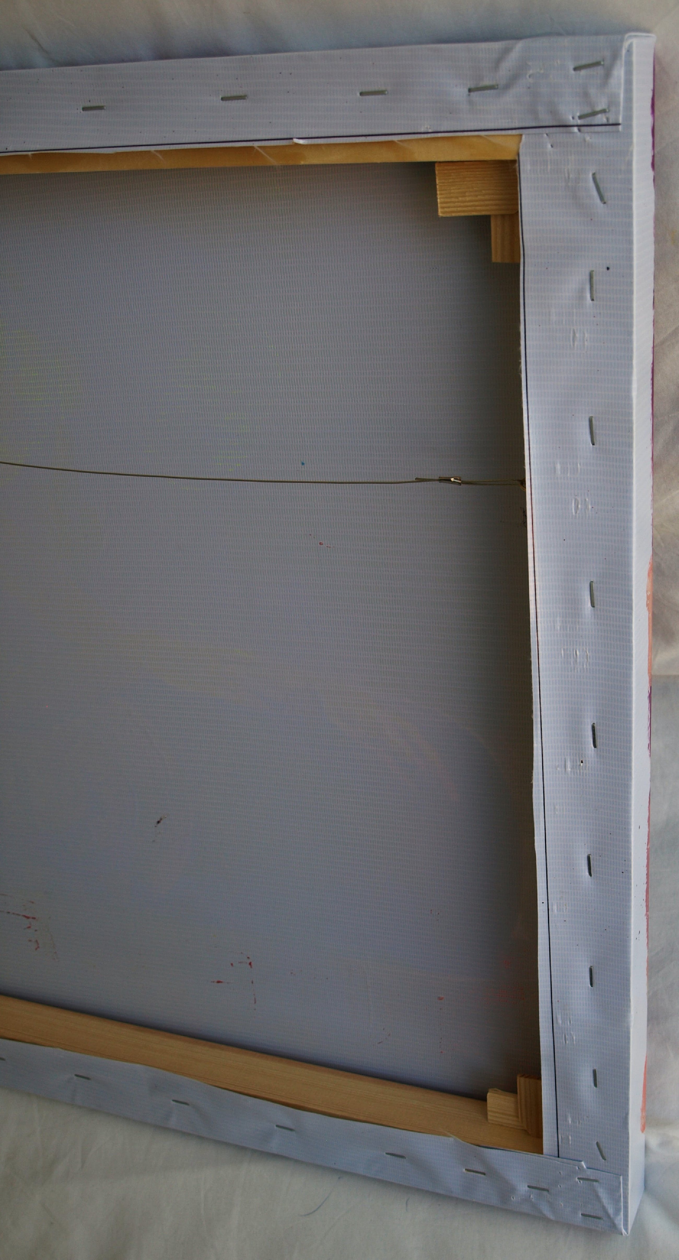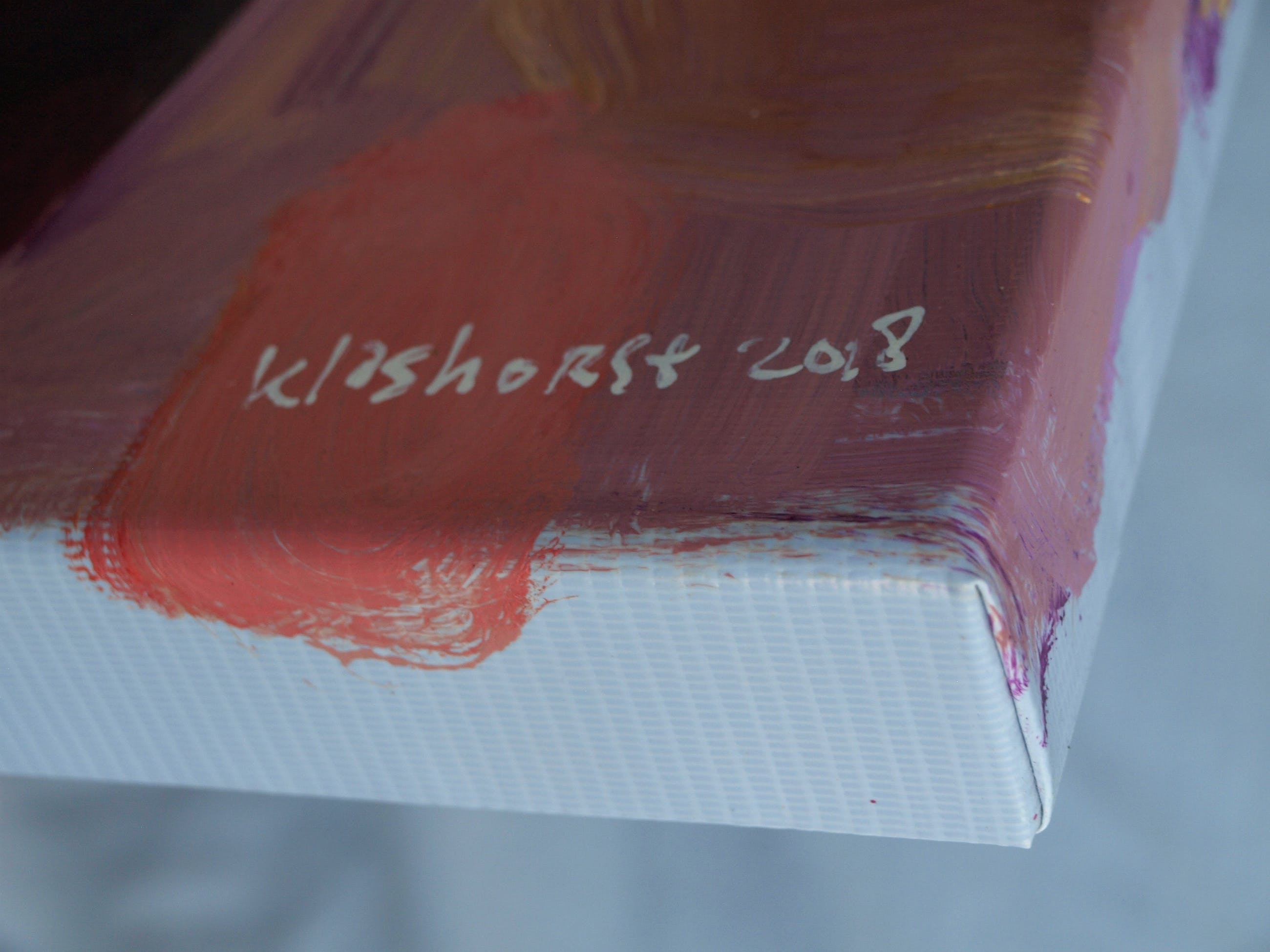 -Acrylverf op doek, opgespannen op een dik, stevig houten frame. Bedoeld om zo aan de muur te hangen.
