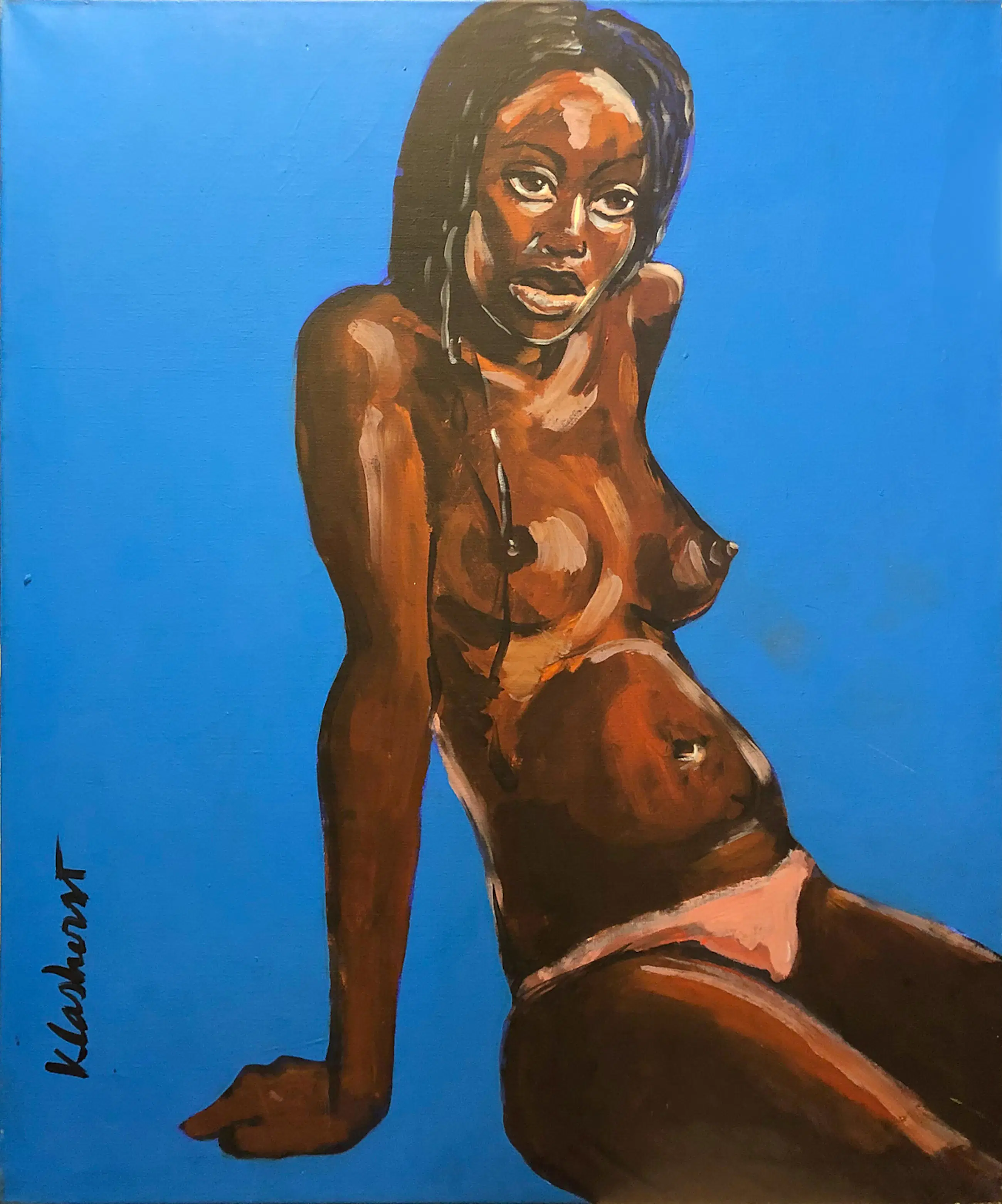 PETER KLASHORST African Woman (Blue) Acryl op doek 100 x 120 cm Expressief portret uit Klashorsts Afrikaanse periode. Levendige New Wild Ones-stijl, geïnspireerd op reizen en confrontatie. Perfecte conditie, uit privécollectie.