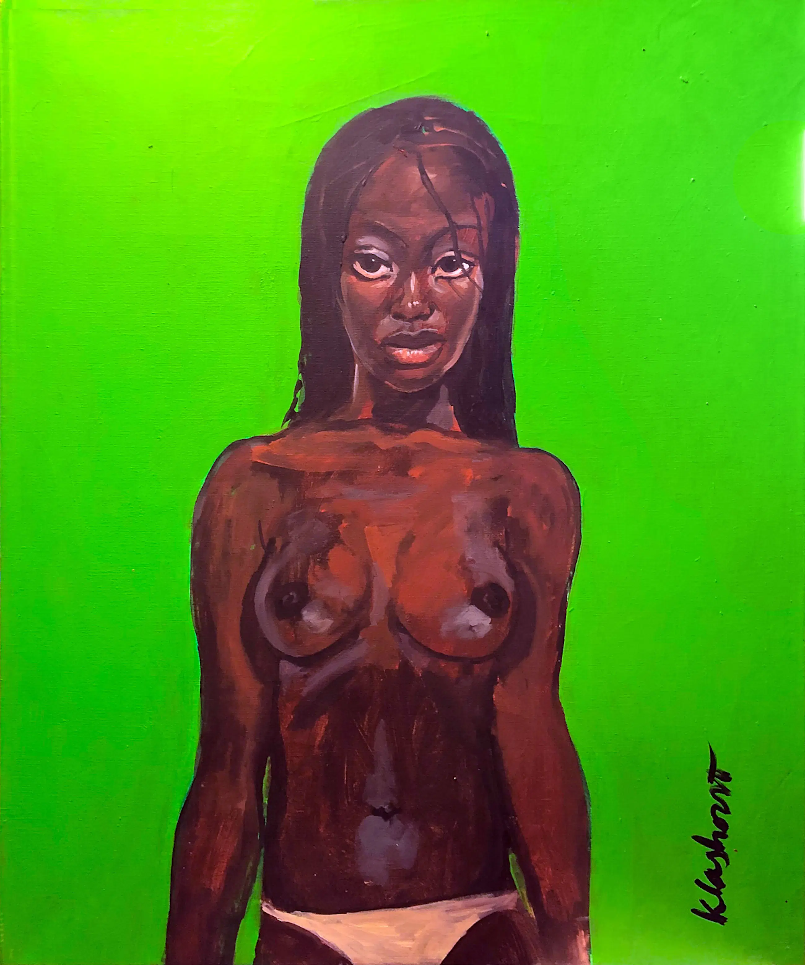 PETER KLASHORST African Woman (Green) Acryl op doek 100 x 120 cm Expressief portret uit Klashorsts Afrikaanse periode. Levendige New Wild Ones-stijl, geïnspireerd op reizen en confrontatie. Perfecte conditie, uit privécollectie.