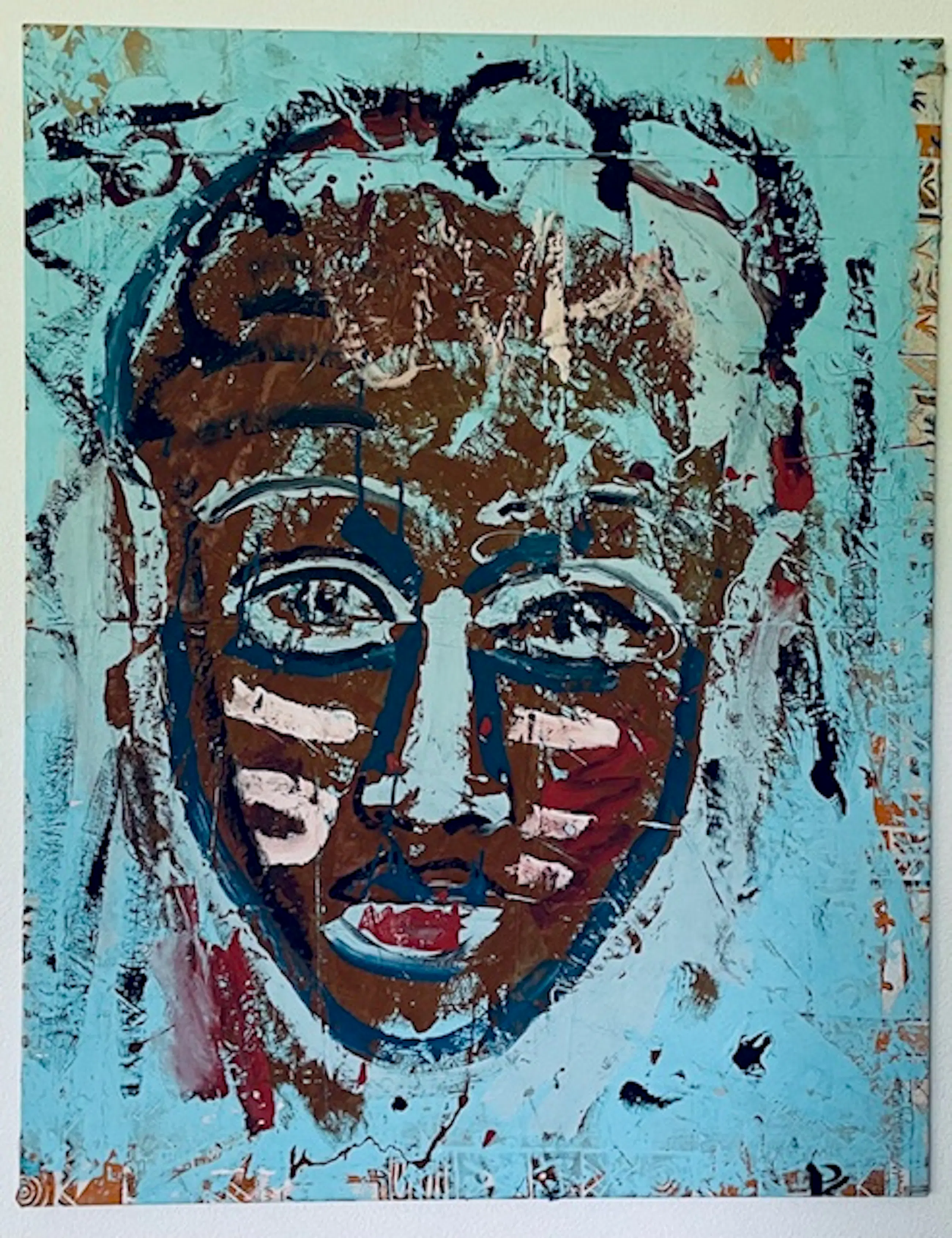 Titel: Lady on Blue Afmeting beeldformaat 115x90x2 cm Dikke lagen acrylverf op sterk batikdoek en gespannen op een stevig frame. Kan direct aan de muur! Handgesigneerd uit 1999