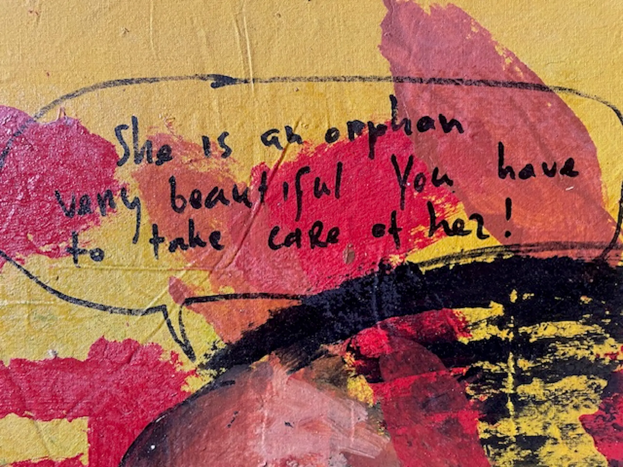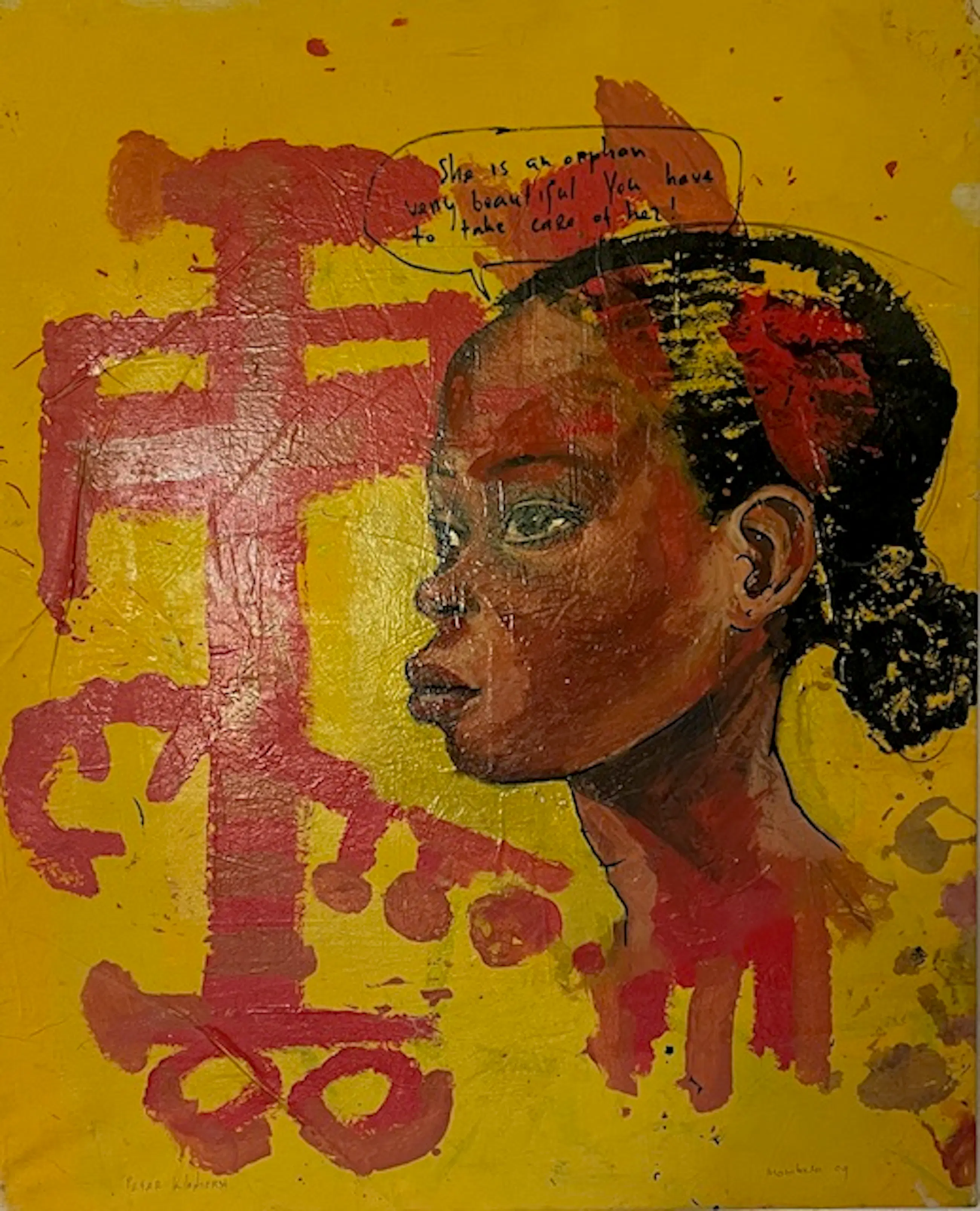 Titel: Lady on Yellow Afmeting beeldformaat 100x80x2 cm Dikke lagen acrylverf op sterk doek en gespannen op een stevig frame. Kan direct aan de muur! Handgesigneerd uit 2009