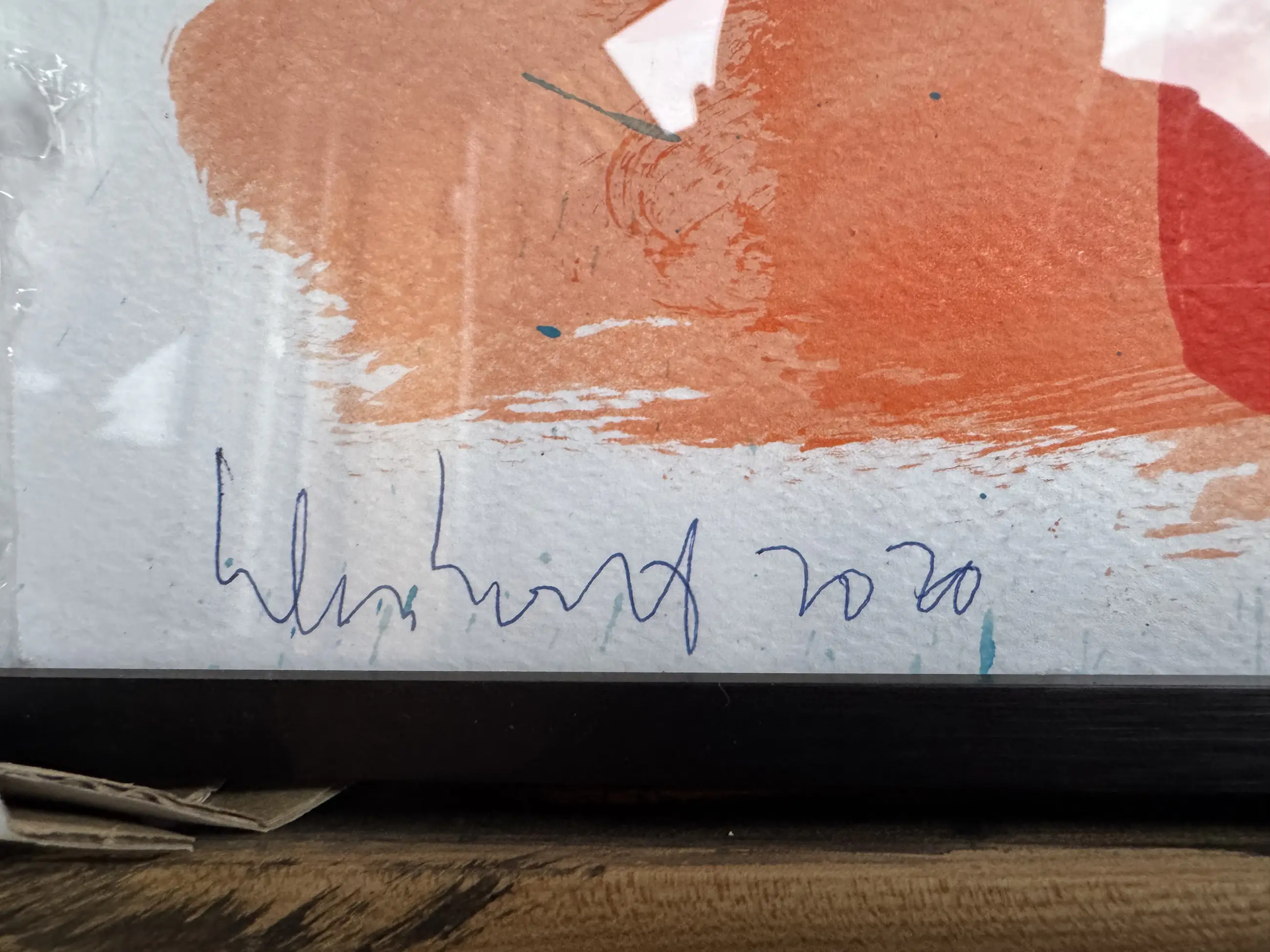 Het papier is vlak, met lichte golving door de acrylverf (typisch voor techniek).
