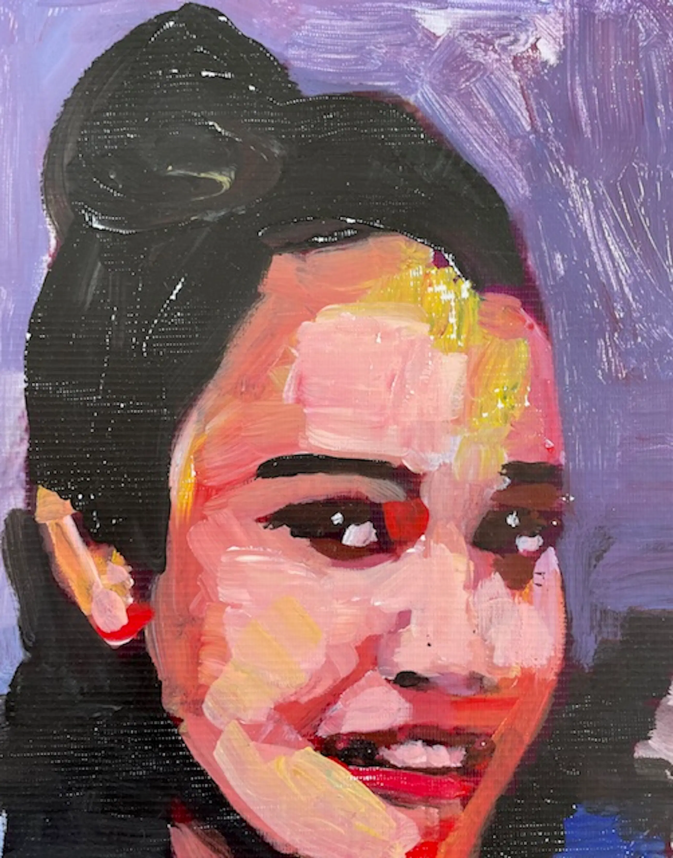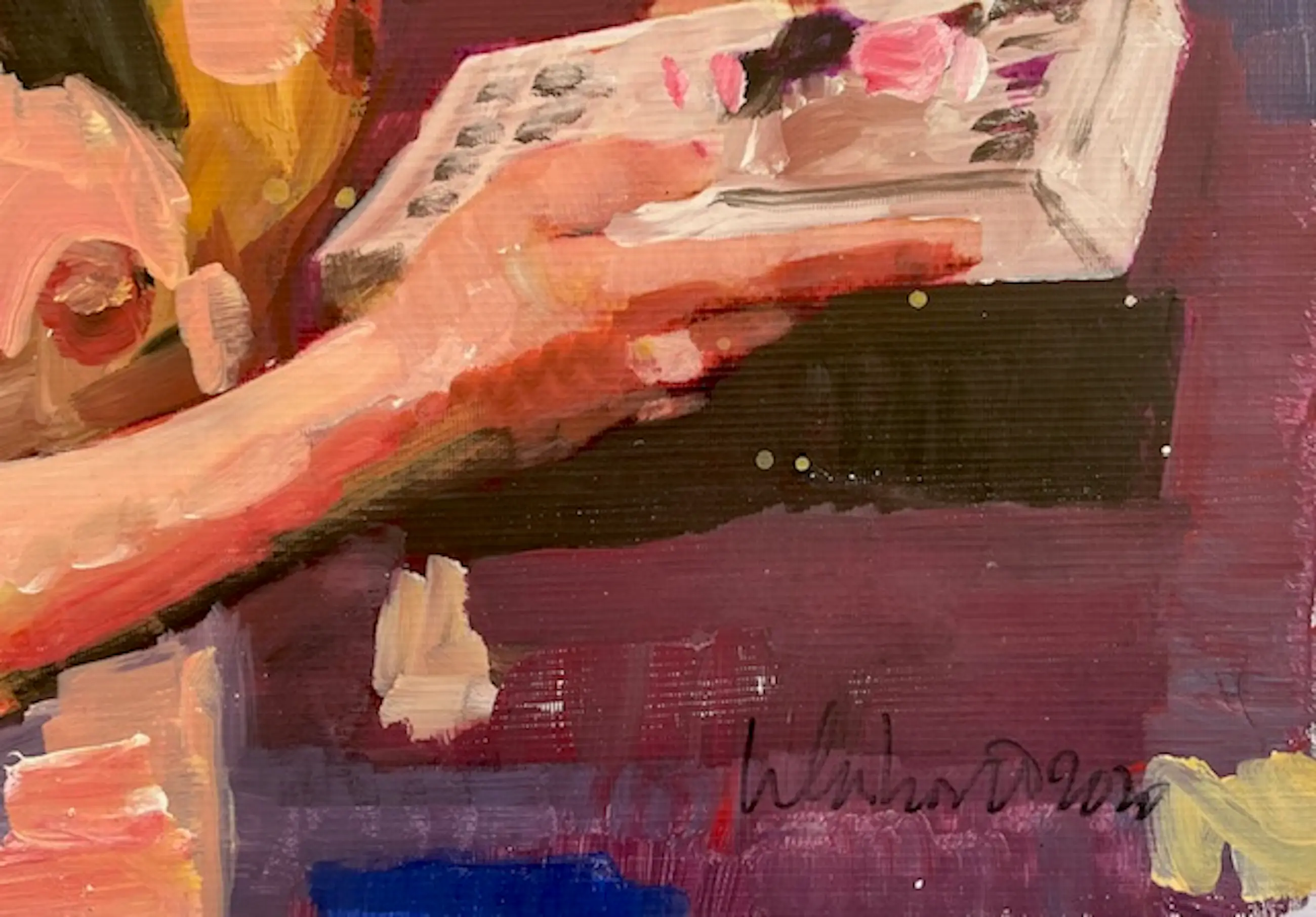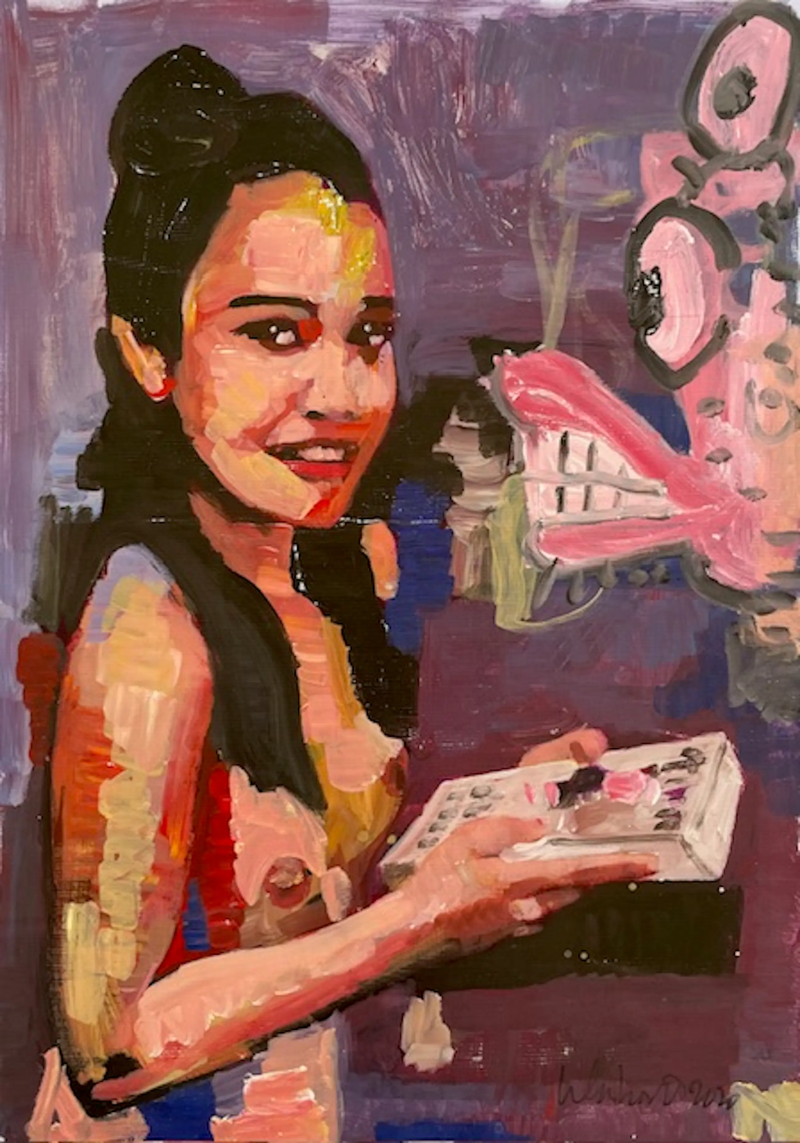 Titel: Erudiet Afmeting beeldformaat circa 90x70 cm Dikke lagen acrylverf op bisonyl uit 2020 Handgesigneerd