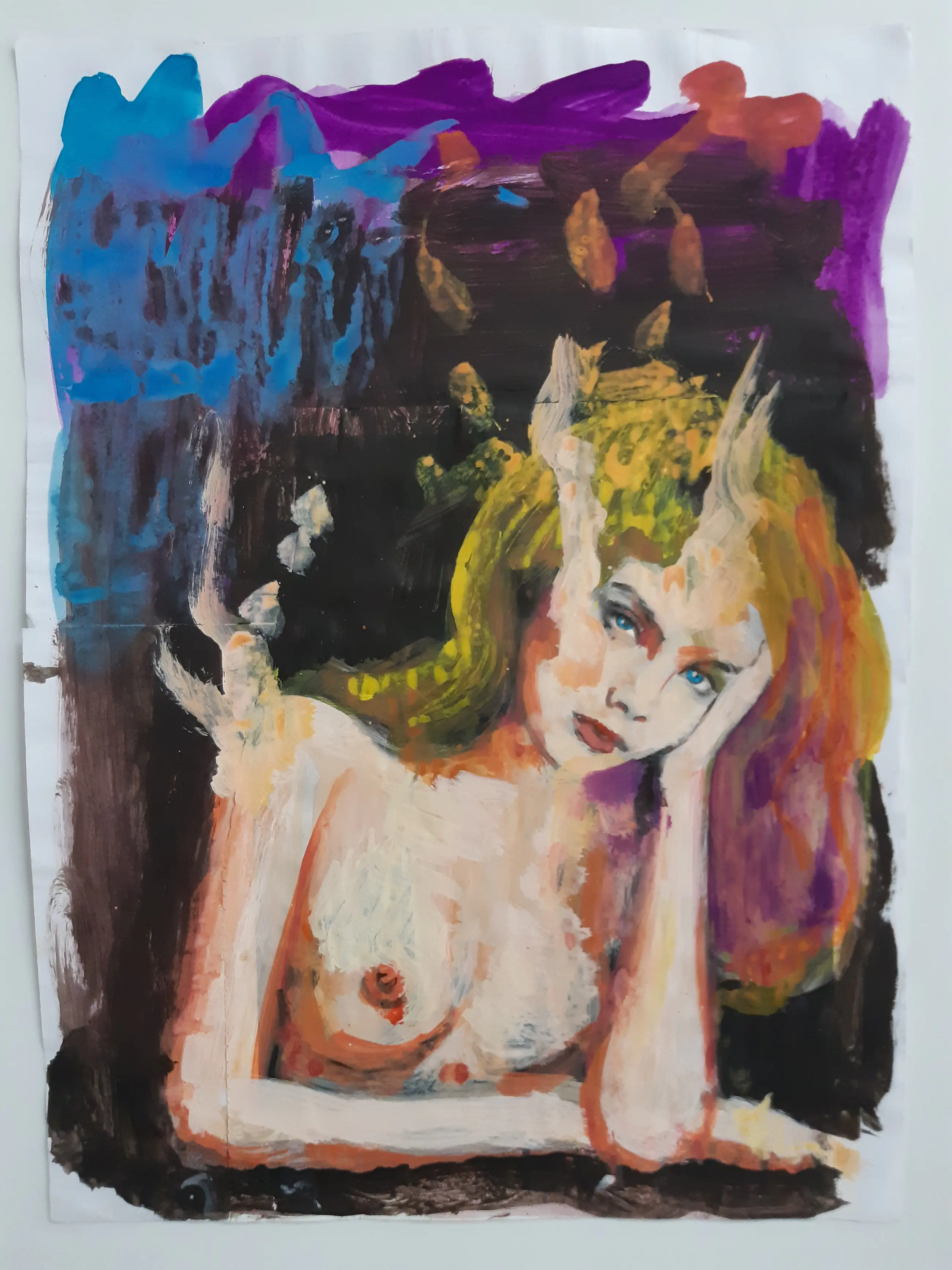 Peter Klashorst. Titel : " Girl on fire ". Techniek : Gemengde techniek op papier. Formaat : 42 x 30 cm. Gemaakt door Peter met twee vellen papier aan elkaar. Handgesigneerd Verso : Peter Klashorst 2016.
