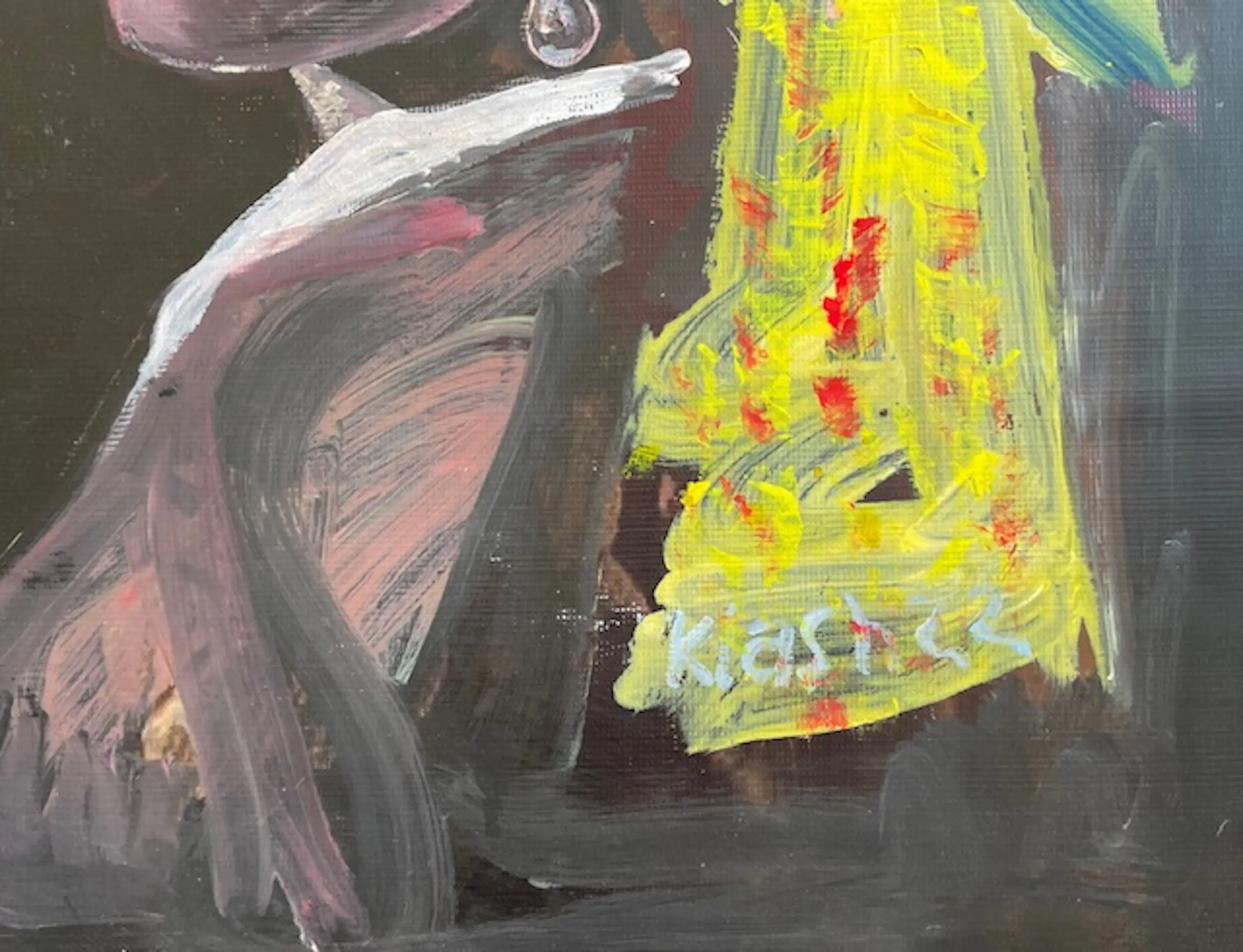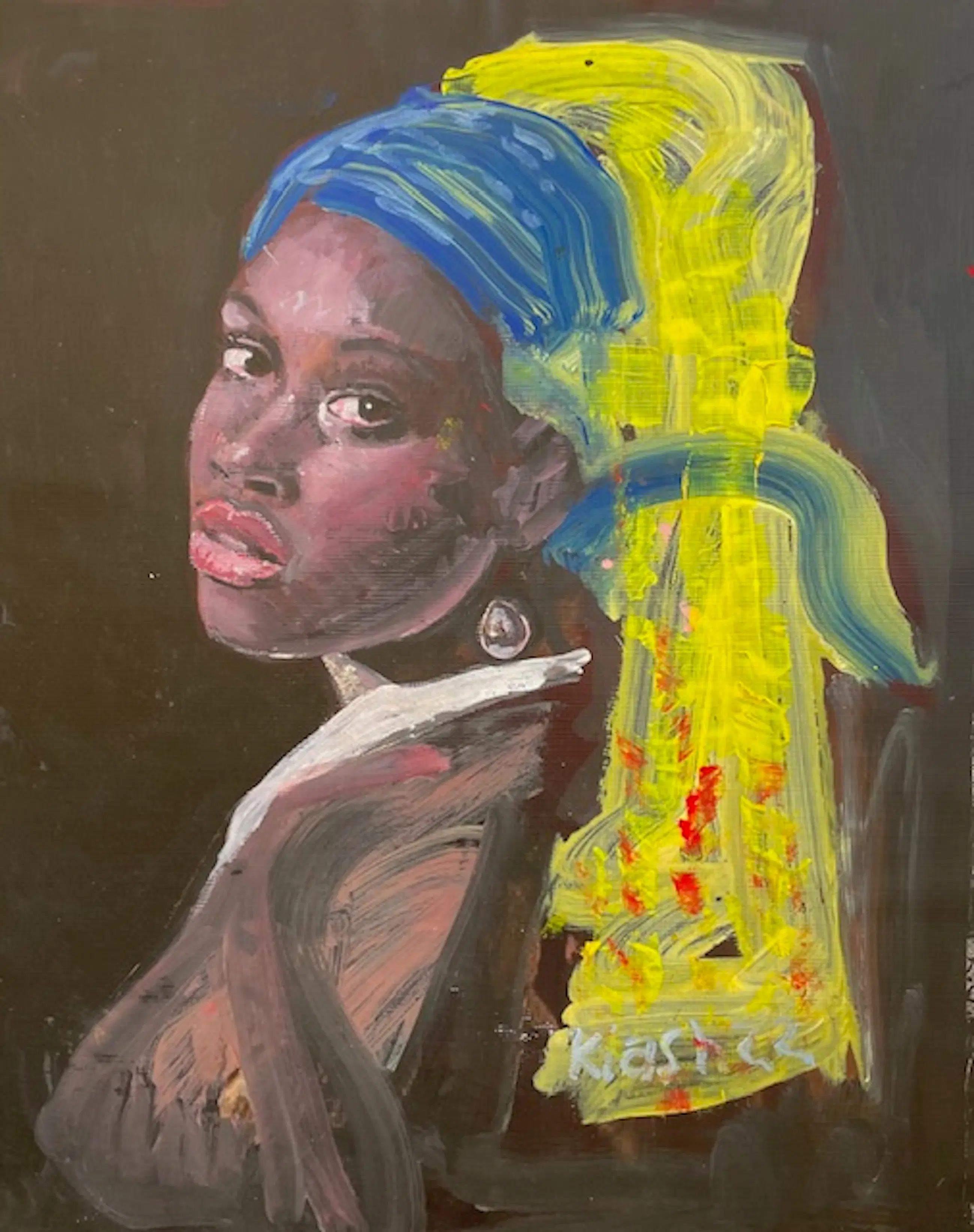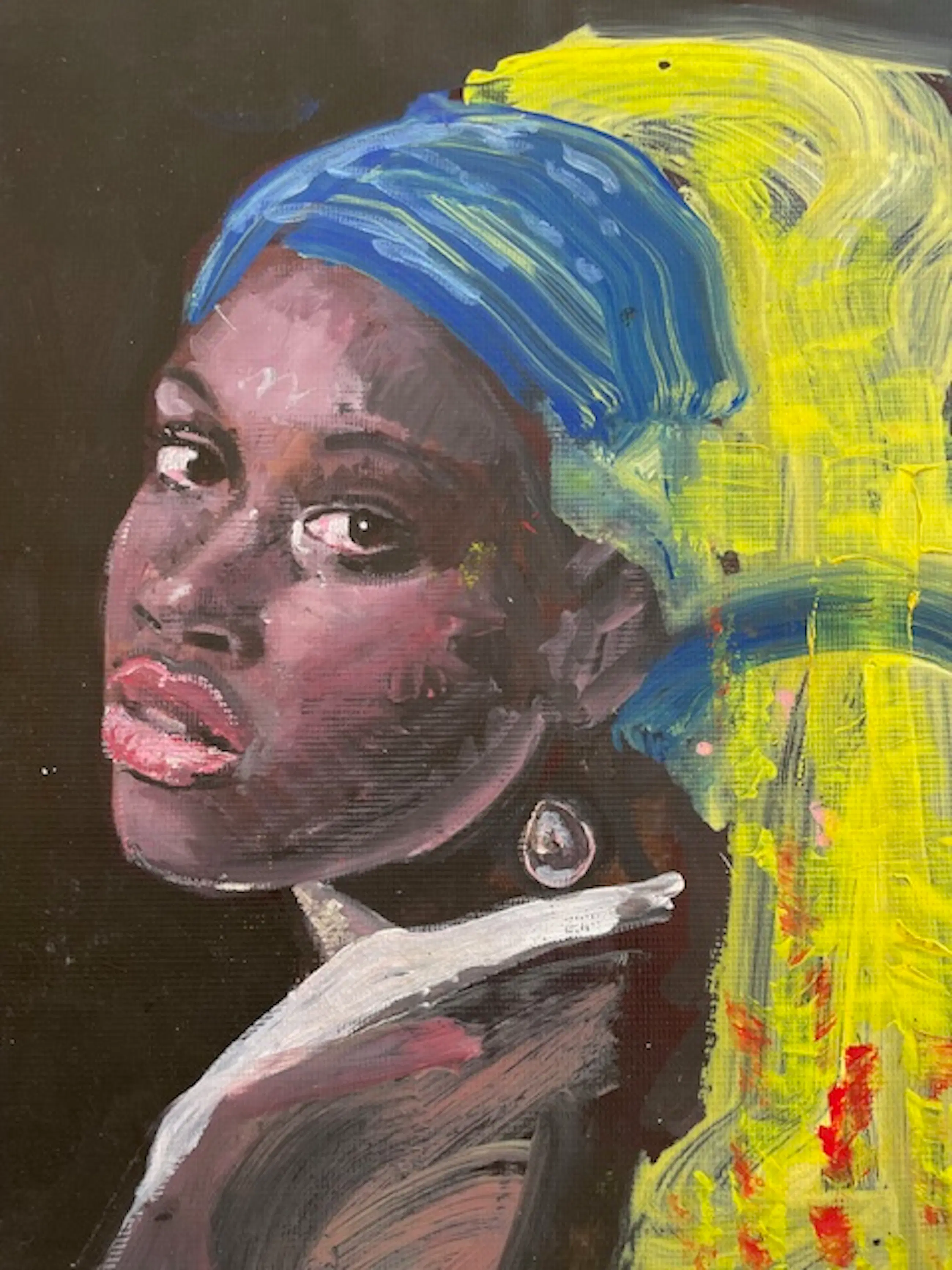 Titel: Meisje met de Parel Afmeting beeldformaat circa 100x80 cm Dikke lagen acrylverf op bisonyl uit 2022 Handgesigneerd