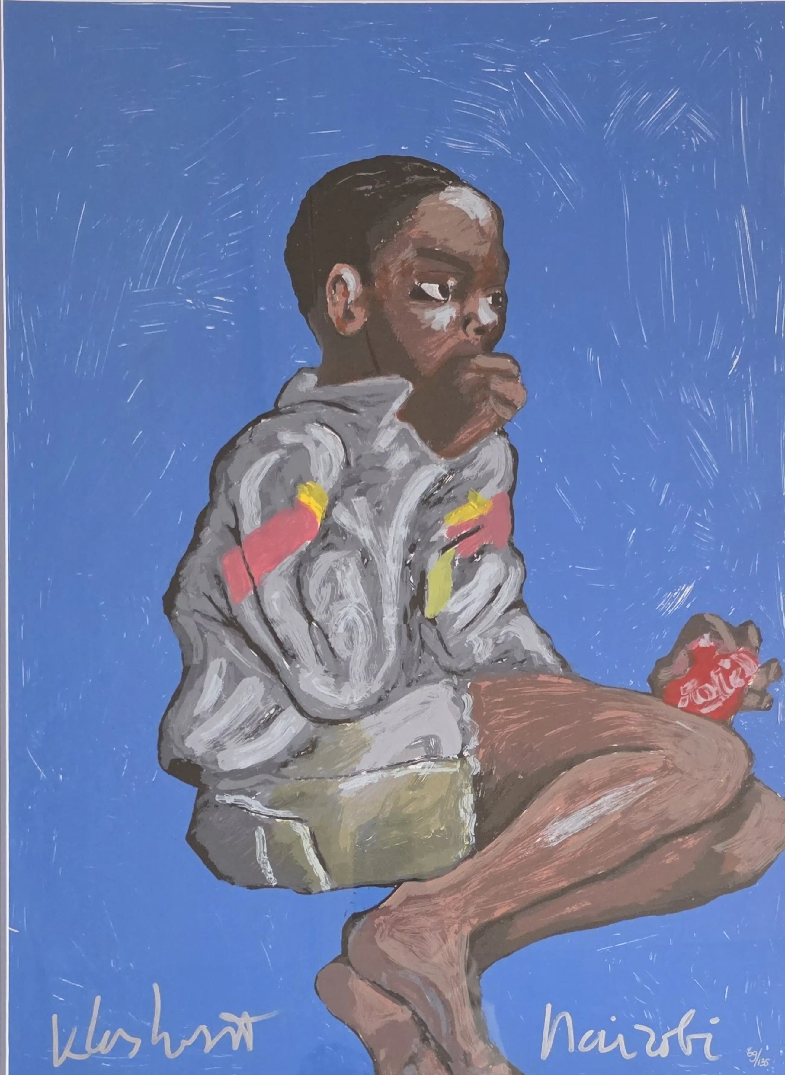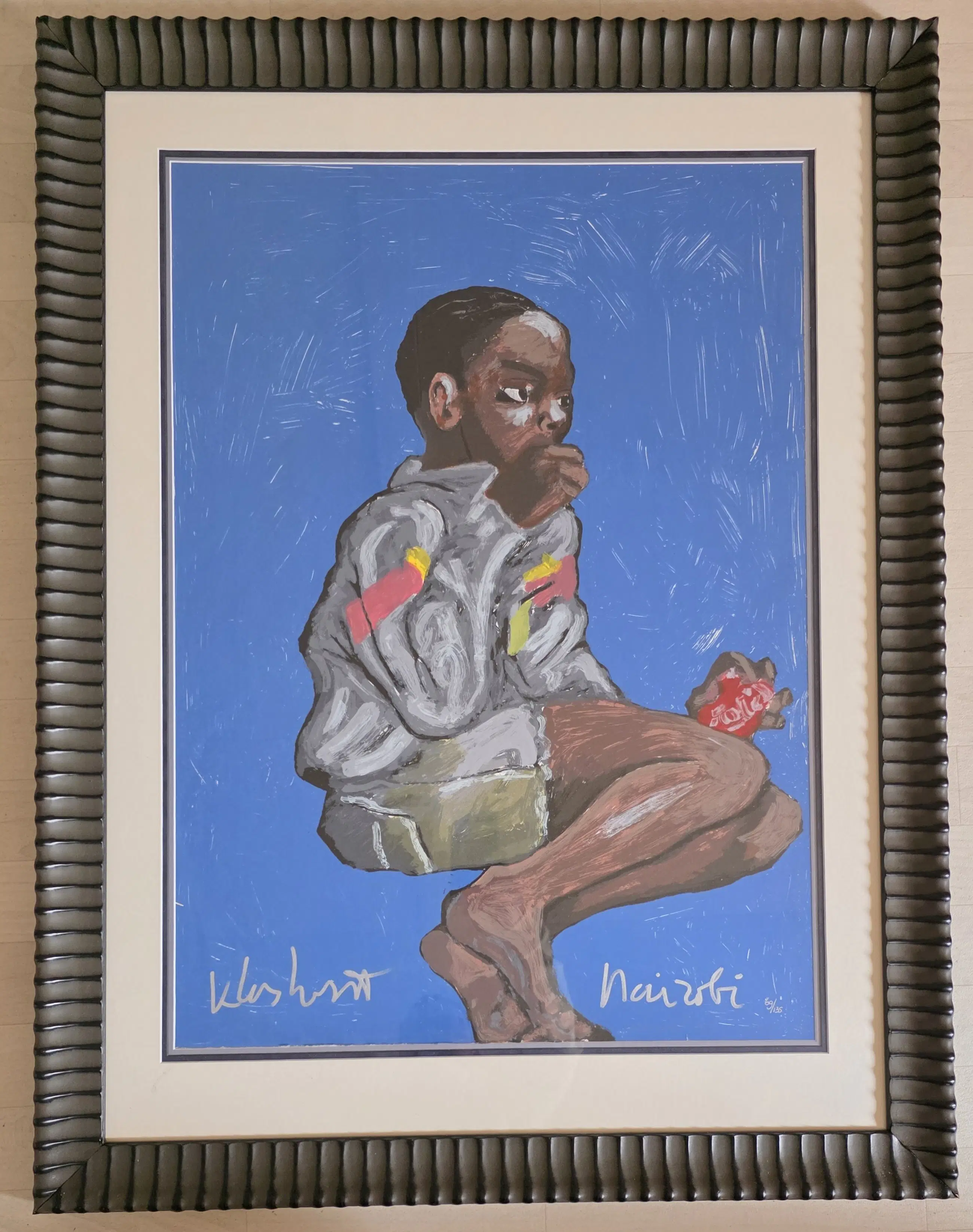 Handgesigneerde en genummerde zeefdruk van Peter Klashorst. Het nummer is 69/135. De afmeting inclusief lijst is 79x103 cm. Het is een afbeelding van een jongen met een rood voorwerp in zijn hand.