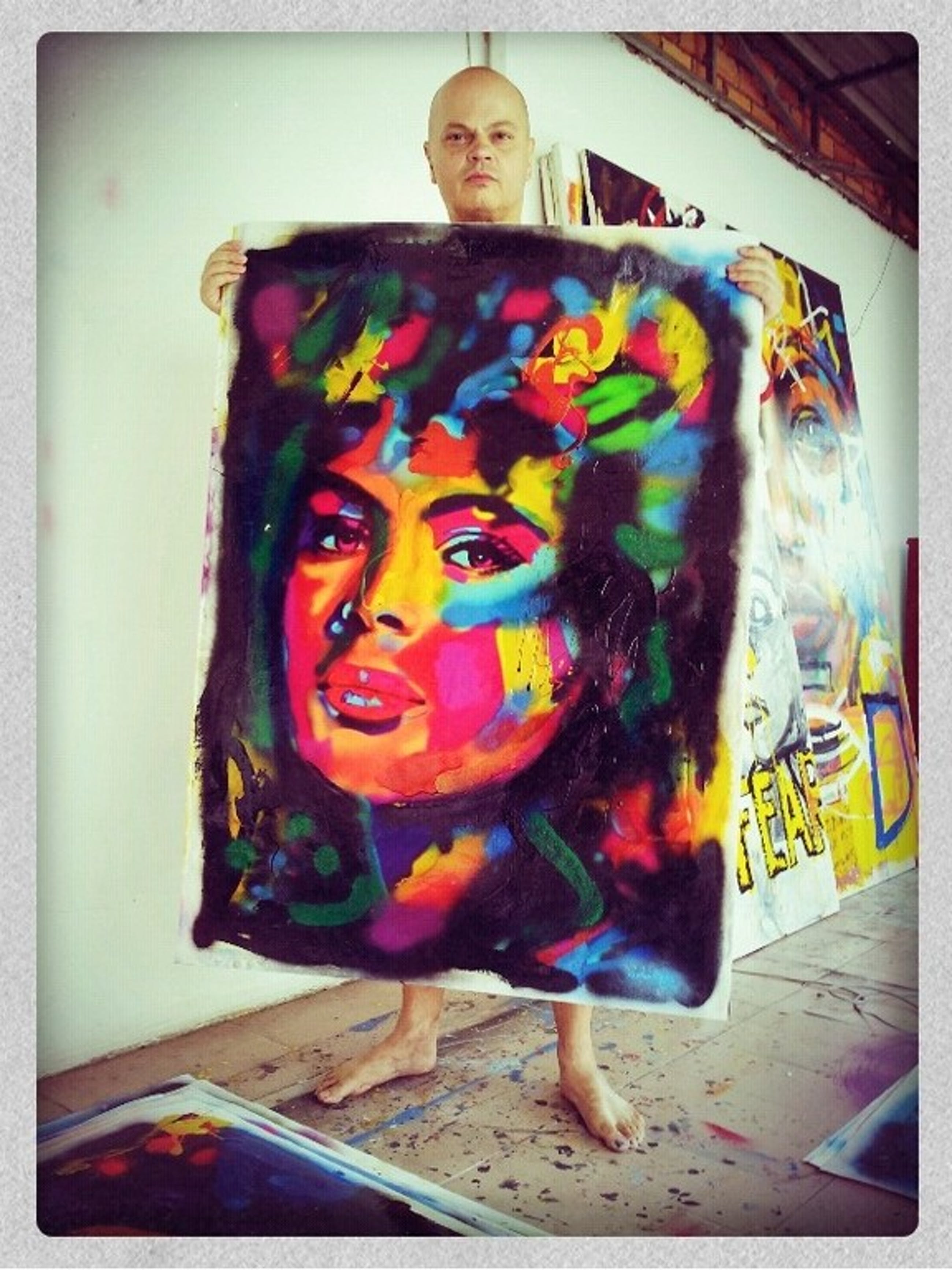 De gebruikte techniek is acrylverf, industriele lakverf en spuitbusverf op een doek van dik katoen. Het werk is gemaakt en gesigneerd (Phnom Phen / Cambodja).