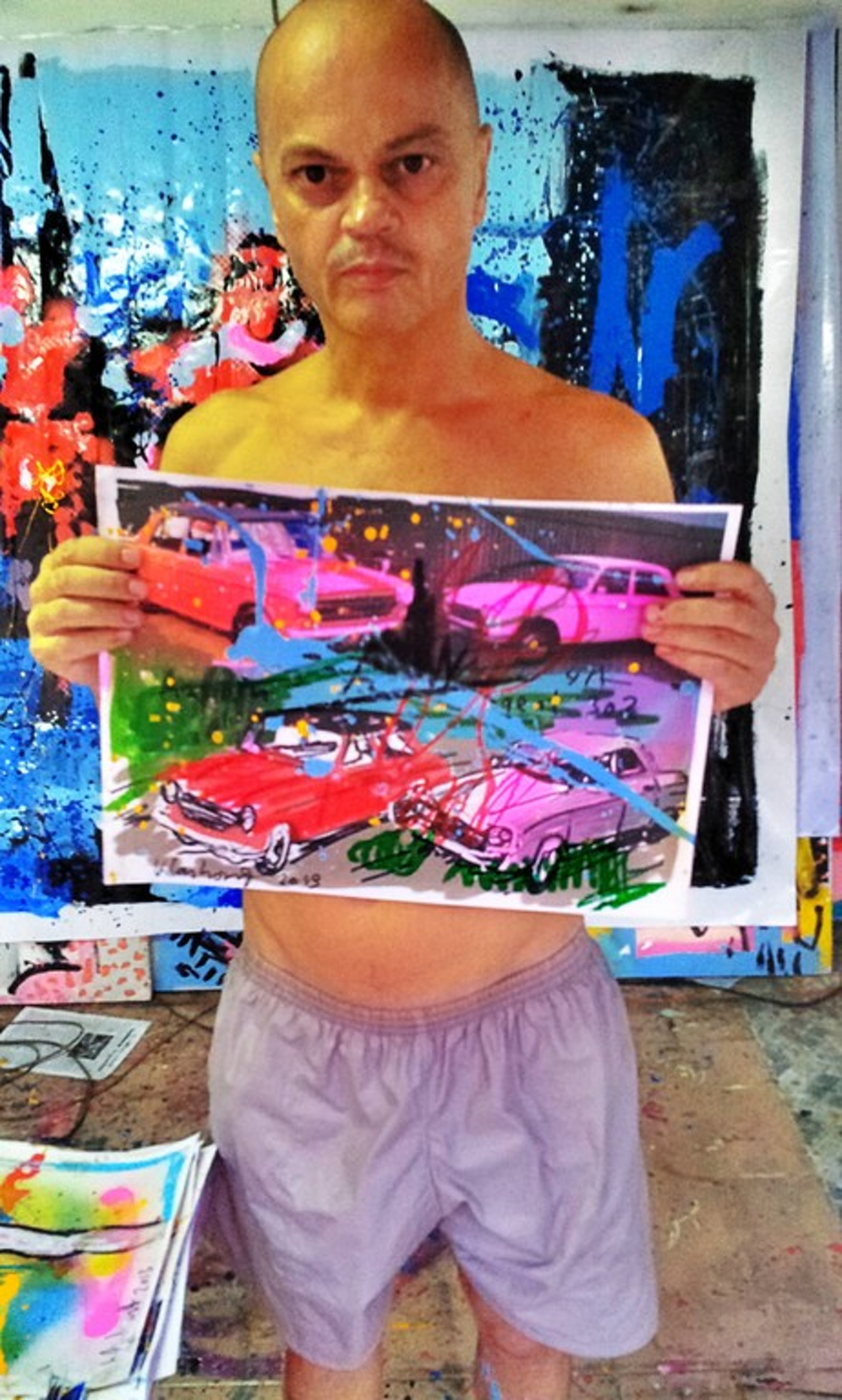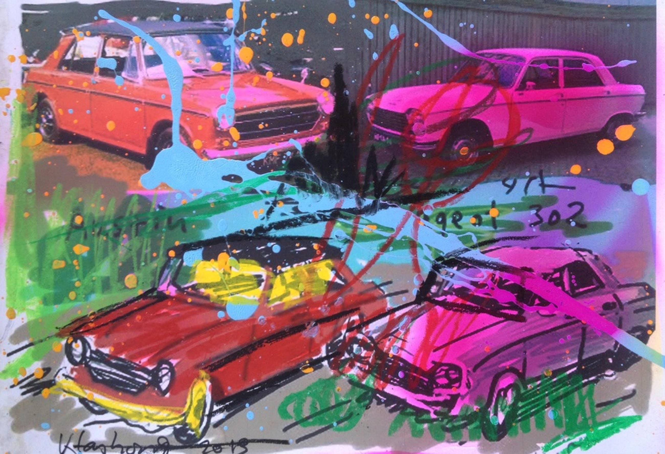 Betreft een collage van auto's op papier, digitale fotobewerking, spuitbus en acrylverf.