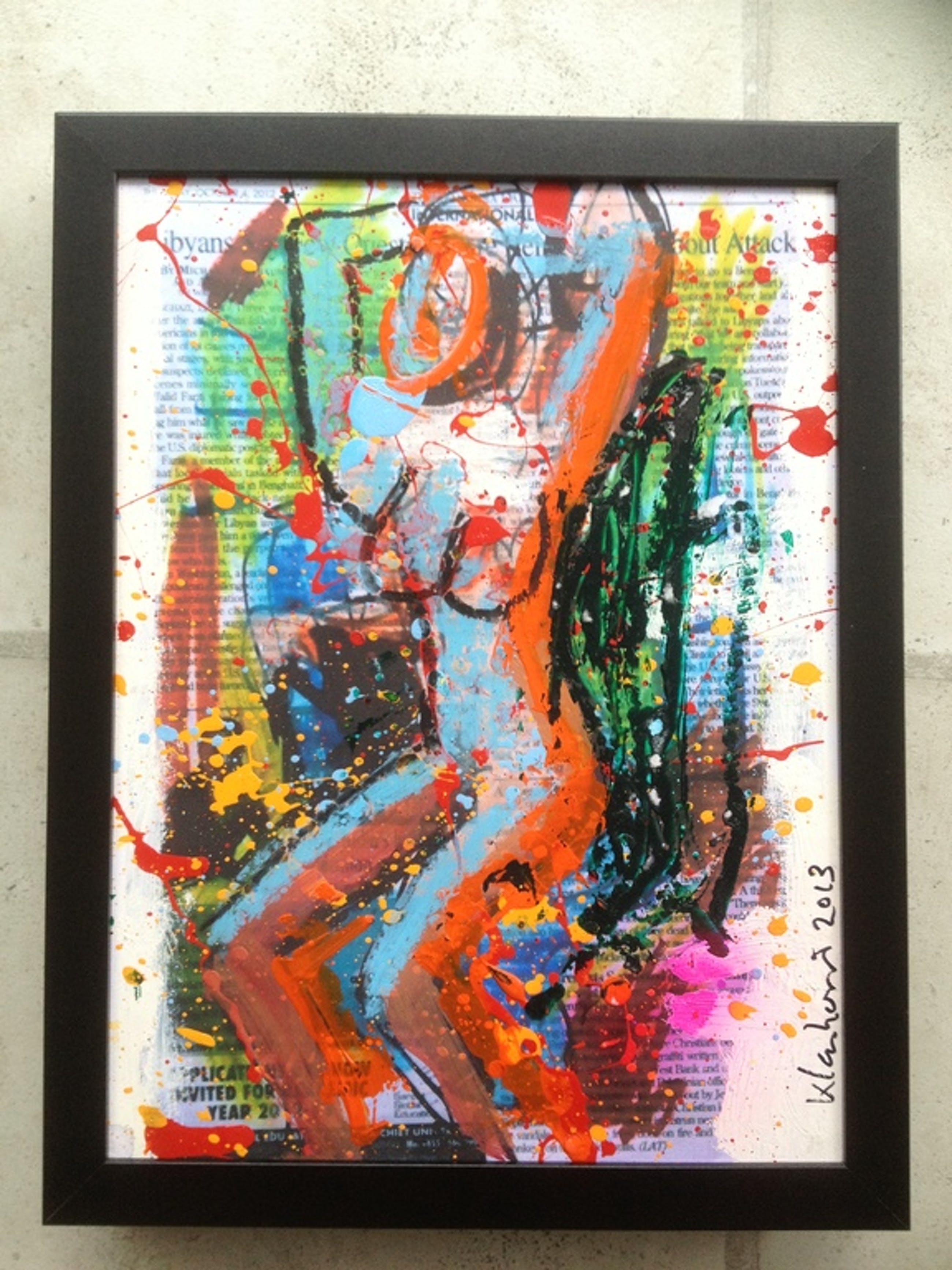 Mixed media waaronder acrylverf en spraycans op dik 200 grams papier. Het werk is gemaakt en gesigneerd (Phnom Phen / Cambodja).