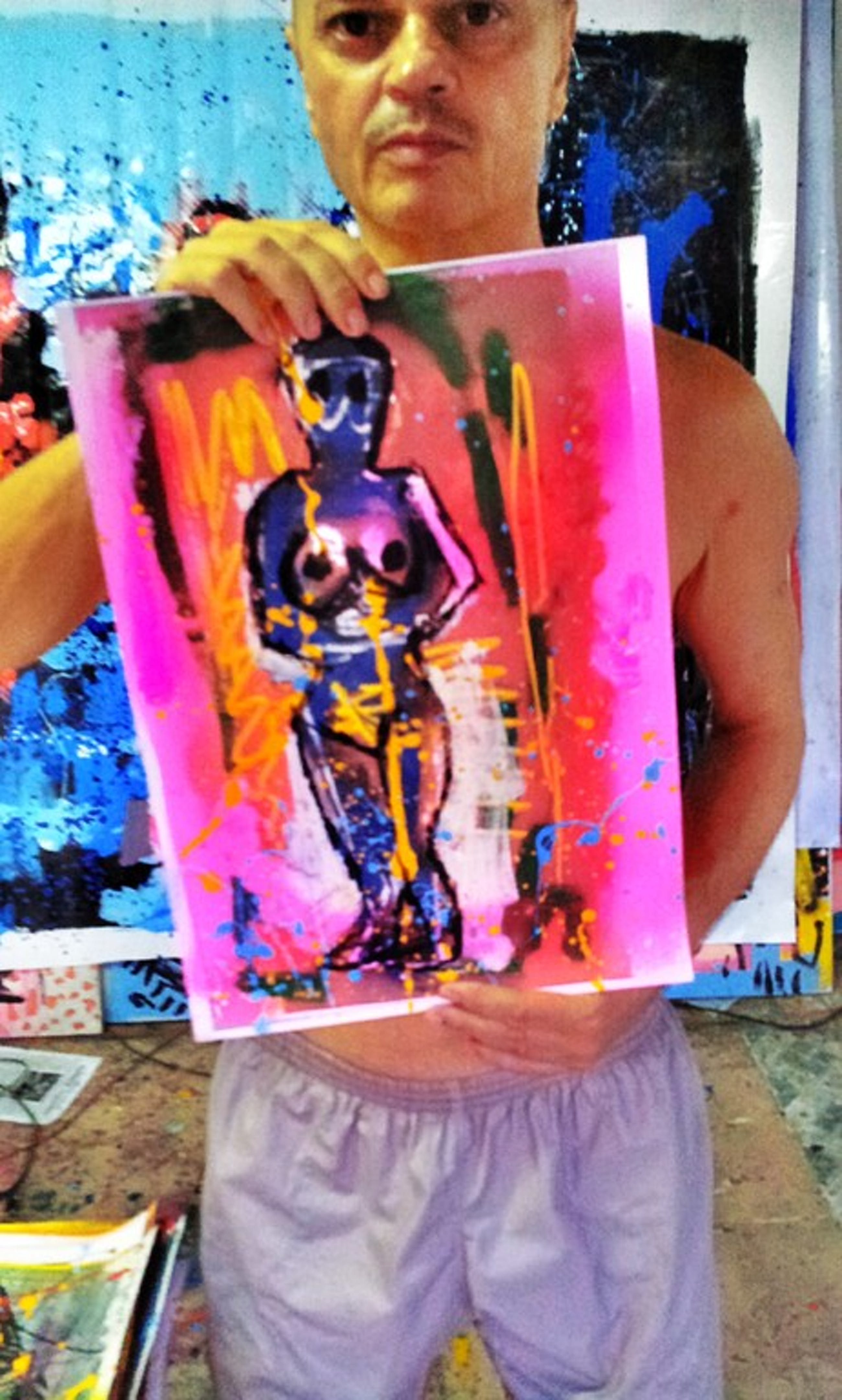 De gebruikte techniek is acrylverf en spuitbusverf op dik 200 grams papier. Het werk is gemaakt en gesigneerd (Phnom Phen / Cambodja).