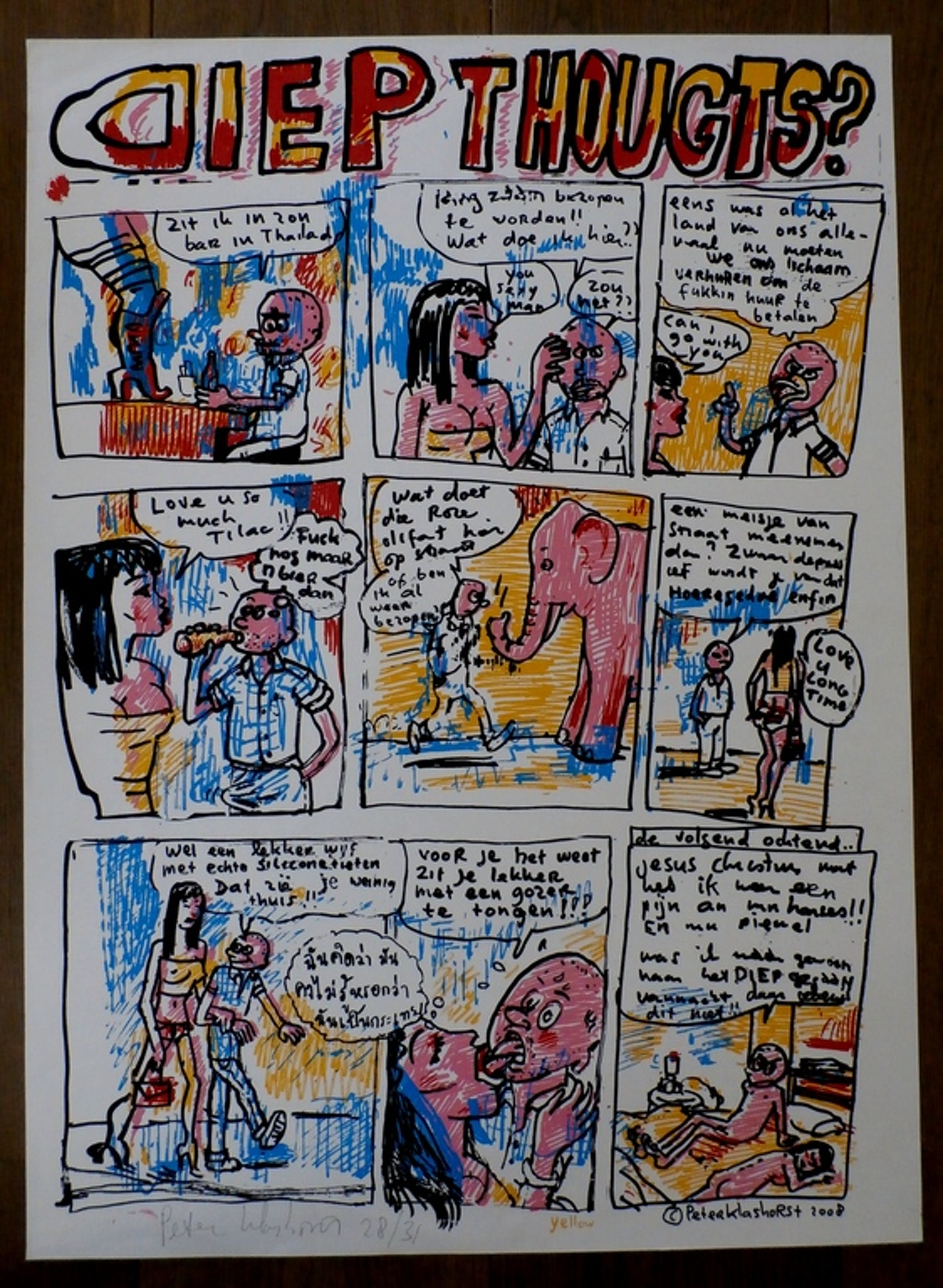 Zeefdruk van Peter Klashorst met de titel: Deep Thoughts. De zeefdruk is door de kunstenaar aan de onderzijde met potlood gesigneerd. Nummer: 28/31. Afmetingen: h76 x b56 cm. Jaar: 2008.