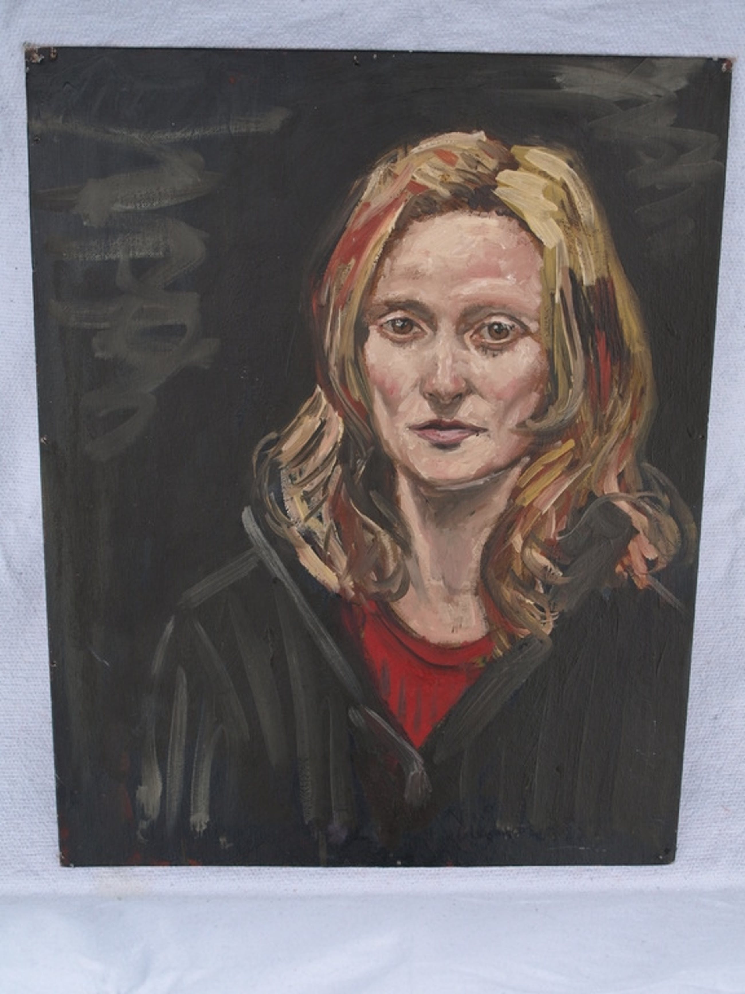 Een werk van Peter Klashorst uit ca 1998 met een portret van een blonde vrouw met een rood shirt.
