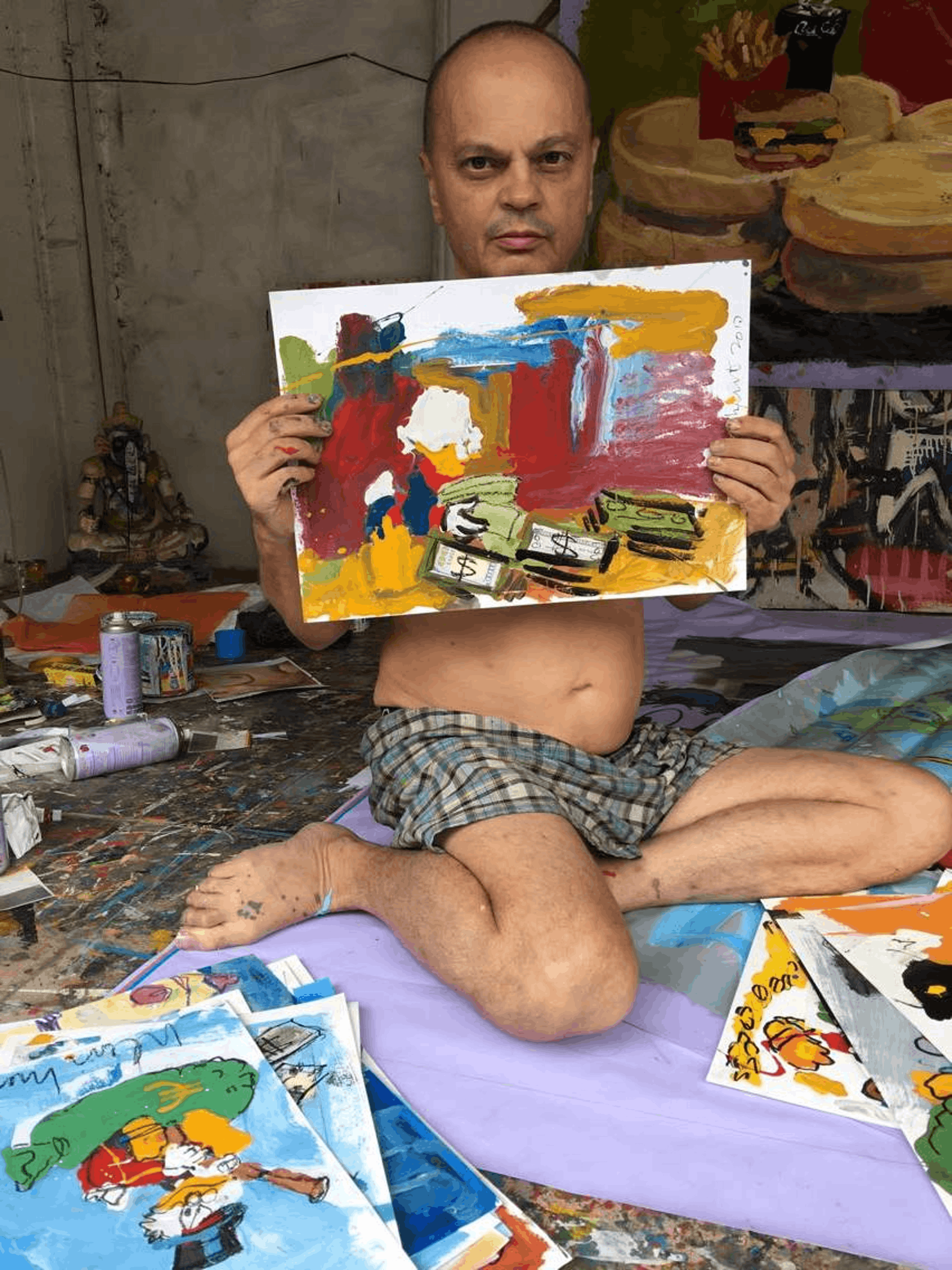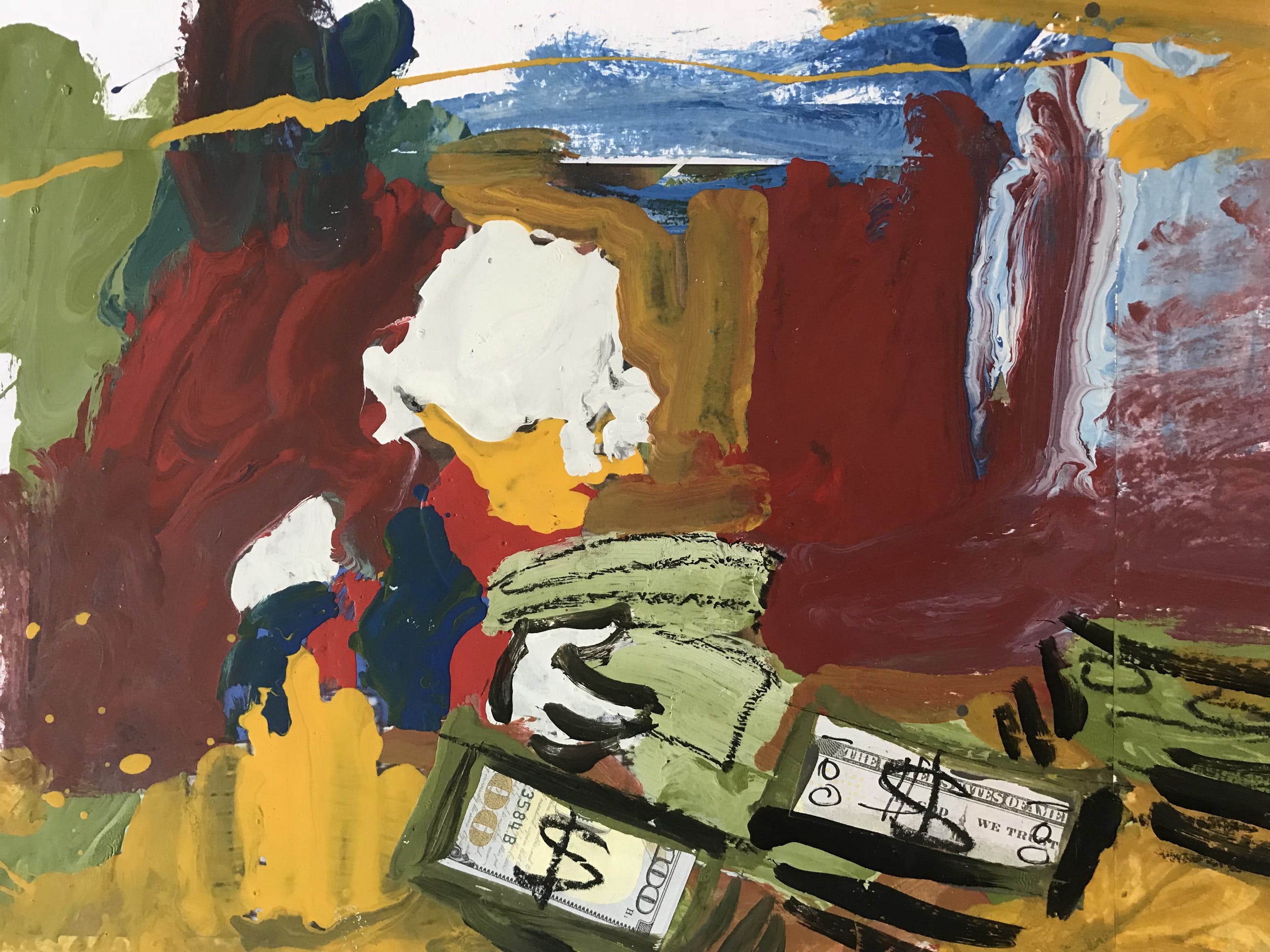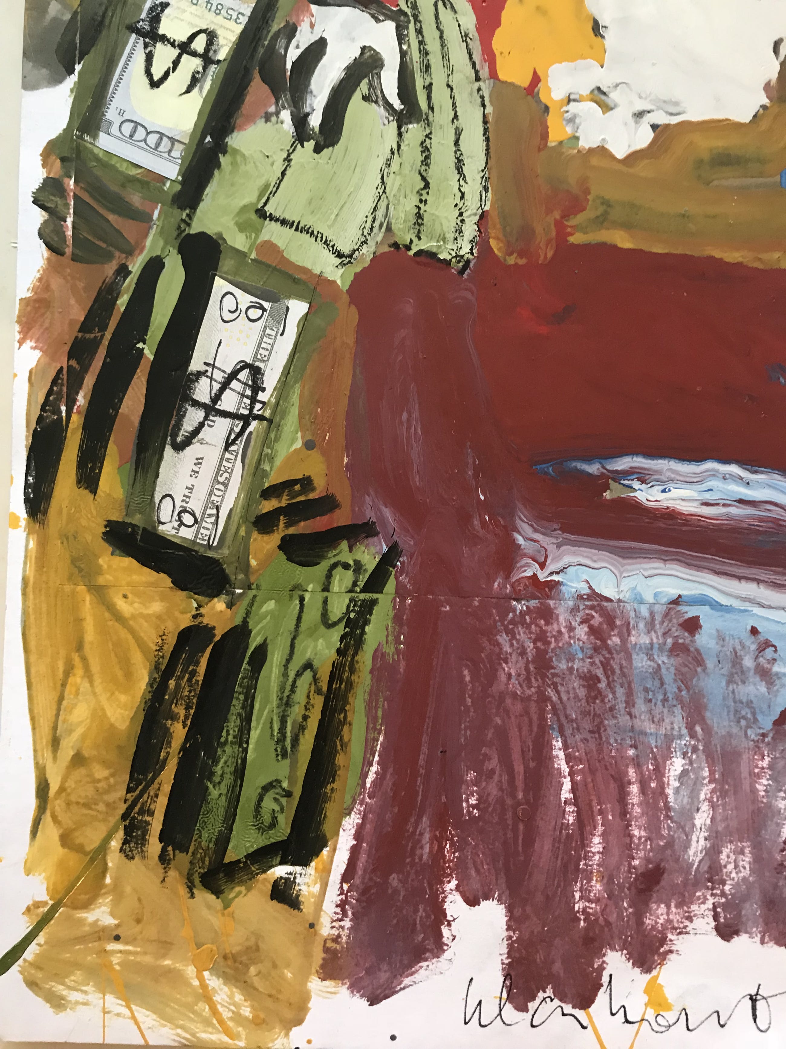 Origineel werk van Peter Klashorst uit serie Dagobert Duck waarop Dagobert zijn geld aan het tellen is, waaronder briefjes van $100. Deze (nep) briefjes van $100.- zijn dmv collage techniek in het werk verwerkt.