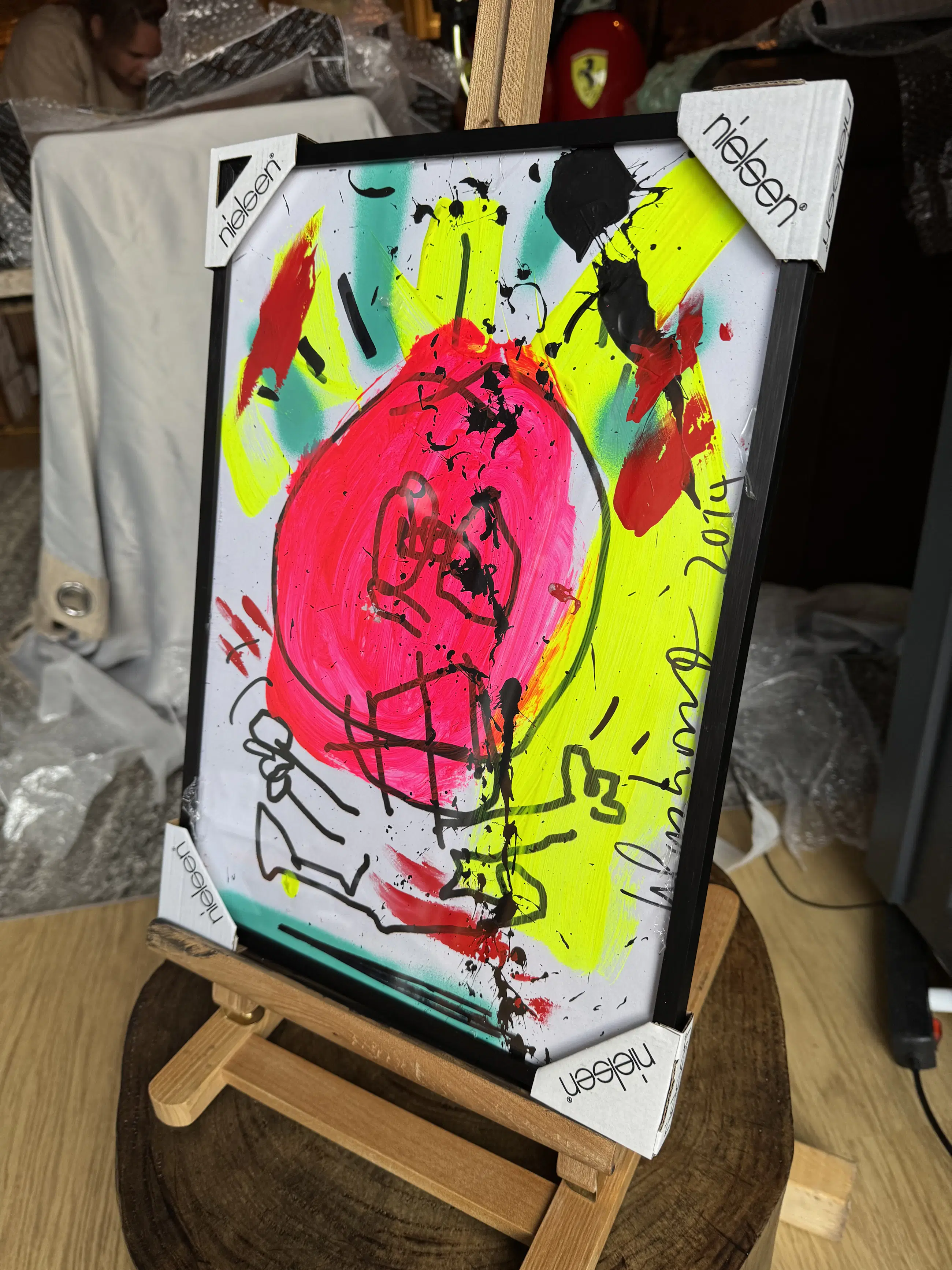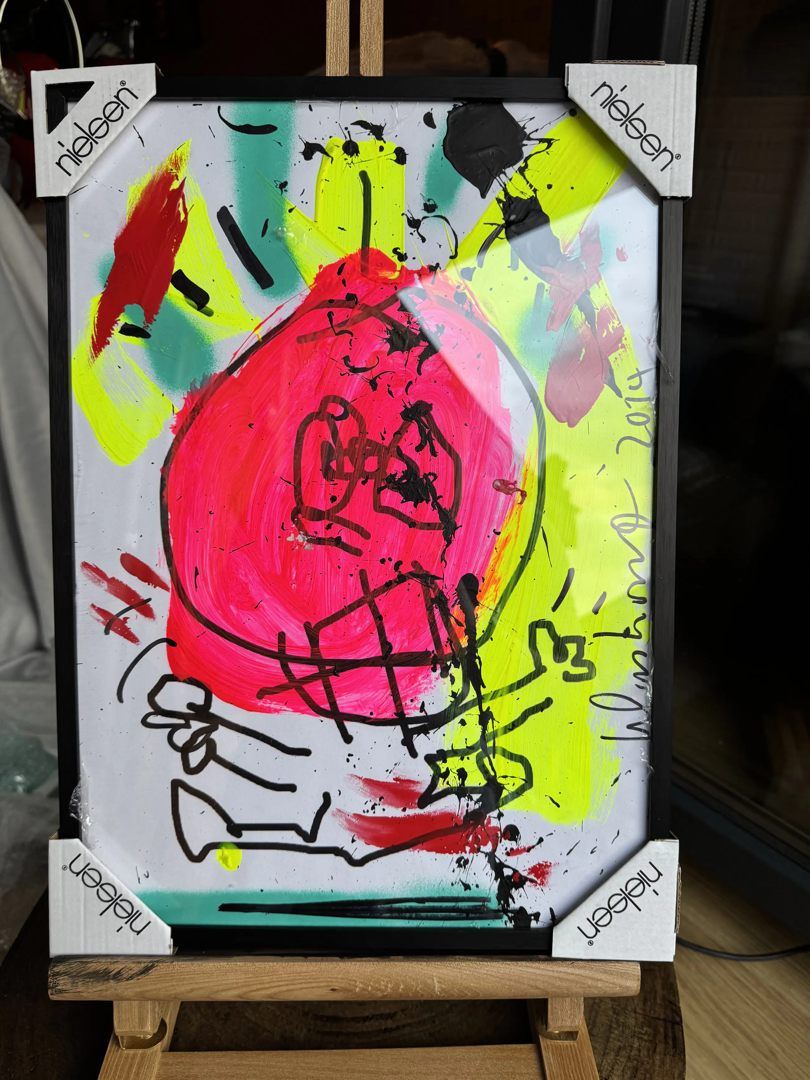 Het werk bevindt zich in uitstekende staat. Het werk zit goed in de omlijsting die overigens als nieuw is, zonder scheuren, gaatjes of vervormingen. De verflaag is stabiel, zonder craquelé, barsten of verkleuring. Signatuur en datering zijn duidelijk zichtbaar. Originele lijst aanwezig, met lichte sporen van hantering passend bij leeftijd. Highlights: Origineel werk uit de late periode van Klashorst Expressieve neonkleuren en dynamische penseelvoering Compact formaat, ideaal voor moderne interieurs In originele Nielsen‑lijst Gesigneerd en gedateerd (2019) | |||||||||||