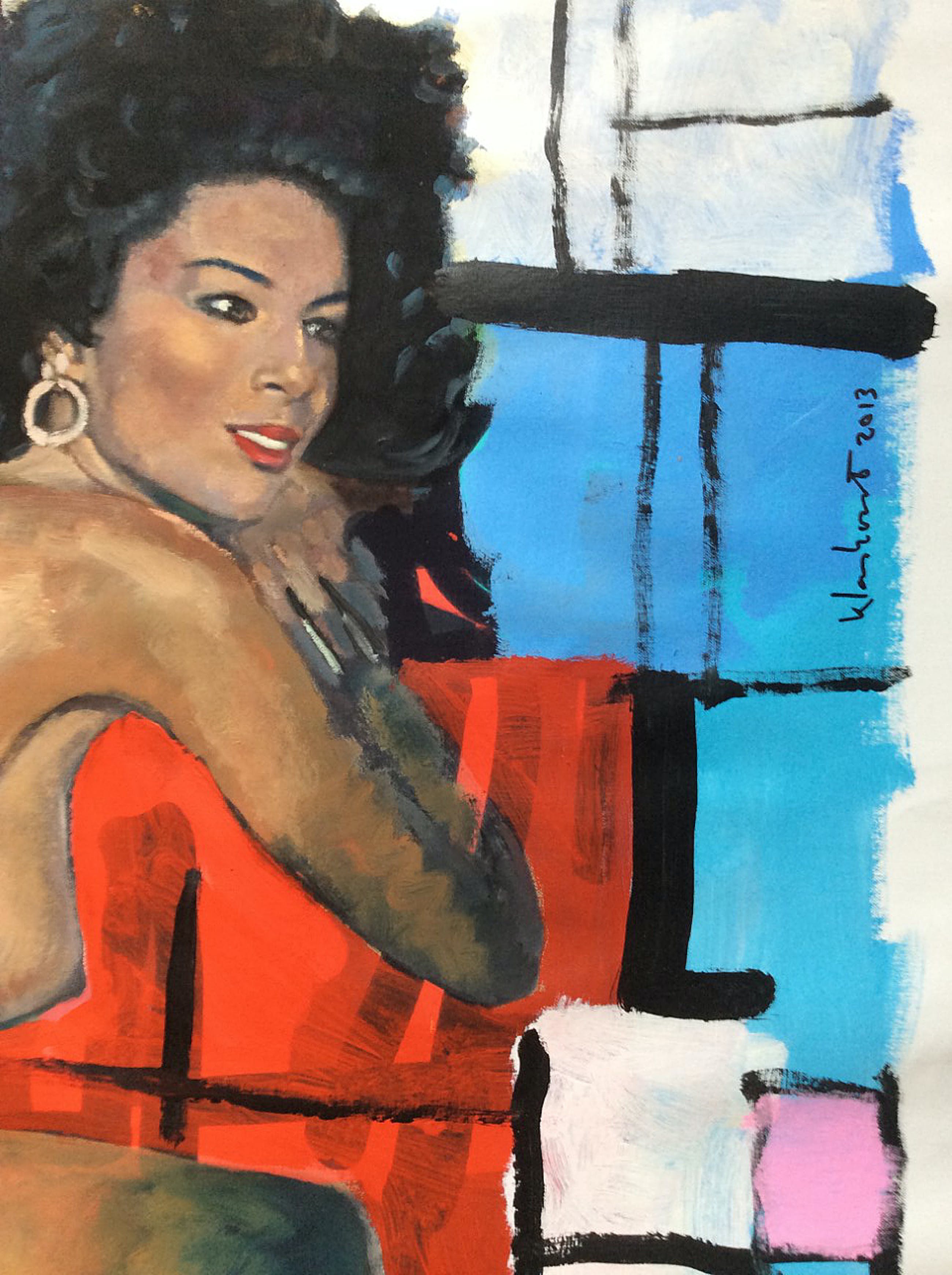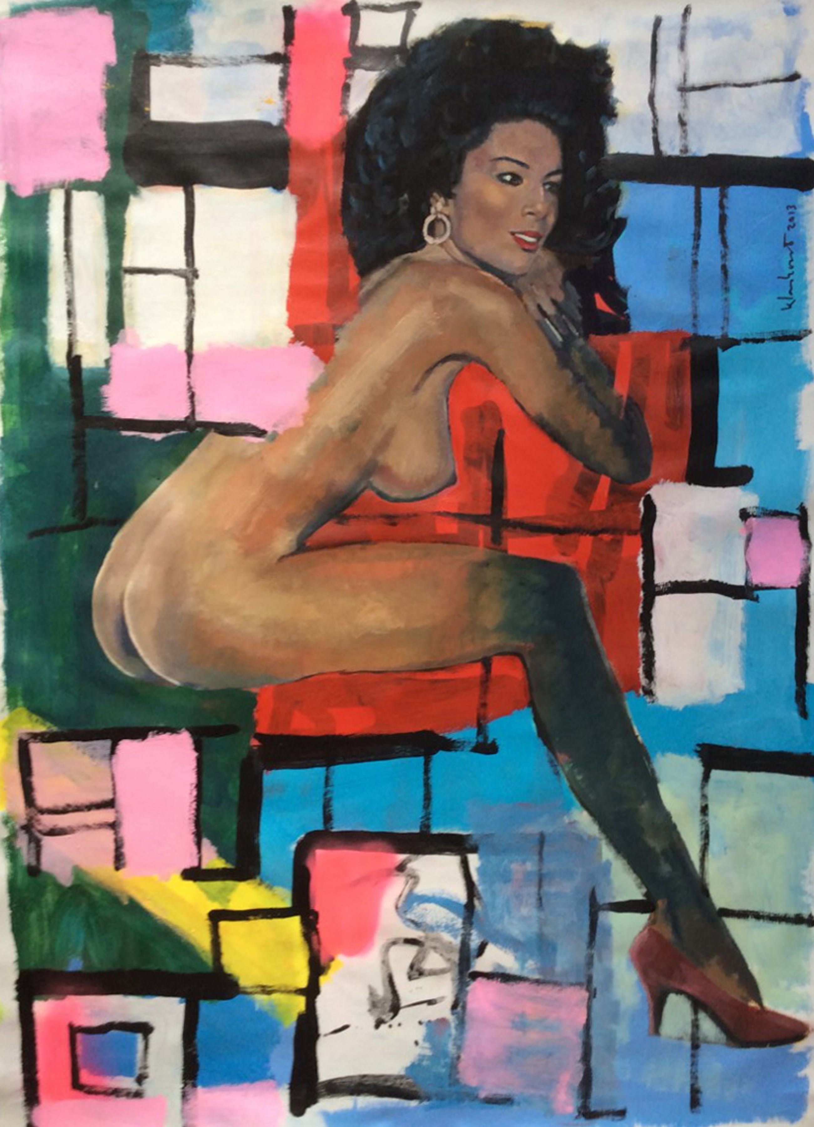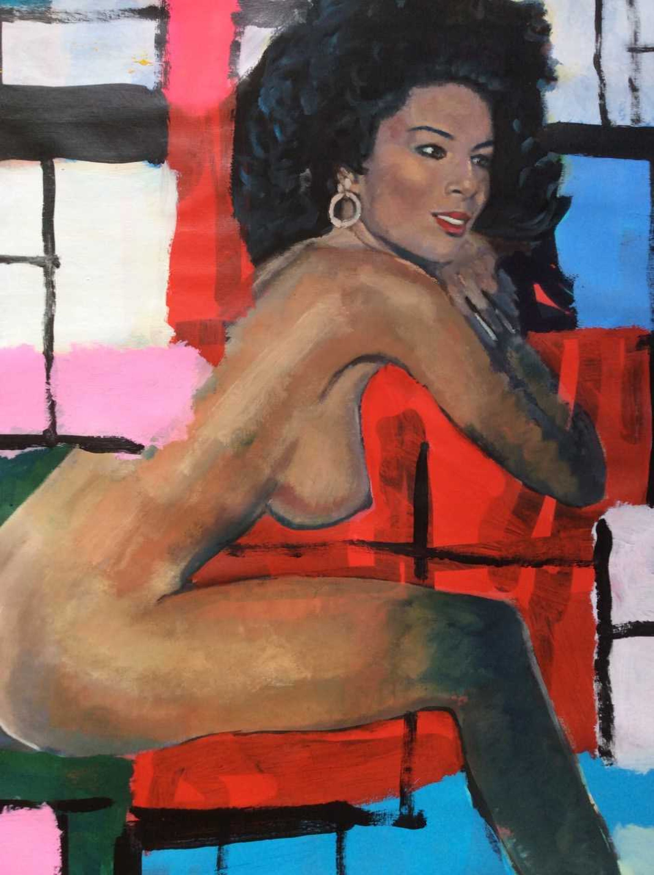 Kleurrijk naaktportret van Peter Klashorst, met vrije versie van 'De Stijl' kenmerken als achtergrond. Acryl geschilderd op ruim formaat linnen, formaat 87 x 120 cm. Gesigneerd "Klashorst" 2013.