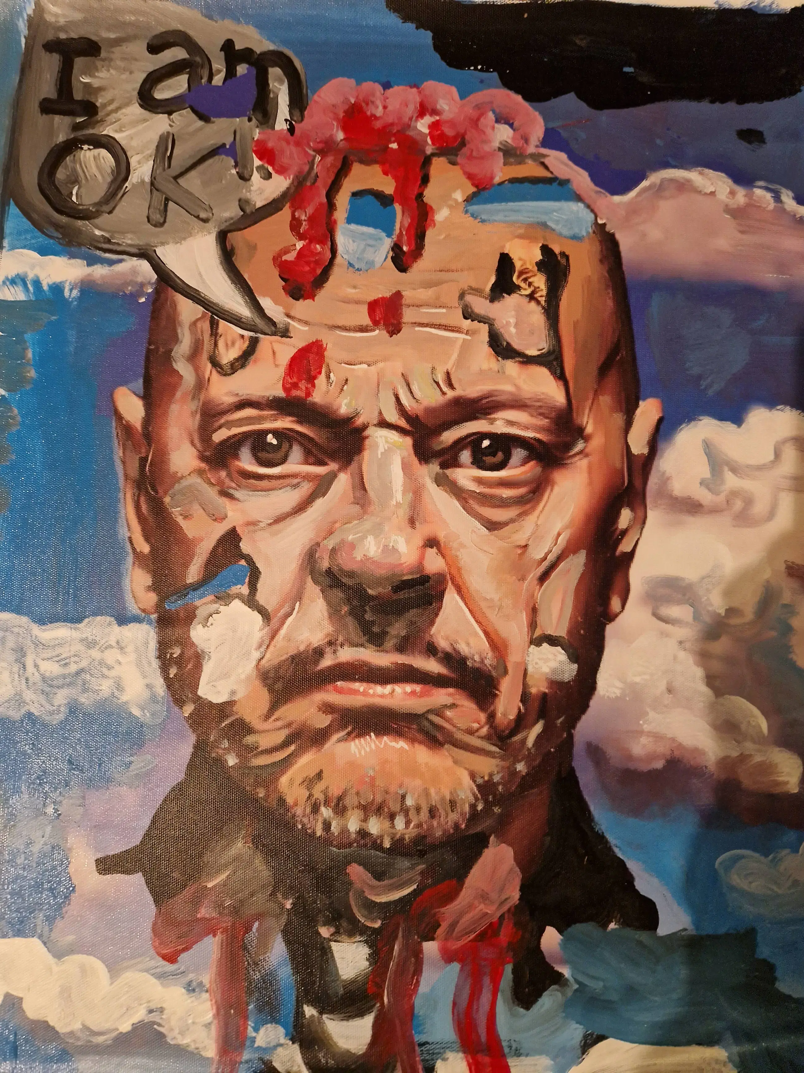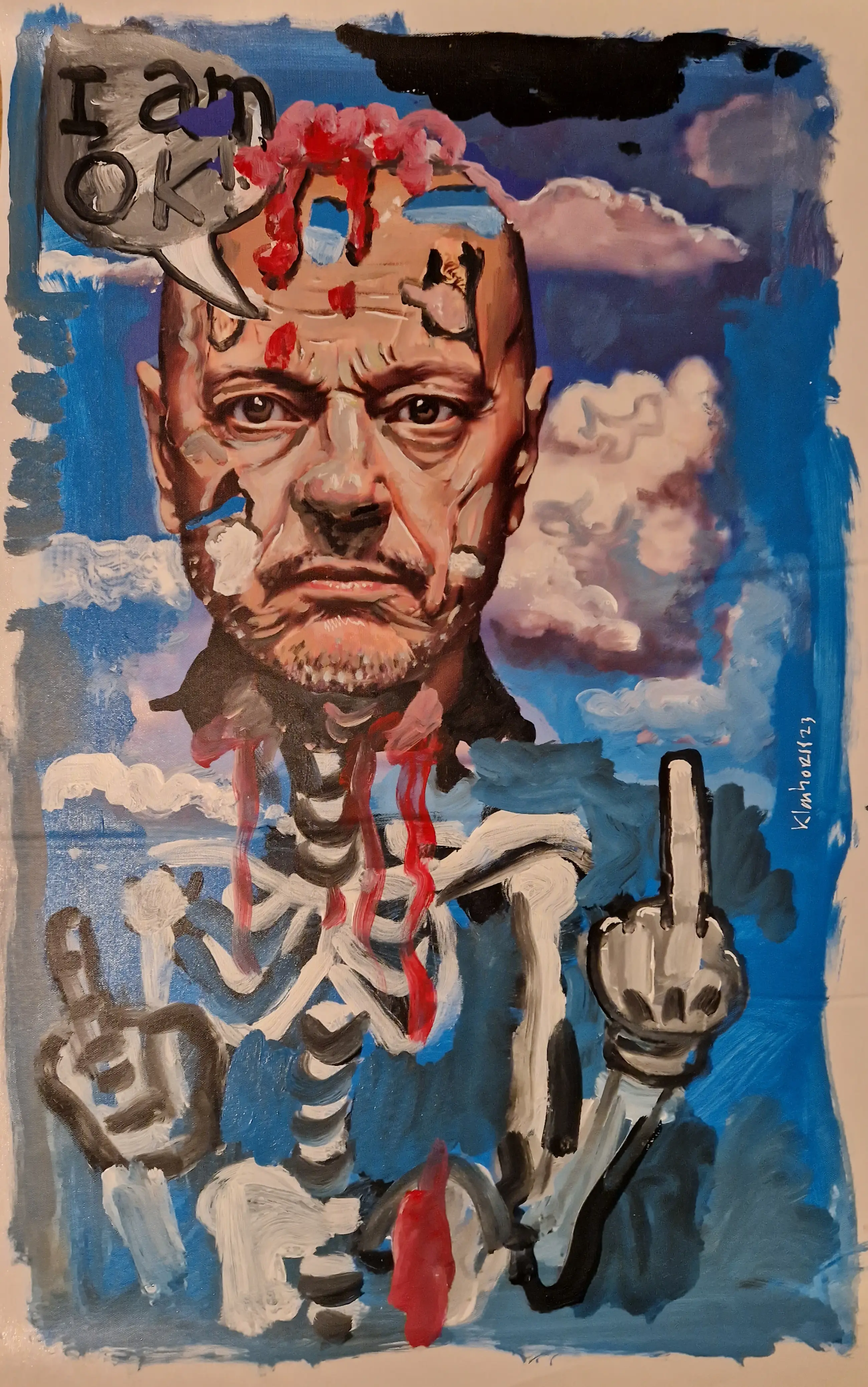 Prachtig gelijkend zelfportret van een van Nederlands meest beroemde en beruchtste kunstenaars Peter Klashorst. Peter schilderd vrijwel alleen nog maar op bisonyl maar dit werk is op canvas, nog zelf op te spannen.