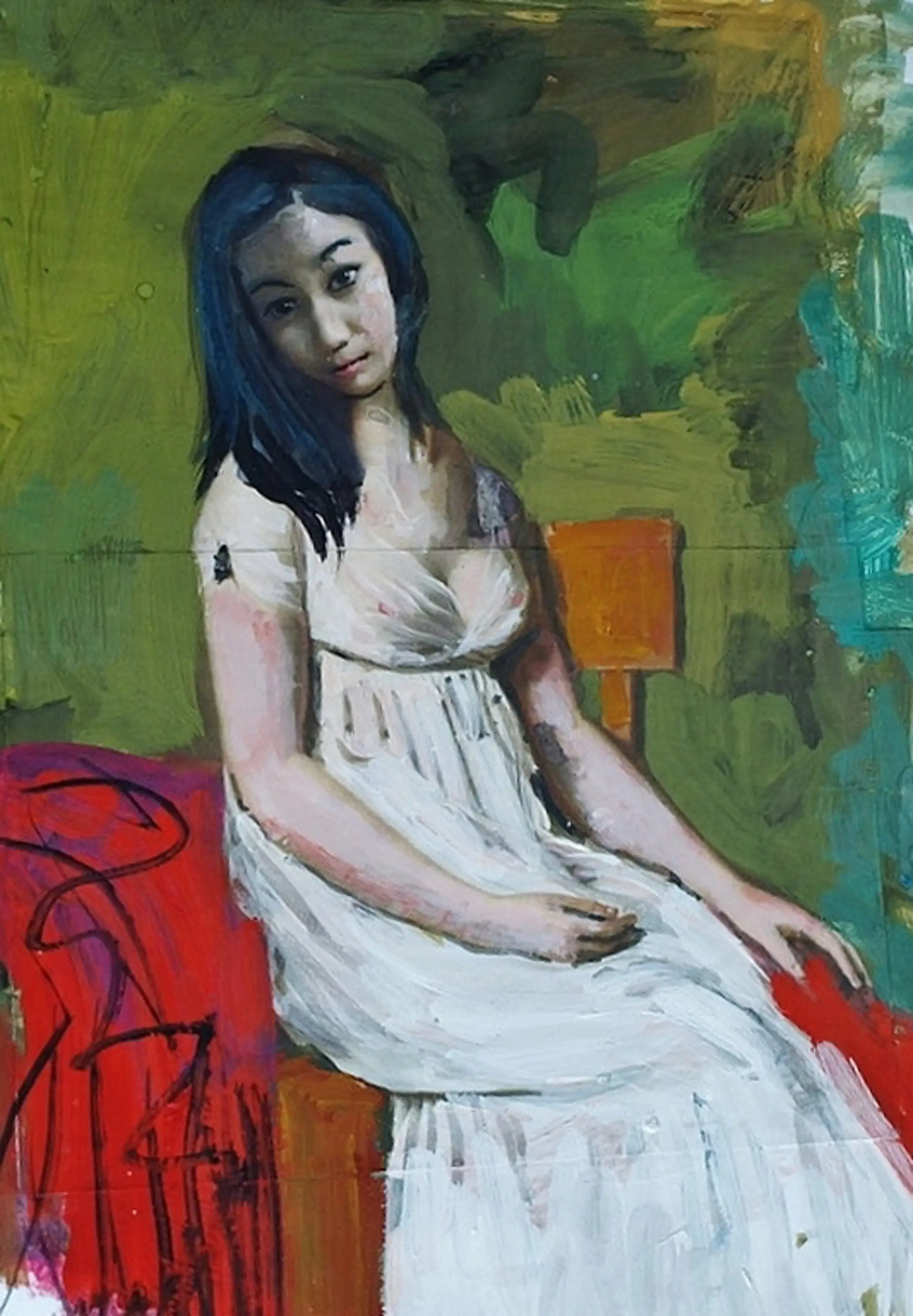 Peter Klashorst. Titel : Model sitting in bedroom. Techniek : Gemengde techniek op stevig papier. Peter heeft vellen papier aan elkaar gemaakt om een groter werk te kunnen maken. Mooi formaat : 53,7 x 37,5 cm. Handgesigneerd en gedateerd : Peter Klashorst 2016.