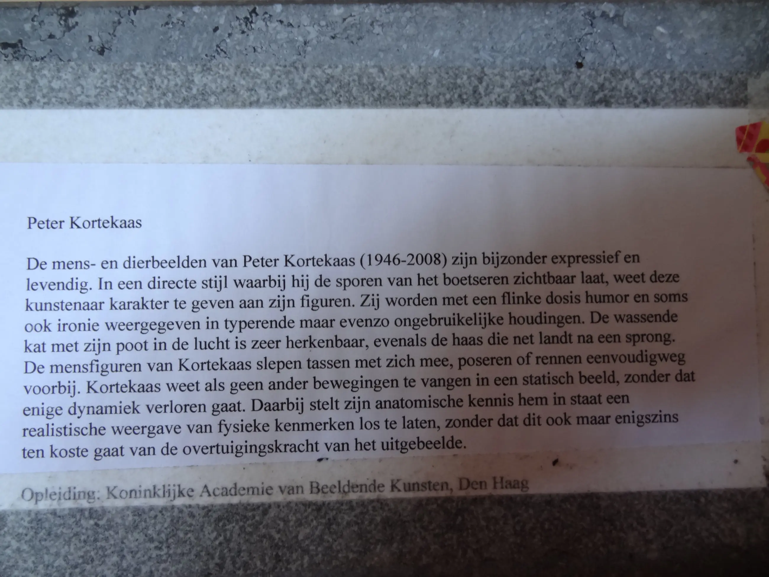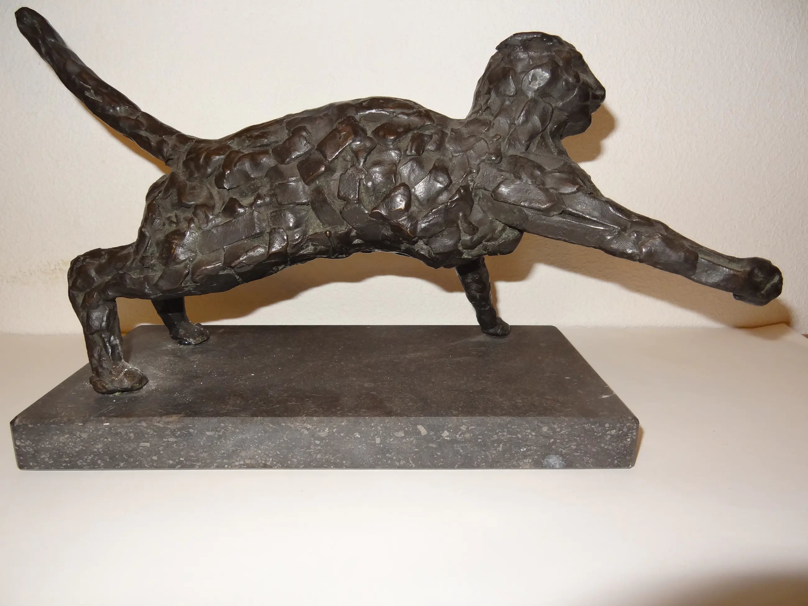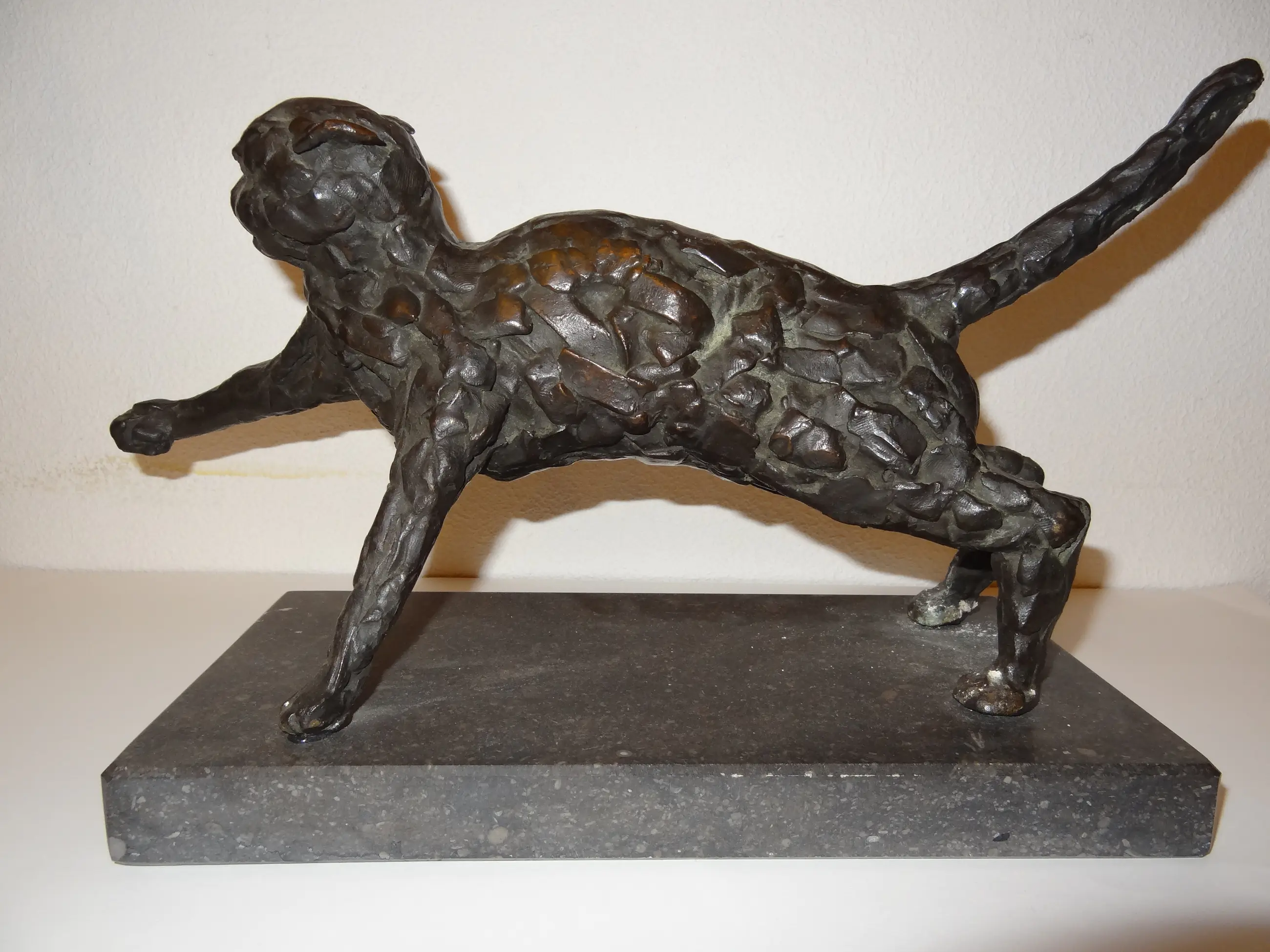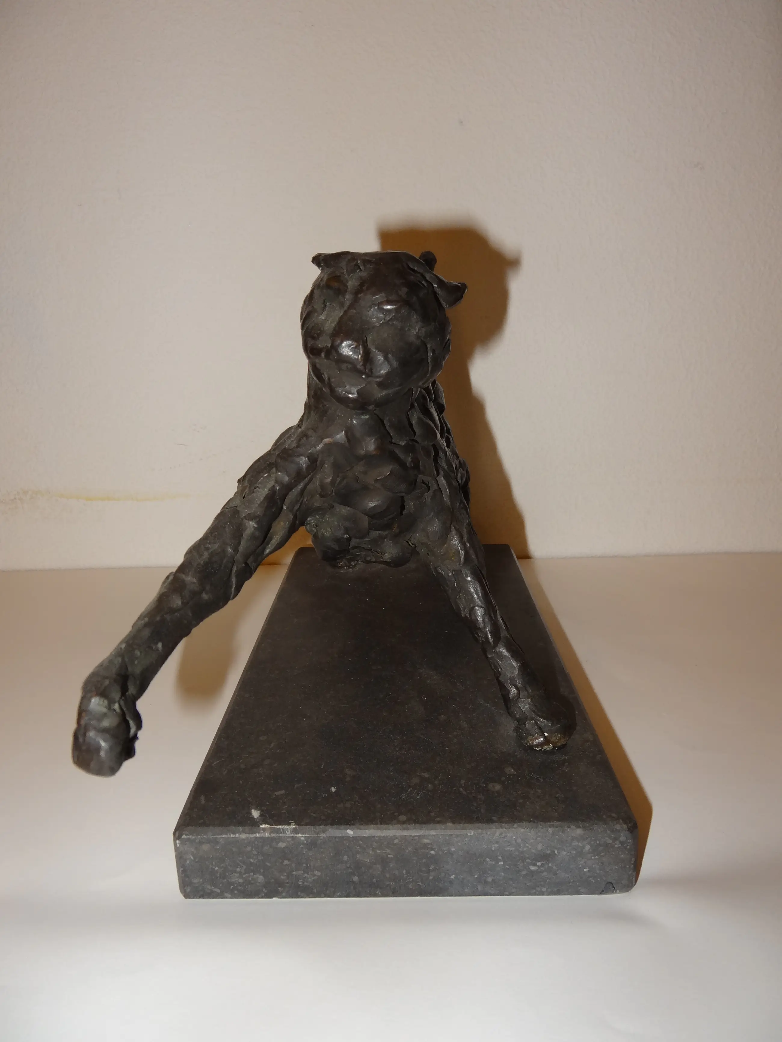 Dit is een mooi, zwaar, bronzen beeld. Het is onbeschadigd. Onder het voetstuk is een beschrijving van de kunstenaar.