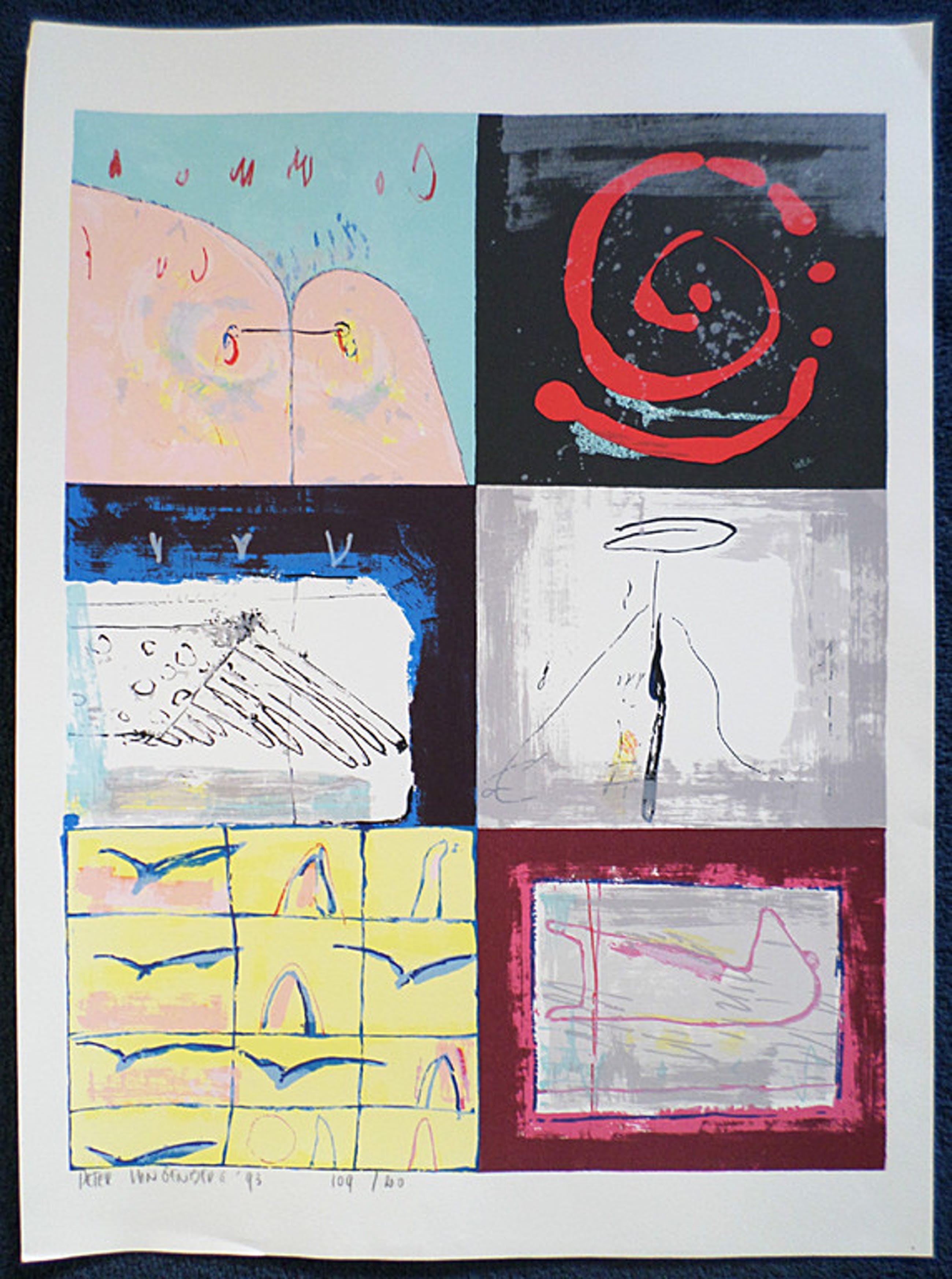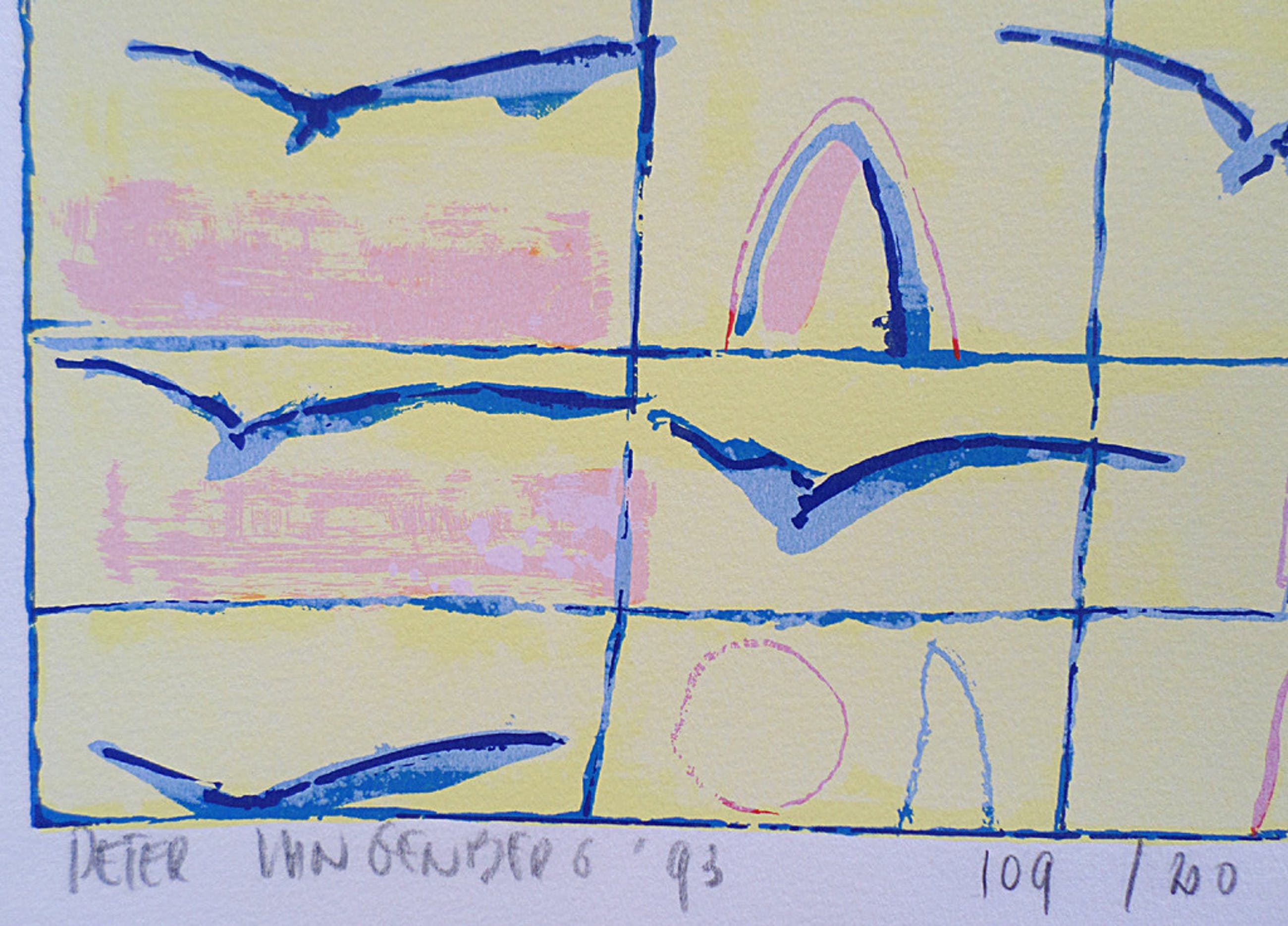 Mooie zeefdruk van Peter Langenberg uit 1993. Handgesigneerd, gedateerd en genummerd. Dit is nummer 109 uit een oplage van 200 stuks. In zeer goede conditie, nooit ingelijst geweest.