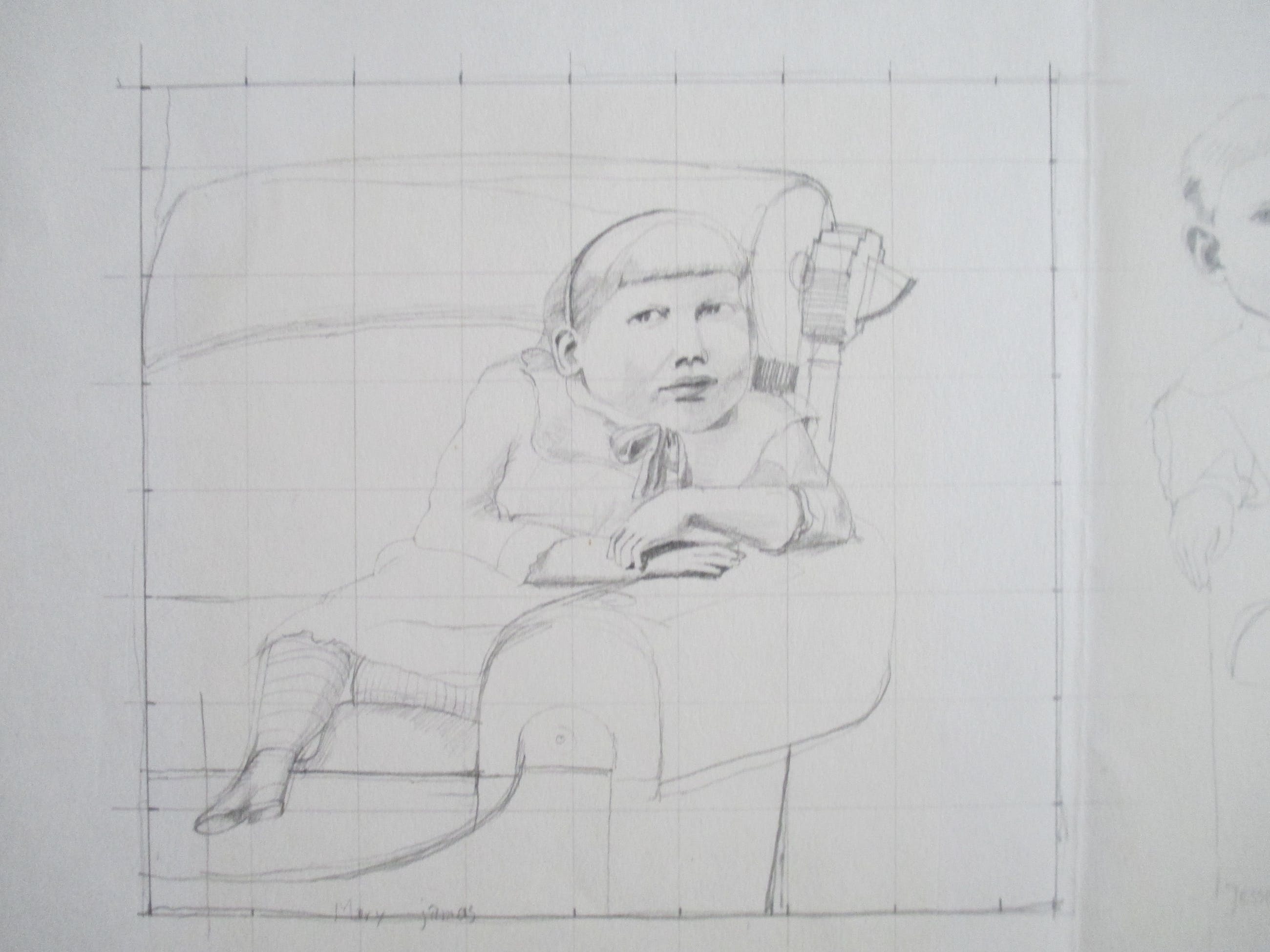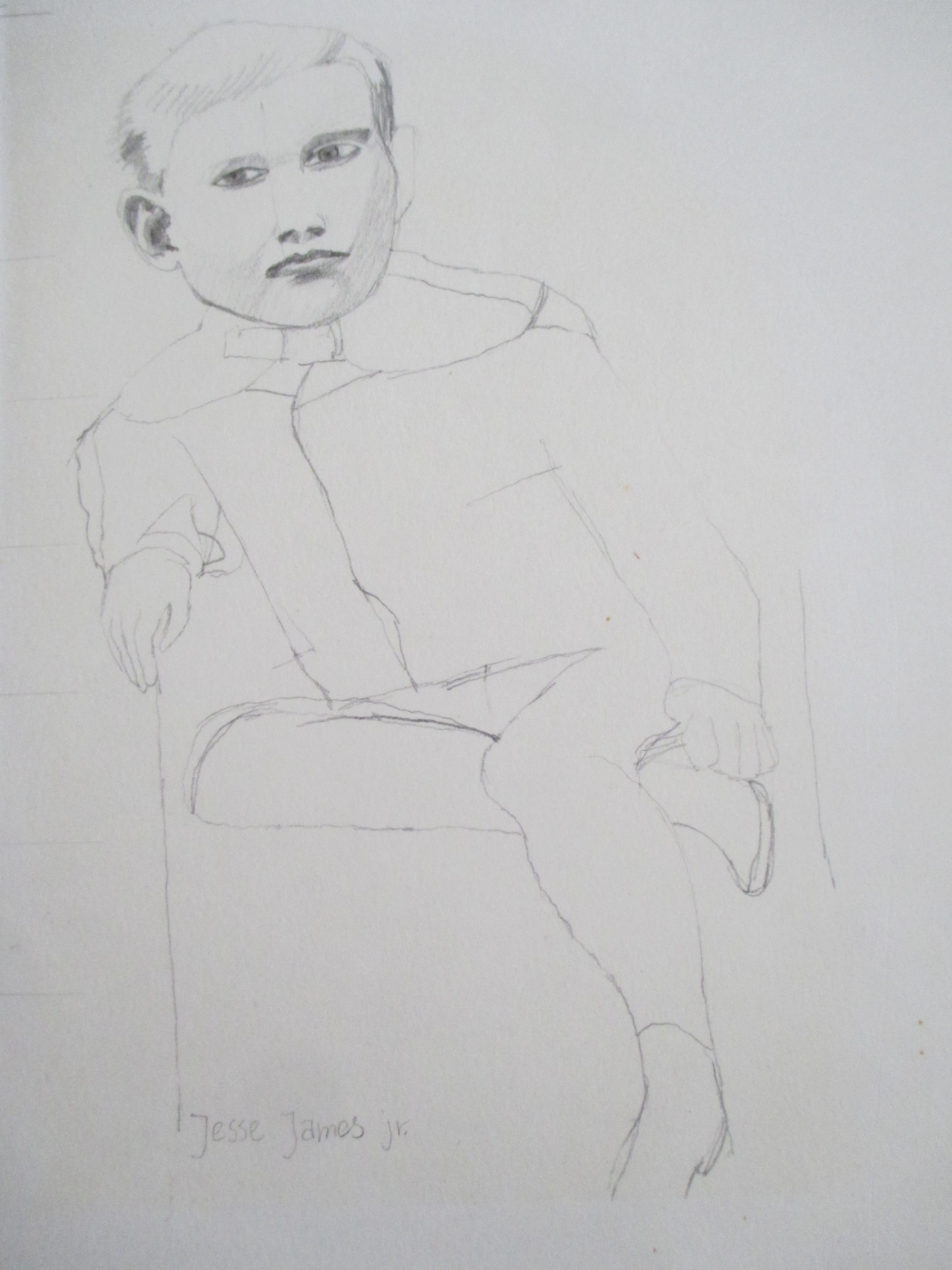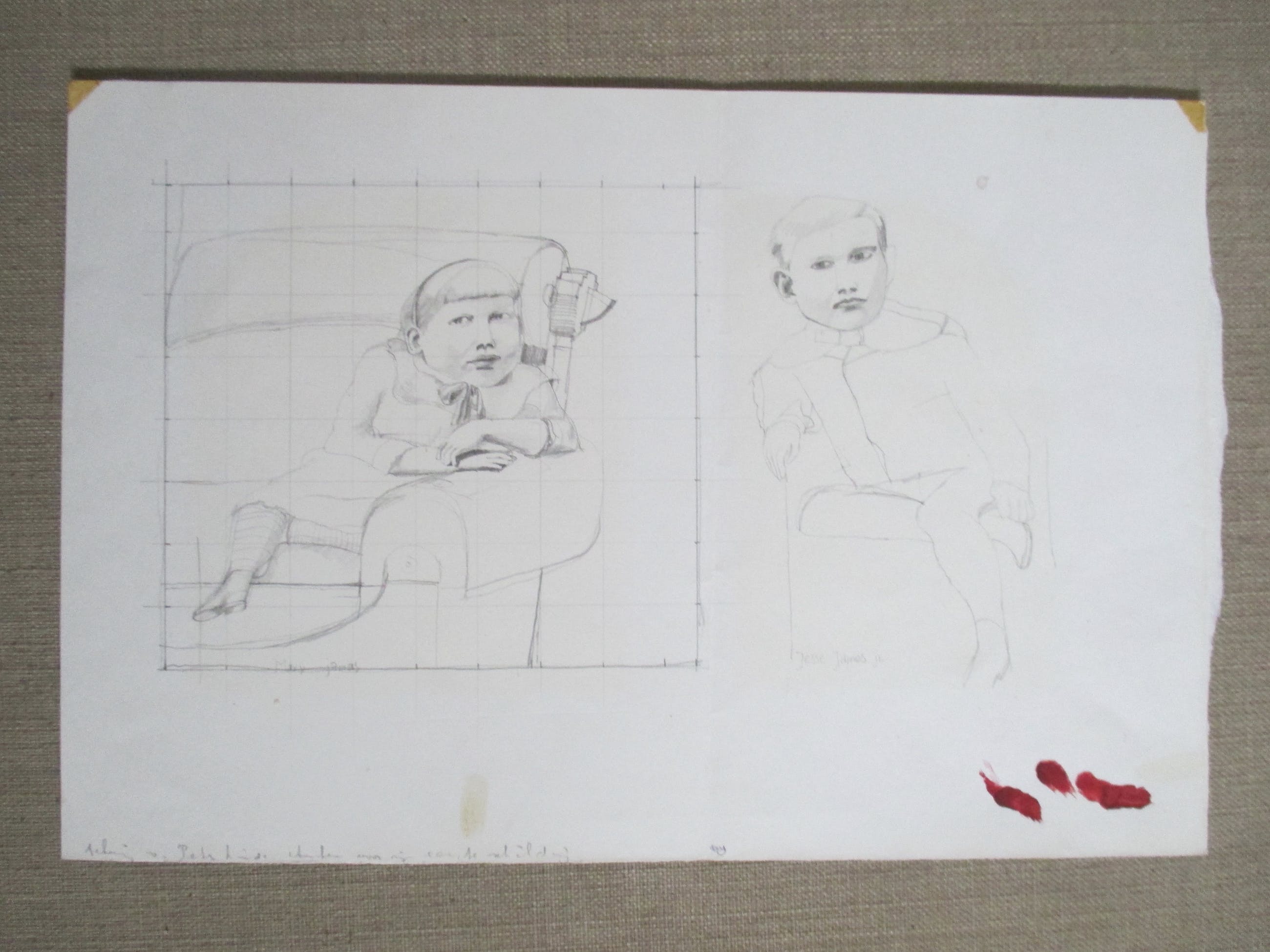 Twee tekeningen op 1 blad van Peter Linde, portretten van Mary James en Jesse James Junior. Eronder staat tekening van Peter Linde, studie voor mijn eerste schilderij. Verzending tussen twee plaatjes, 8 euro, aangetekend 9,65
